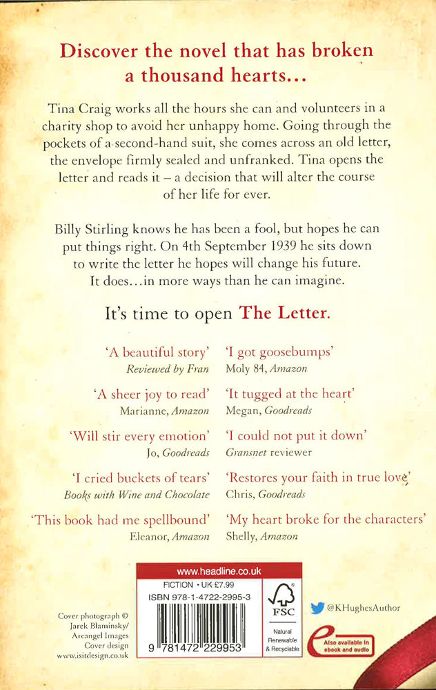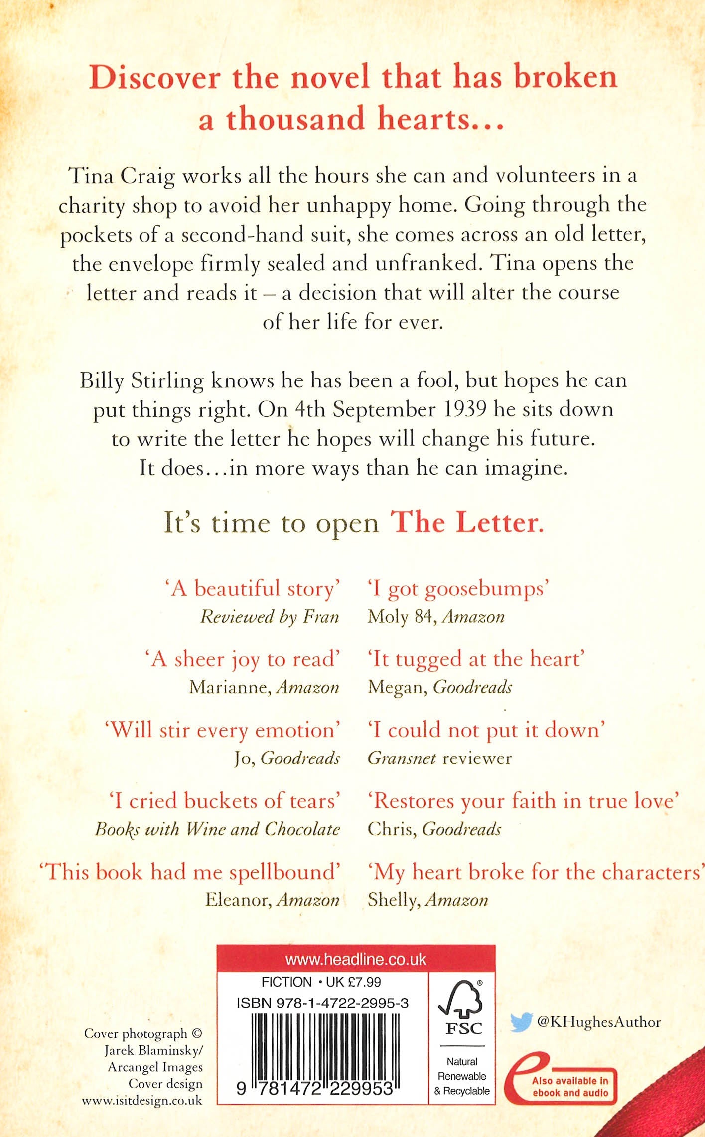 Every so often a love story comes along to remind us that sometimes, in our darkest hour, hope shines a candle to light our way. Discover THE LETTER by Kathryn Hughes, the Number One bestseller that has captured thousands of hearts worldwide. Perfect for fans of The Notebook by Nicholas Sparks. 'A wonderful, uplifting story' Lesley PearseJoin the hundreds of thousands of readers worldwide who have fallen in love with THE LETTER:'An amazing, heartwrenching, unforgettable story''This beautiful story will bring tears and joy''Loved this story !! It kept me totally gripped although I was sobbing in places as well''A tale of love and hope with lots of twists and turns. A great story!'Tina Craig longs to escape her violent husband. She works all the hours God sends to save up enough money to leave him, also volunteering in a charity shop to avoid her unhappy home. Whilst going through the pockets of a second-hand suit, she comes across an old letter, the envelope firmly sealed and unfranked. Tina opens the letter and reads it - a decision that will alter the course of her life for ever...Billy Stirling knows he has been a fool, but hopes he can put things right. On 4th September 1939 he sits down to write the letter he hopes will change his future. It does - in more ways than he can ever imagine...THE LETTER tells the story of two women, born decades apart, whose paths are destined to cross and how one woman's devastation leads to the other's salvation.