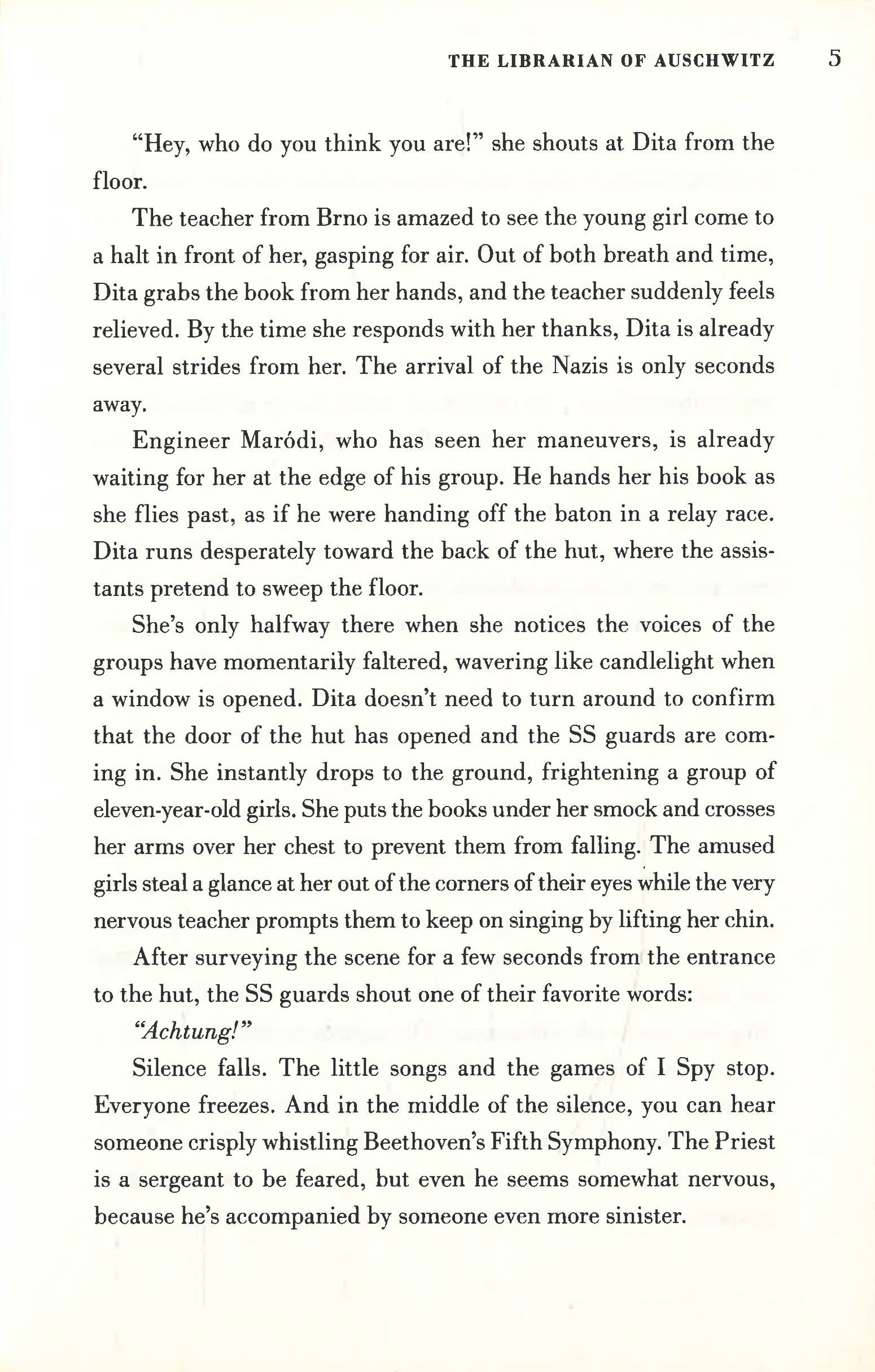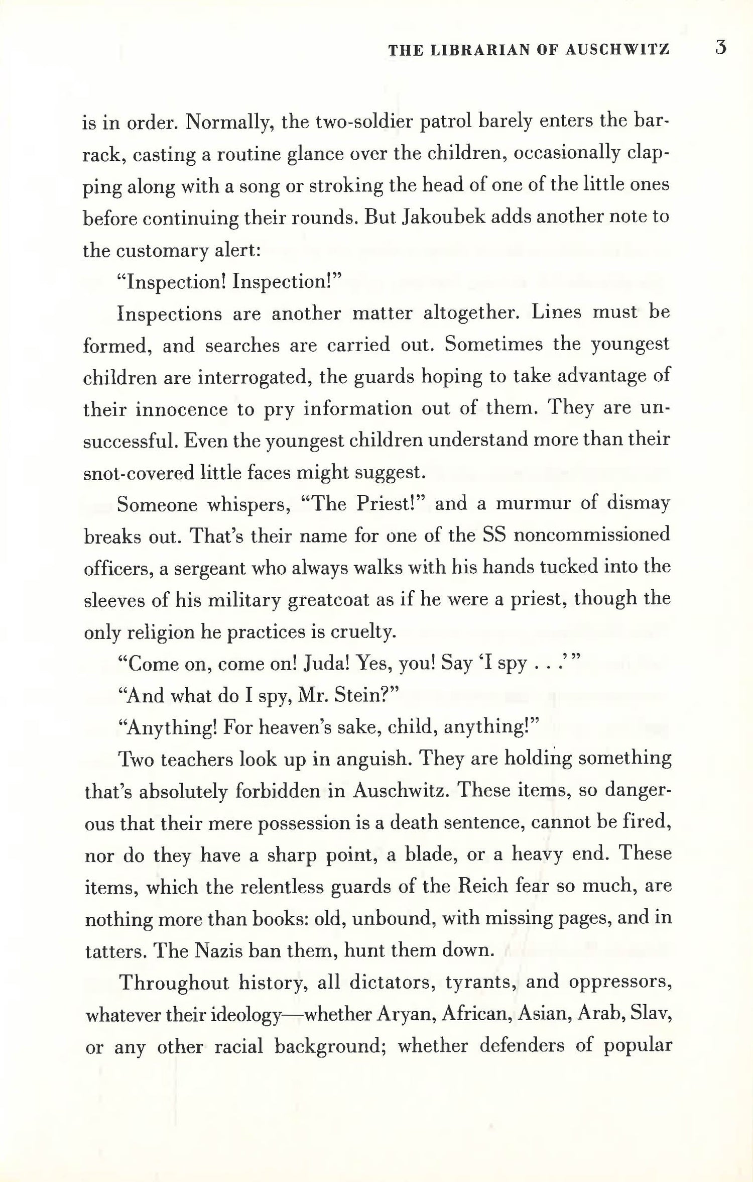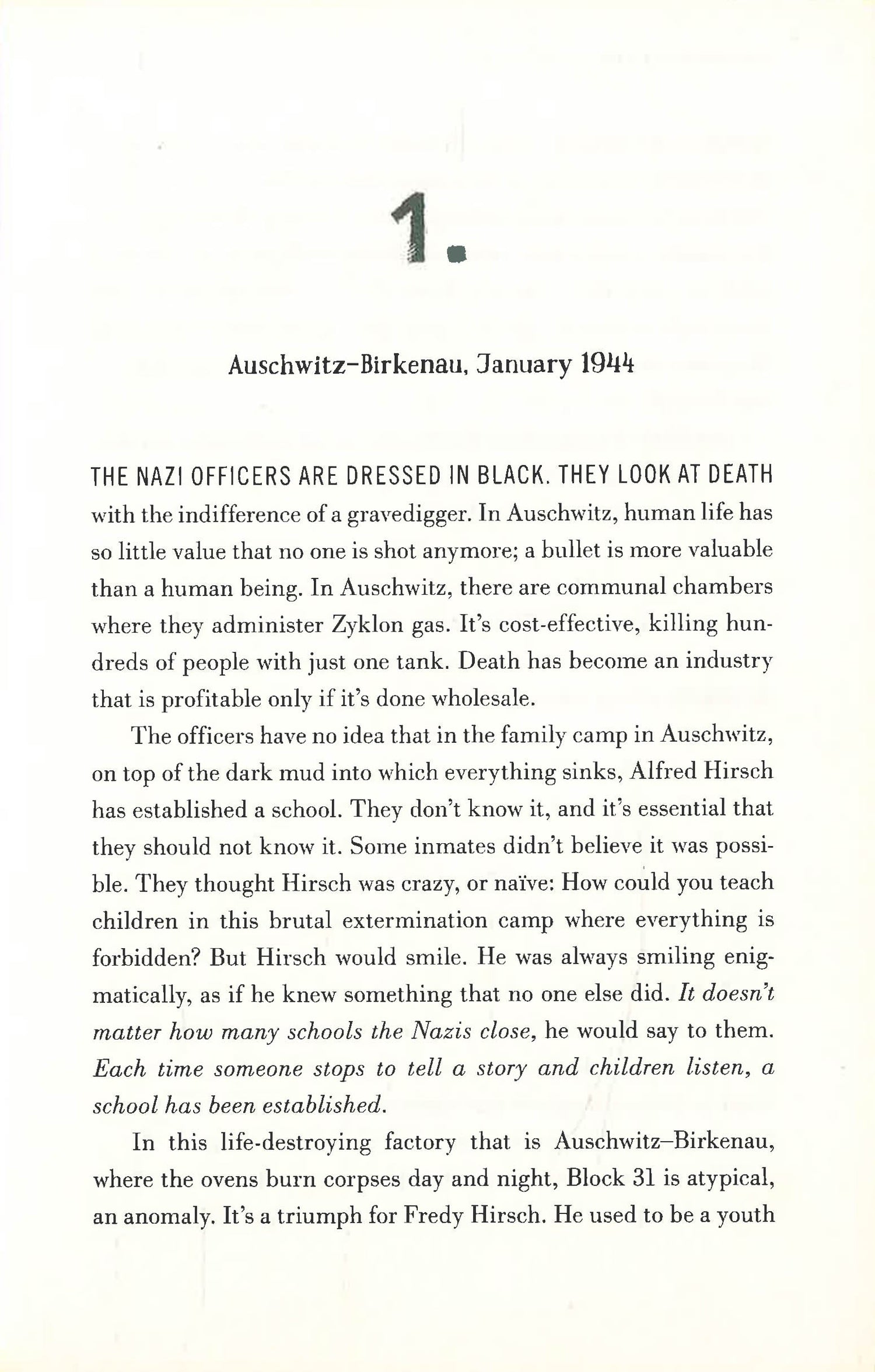 Fourteen-year-old Dita is one of the many imprisoned by the Nazis at Auschwitz. Taken, along with her mother and father, from the Terezín ghetto in Prague, Dita is adjusting to the constant terror that is life in the camp. When Jewish leader Freddy Hirsch asks Dita to take charge of the eight precious volumes the prisoners have managed to sneak past the guards, she agrees. And so Dita becomes the librarian of Auschwitz.