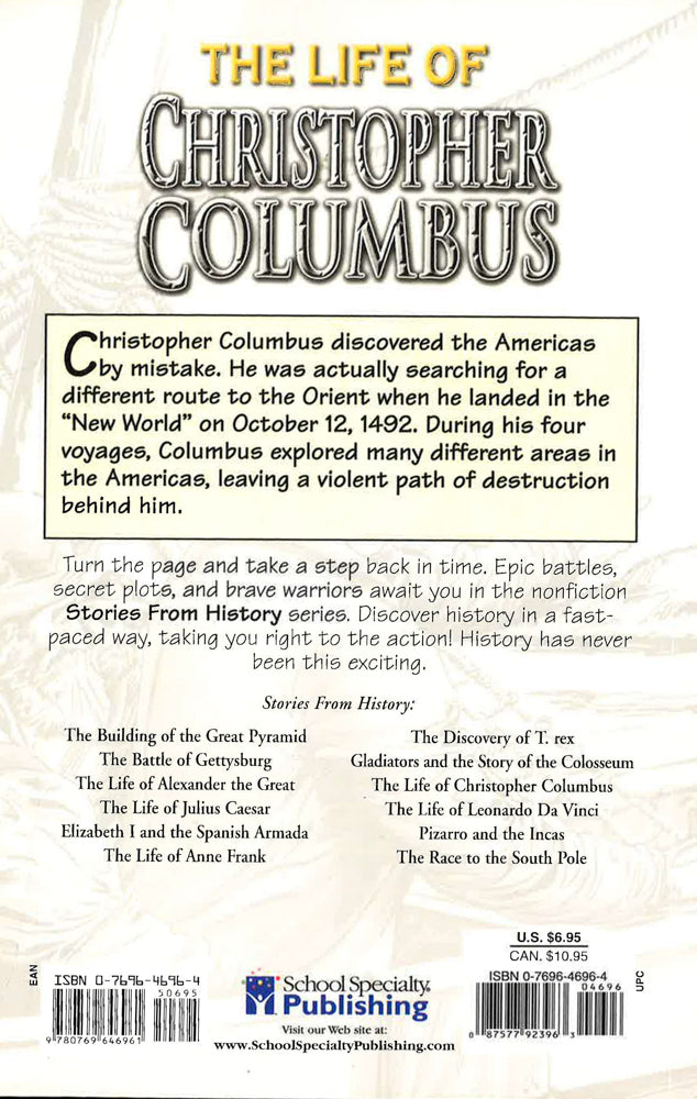 Christopher Columbus discovered the America's by mistake. Actually searching for a different route to the Orient, he landed in the New World on October 12, 1492. During his four voyages, Columbus explored many different areas in the Americas, leaving a violent path of destruction behind him. The Life of Christopher Columbus is sure to capture any reader's attention and turn even the most casual reader into a history buff!