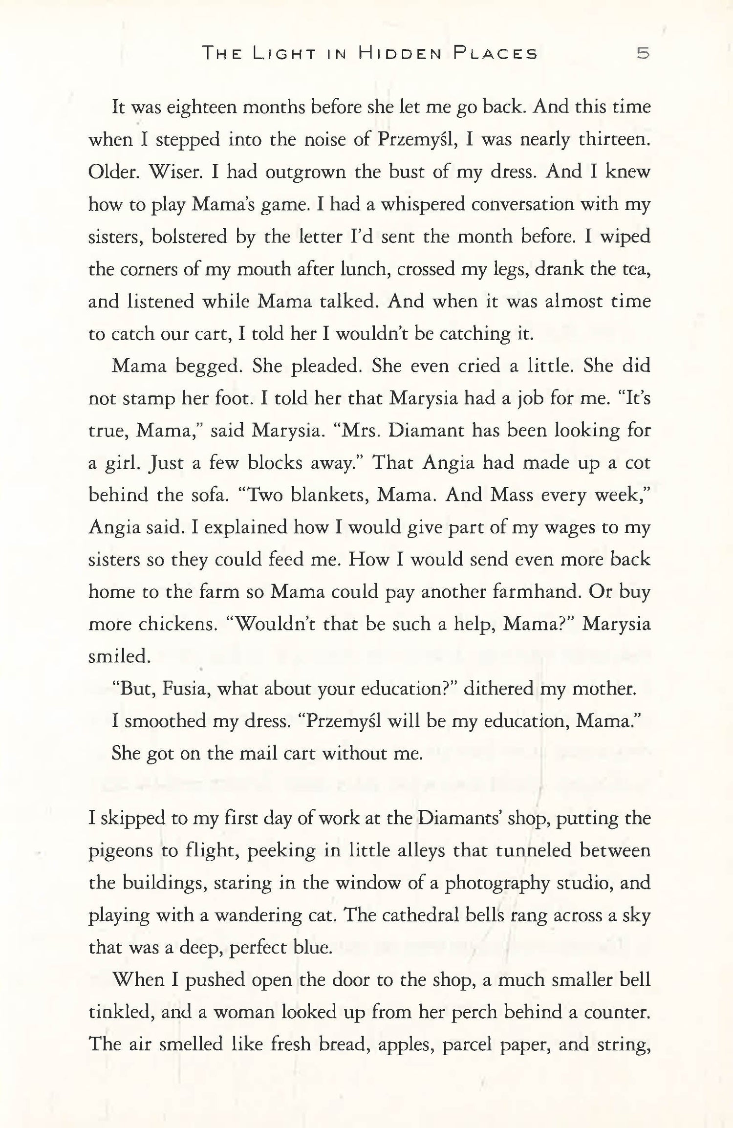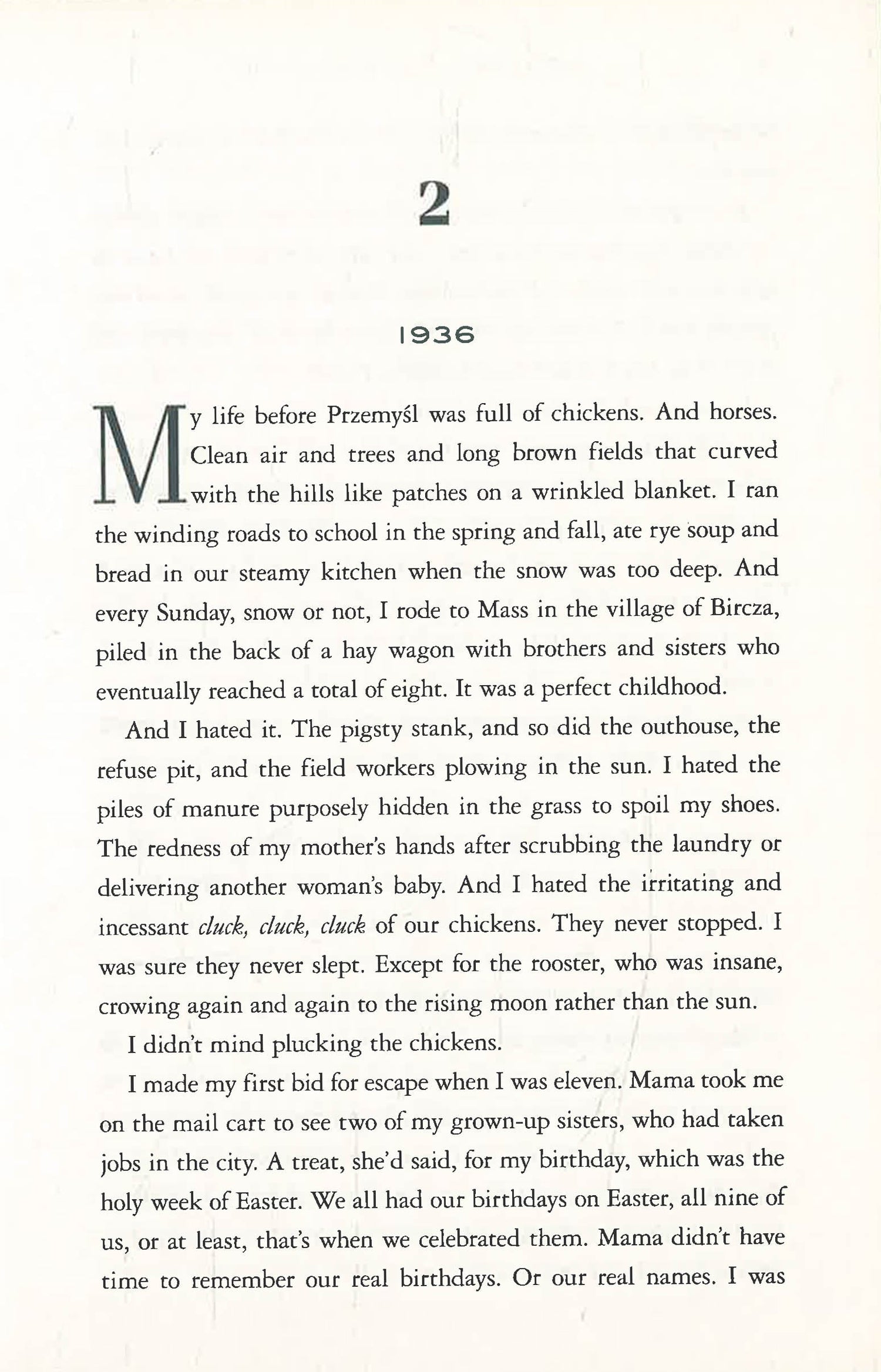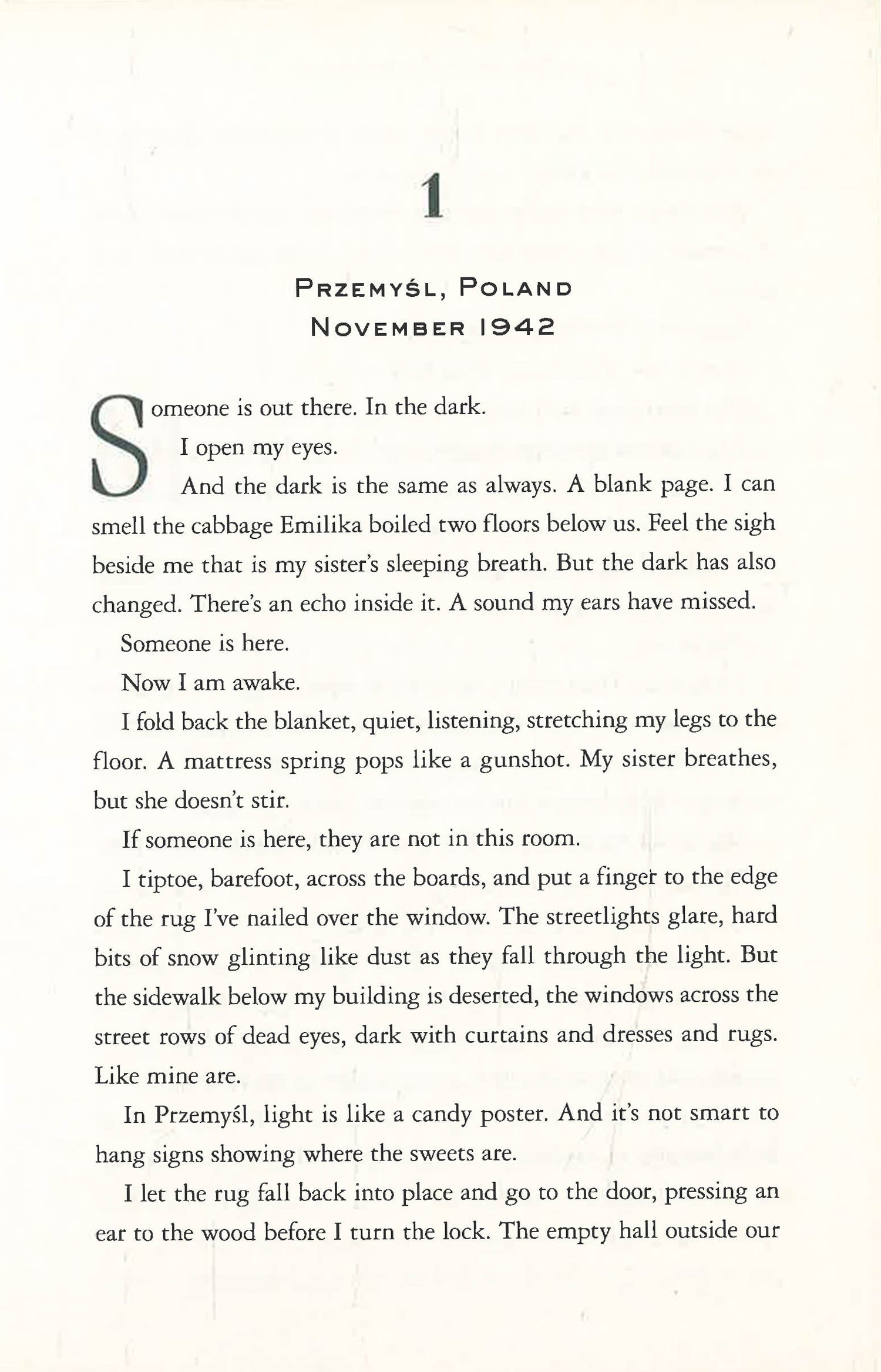 It is 1943, and for four years, sixteen-year-old Stefania has been working for the Diamant family in their grocery store in Przemysl, Poland, singing her way into their lives and hearts. She has even made a promise to one of their sons, Izio -- a betrothal they must keep secret since she is Catholic and the Diamants are Jewish.
