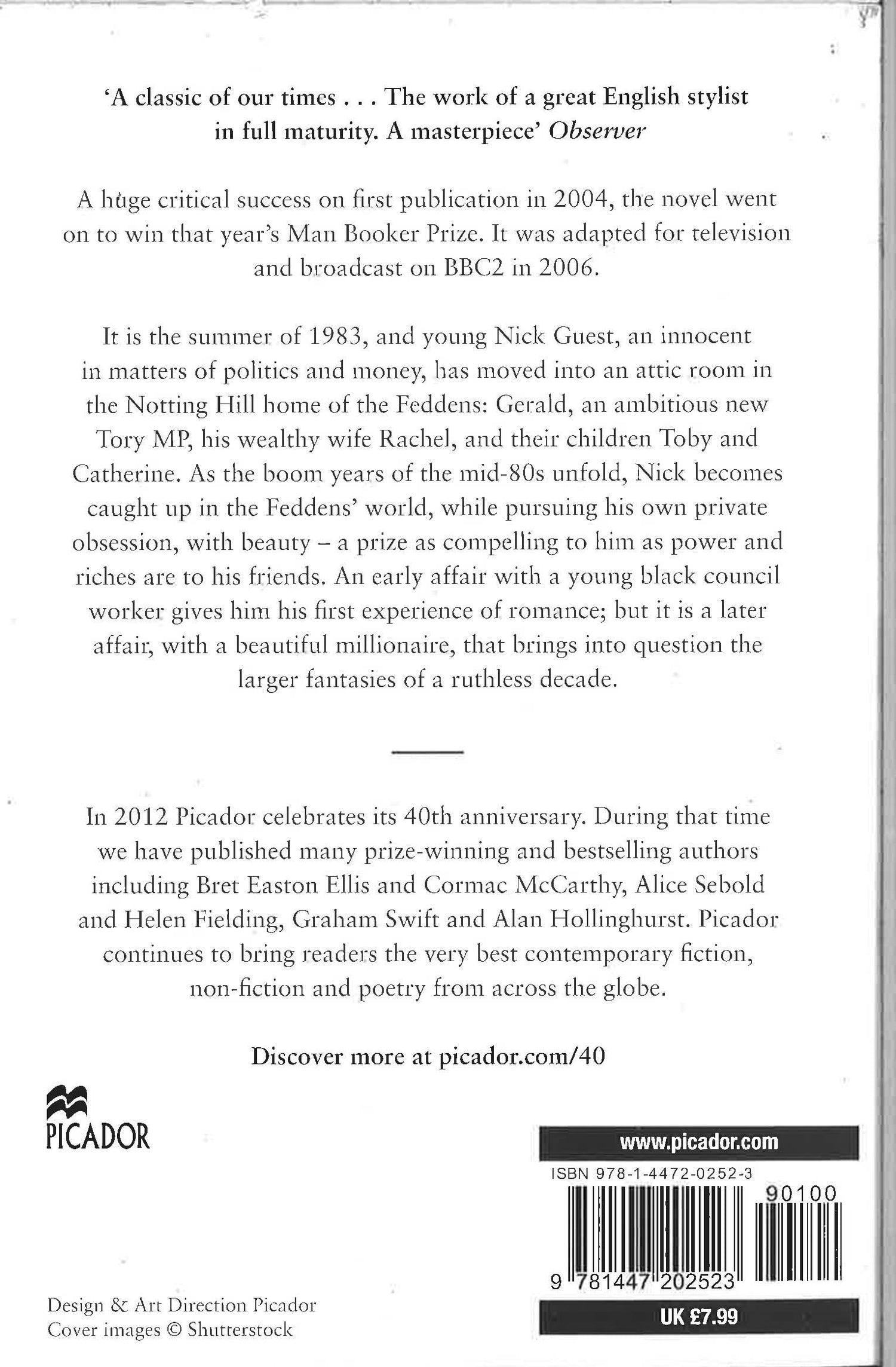 It is the summer of 1983, and young Nick Guest, an innocent in the matters of politics and money, has moved into an attic room in the Notting Hill home of the Feddens: Gerald, an ambitious new Tory MP, his wealthy wife Rachel, and their children Toby and Catherine. As the boom years of the mid-80s unfold, Nick becomes caught up in the Feddens' world, while pursuing his own private obsession, with beauty - a prize as compelling to him as power and riches are to his friends.