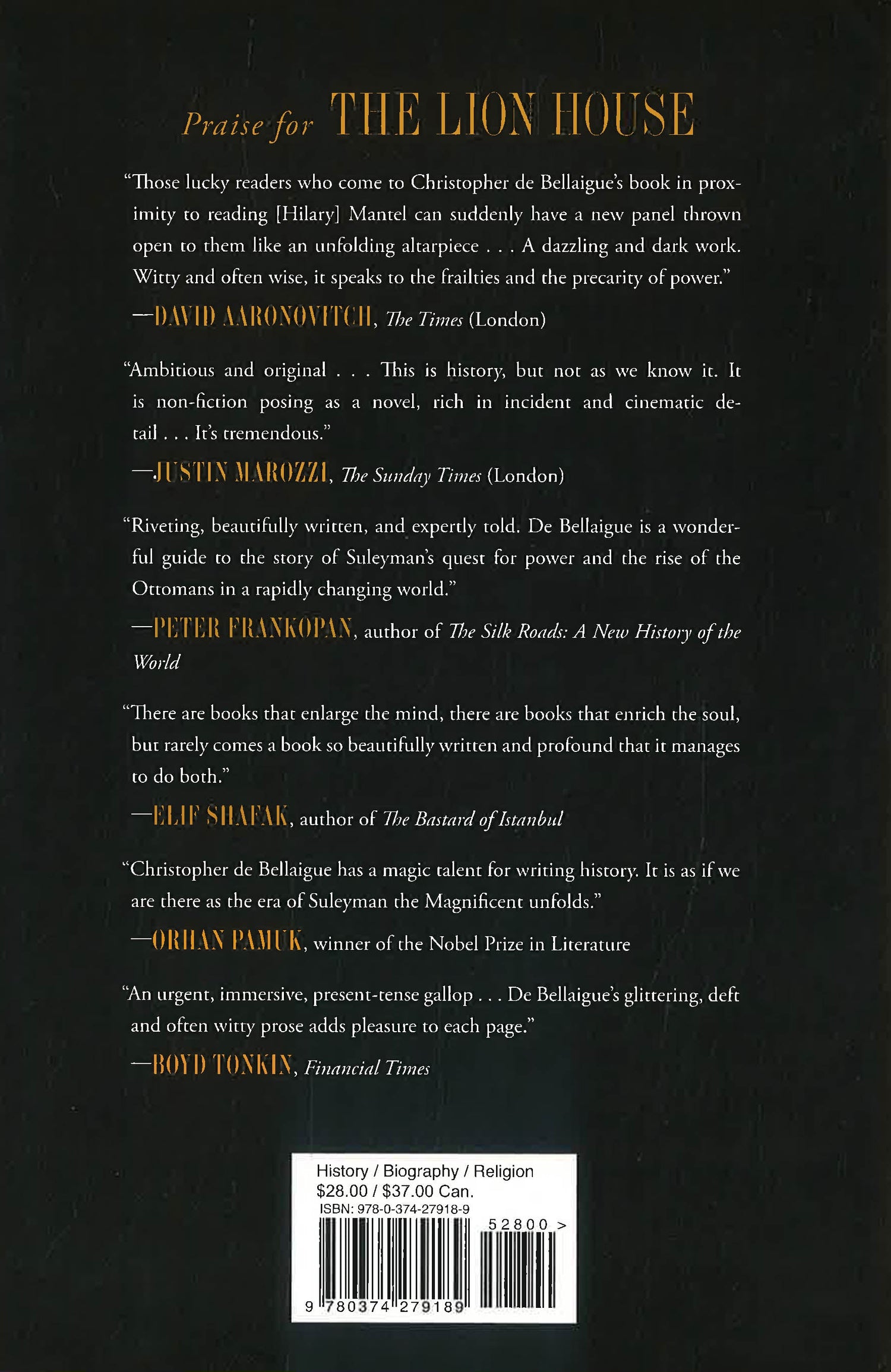 Narrated through the eyes of the intimates of Suleyman the Magnificent, the sixteenth-century sultan of the Ottoman Empire, The Lion House animates with stunning immediacy the fears and stratagems of those brought into orbit around him: the Greek slave who becomes his Grand Vizier, the Venetian jewel dealer who acts as his go-between, the Russian consort who becomes his most beloved wife.