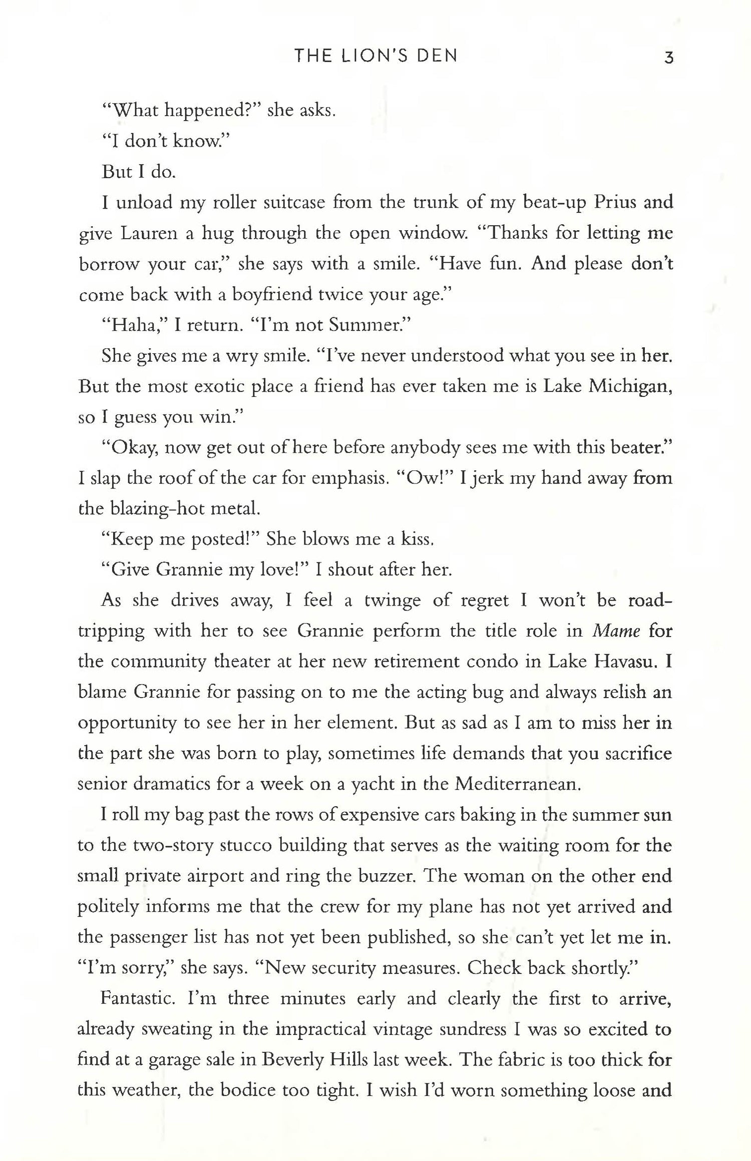 Belle likes to think herself immune to the dizzying effects of fabulous wealth. But when her best friend, Summer, invites her on a glamorous getaway to the Mediterranean aboard her billionaire boyfriend's yacht, the only sensible answer is yes. Belle hopes the trip will be a much-needed break from her stalled acting career and uniquely humiliating waitressing job, but once she's aboard the luxurious Lion's Den, it soon becomes clear this jet-setting holiday is not as advertised.