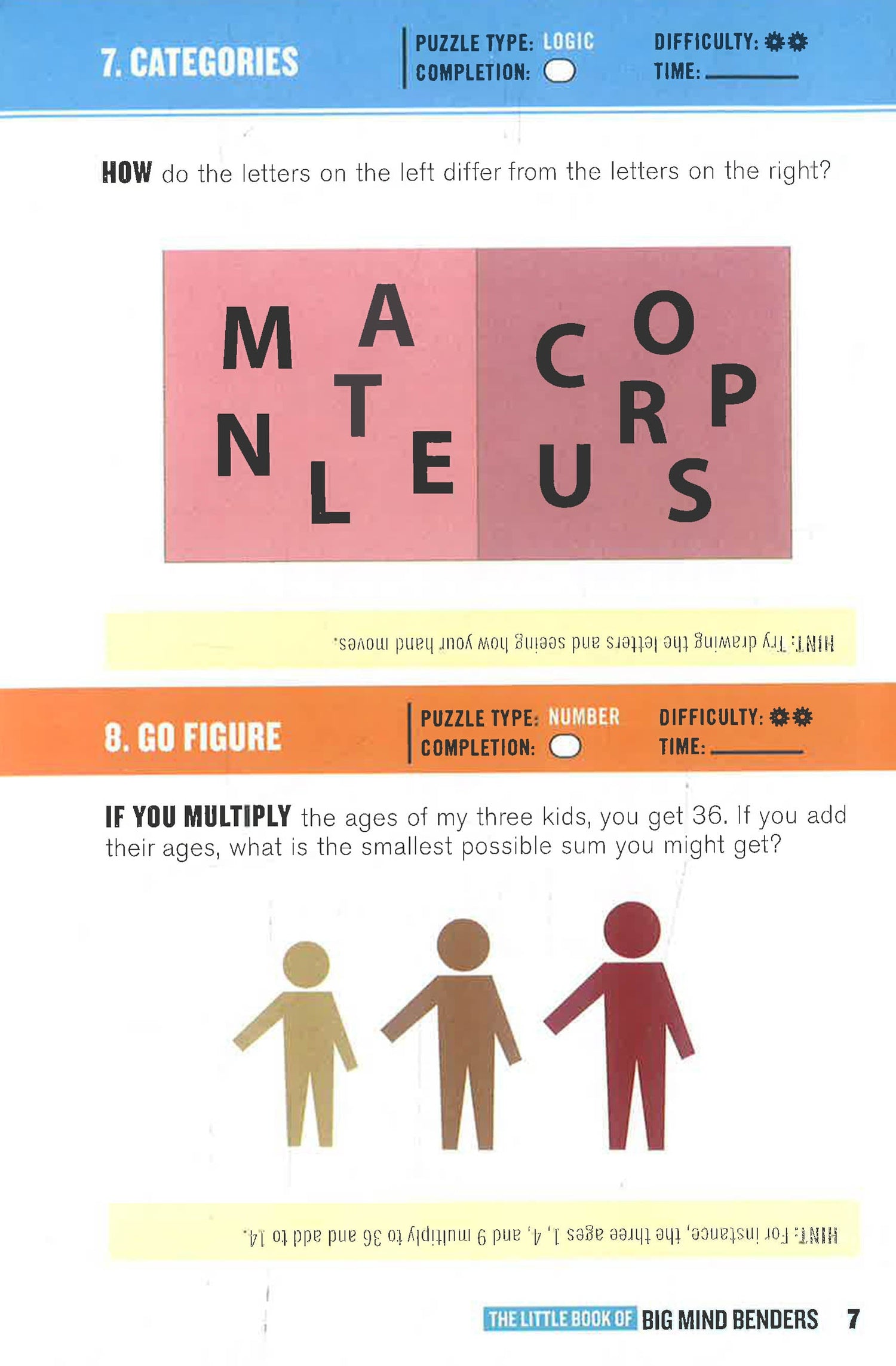 Smart, additive, challenging, fun—this mind-expanding collection of over 450 full-color spatial puzzles, number challenges, wordplay, visual conundrums, and more is like a stealth boot camp for the brain. Both sides, left and right. The puzzles are color-coded by type and distributed throughout the book in mixed fashion, for a cross-training effect. Test your knack for patterns with Perfect Match, then jump into logic's deep end in Go Figure—all for a more nimble brain.