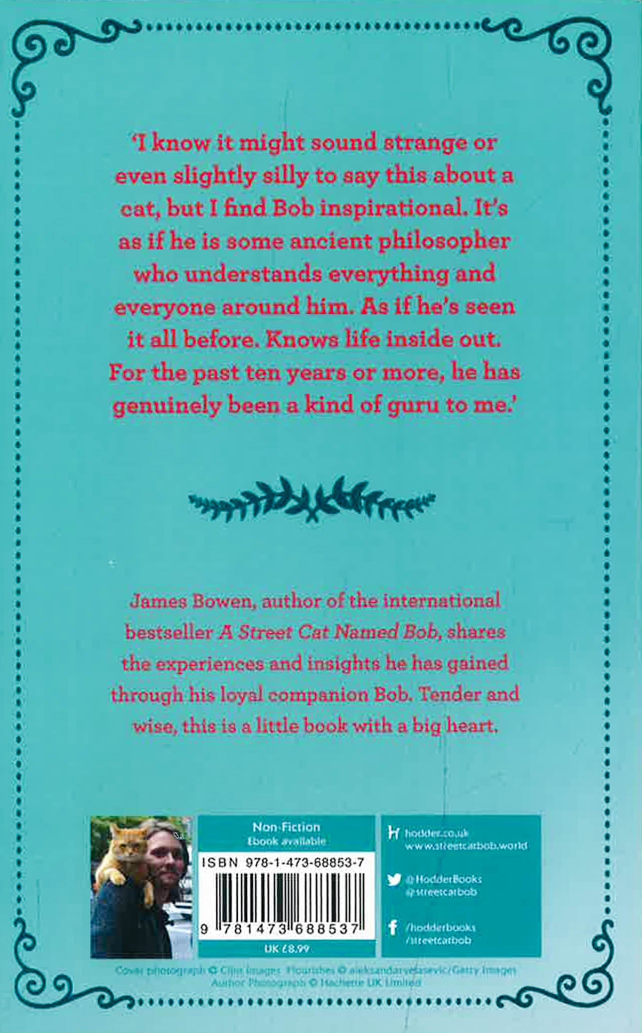 **NOW A MAJOR FILM A Christmas Gift from Bob, starring Luke Treadaway as James and Bob himself. A gift book of wisdom from everyone's favourite street cat.**'One thing I've known about Bob from the very beginning is that he possesses a wisdom that is unusual, even in cats. In the decade since we met he's grown even wiser in my eyes. This book is a collection of the insights I've gained during my years with Bob.' In the spring of 2007, busker James Bowen came across an injured ginger tom cat in the hallway of his shelter in north London. What he didn't know was that this would be the start of a friendship that would turn both their lives around, and lead to A Street Cat Named Bob, the international bestseller that tells the story of their friendship. The Little Book of Bob is a collection of the wisdom James has learnt from Bob throughout the years, as they go through thick and thin together. From the power of friendship to staying calm and finding the joys in a simple life, let Bob be your guide on how to navigate the ins and outs of life like a wise street cat.