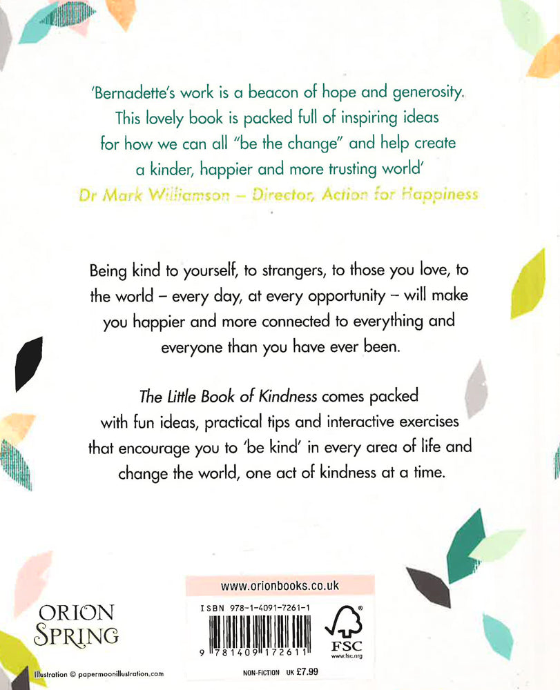 Kindness - learn how to take action to change the world, one act of kindness at a timeThe Little Book of Kindness will teach you how to be kind to yourself, to strangers, to those you love, to the world - every day, at every opportunity. Prompted by the seeming hopelessness of the world around her, Bernadette Russell undertook a pledge to be kind to a stranger every day for a year. The experience left her wanting to inspire others. The Little Book of Kindness is packed with fun ideas, practical tips and interactive exercises that encourage you to 'be kind' in every area of life - online, to strangers, to the environment, in your community, to yourself - and change the world, one act of kindness at a time.