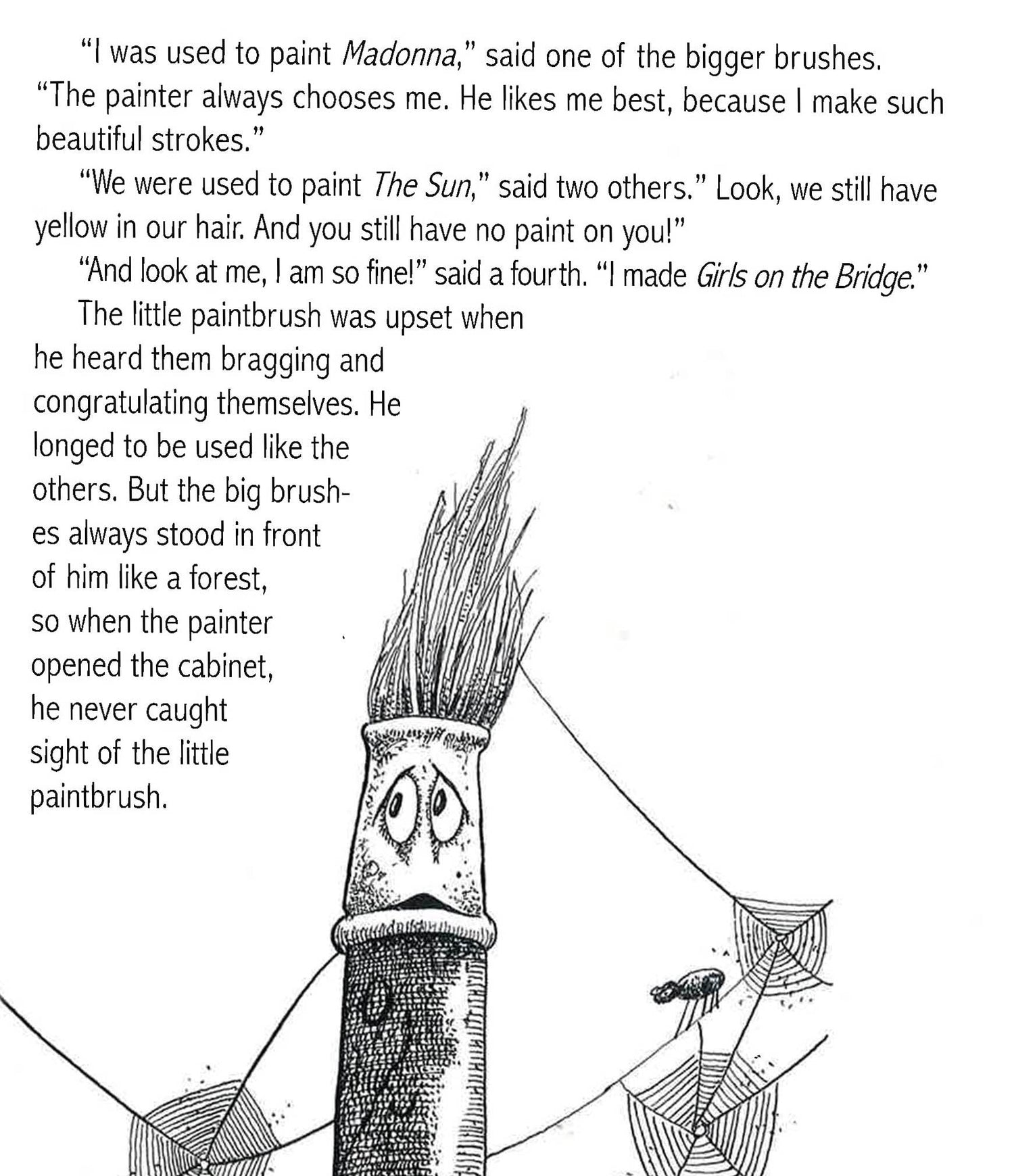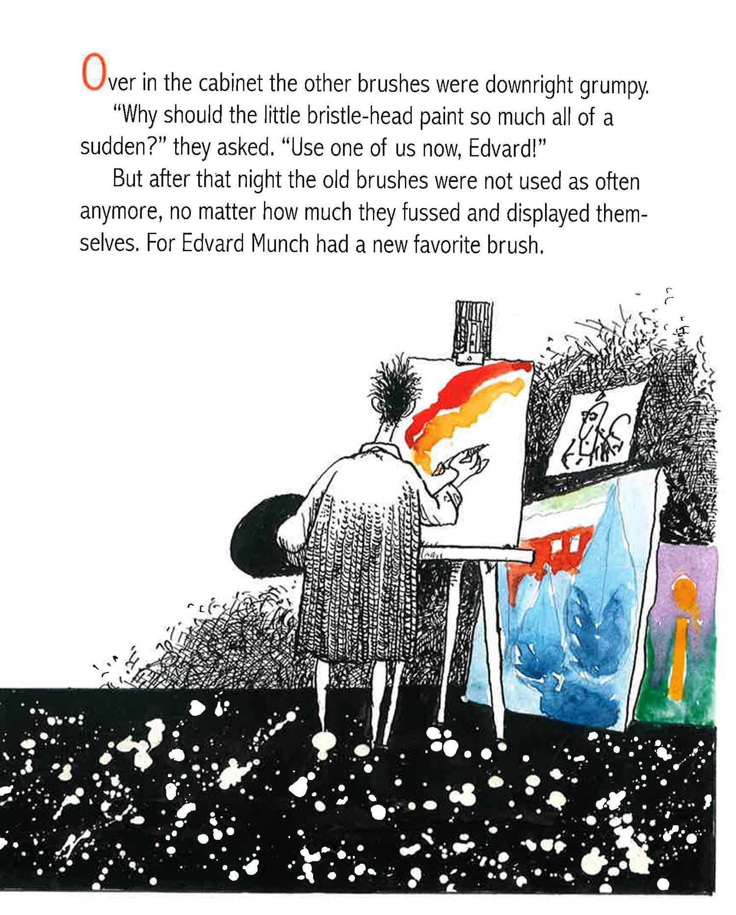 The little paintbrush is often teased by all the other brushes in the cabinet, who have thick bristles and are chosen by their artist to create many paintings. They boast all day about the pieces they've helped create, and the little paintbrush yearns to be like them. One day, the little paintbrush is thrown out of the cabinet as he tries to inch out to be noticed. Alone and disheveled, he befriends an old broom who consoles him. Then, one night, a thief breaks into the artist's house and it's up to the little paintbrush to warn the artist-who is none other than Edvard Munch! After driving the thief away, Munch is inspired by the little paintbrush and his valiant efforts. Together they create a new masterpiece, The Scream. And from then on, the little paintbrush becomes Munch's favorite. This magical tale teaches kids about one of history's most famous paintings through the story of one little paintbrush who becomes a big talent.