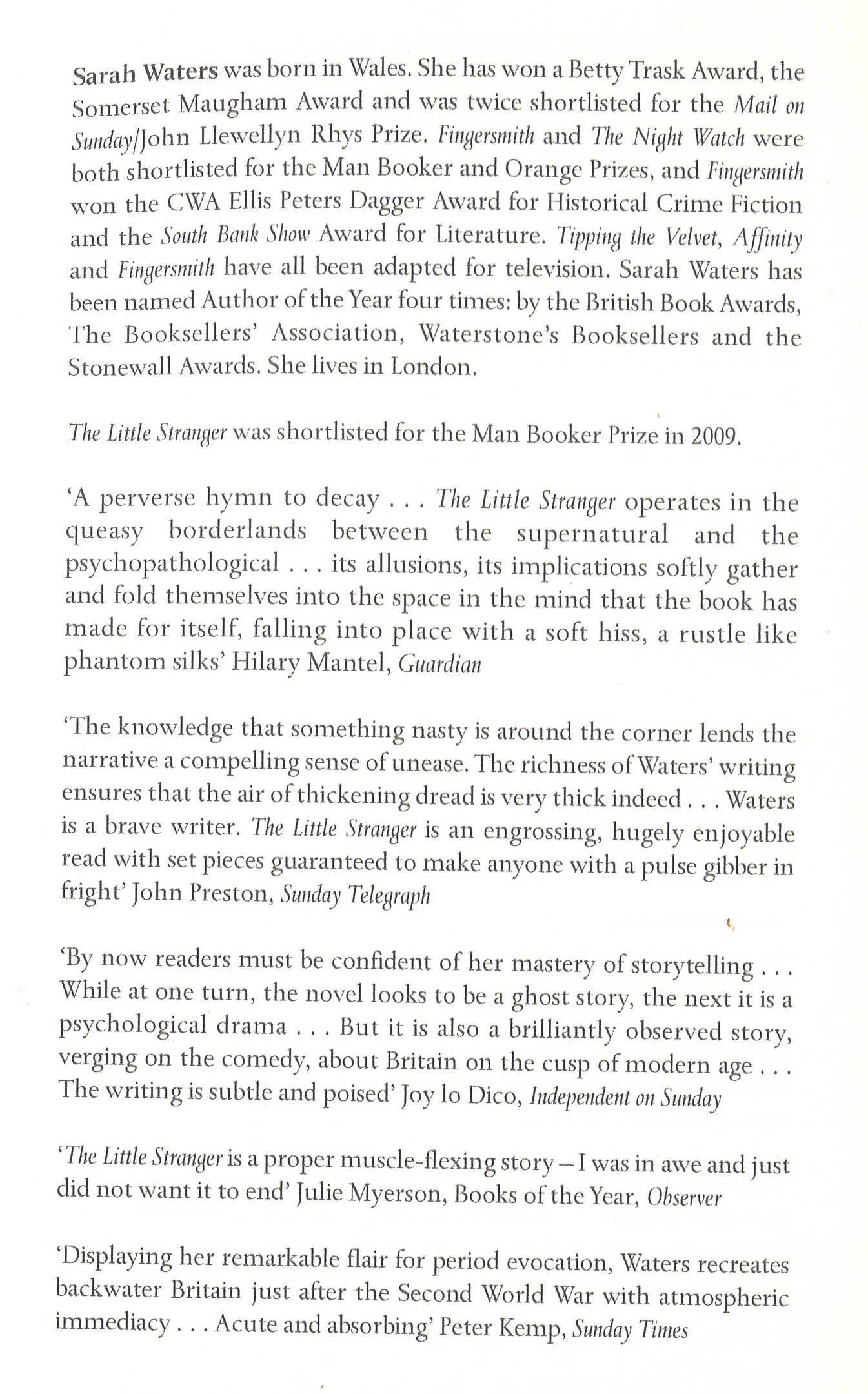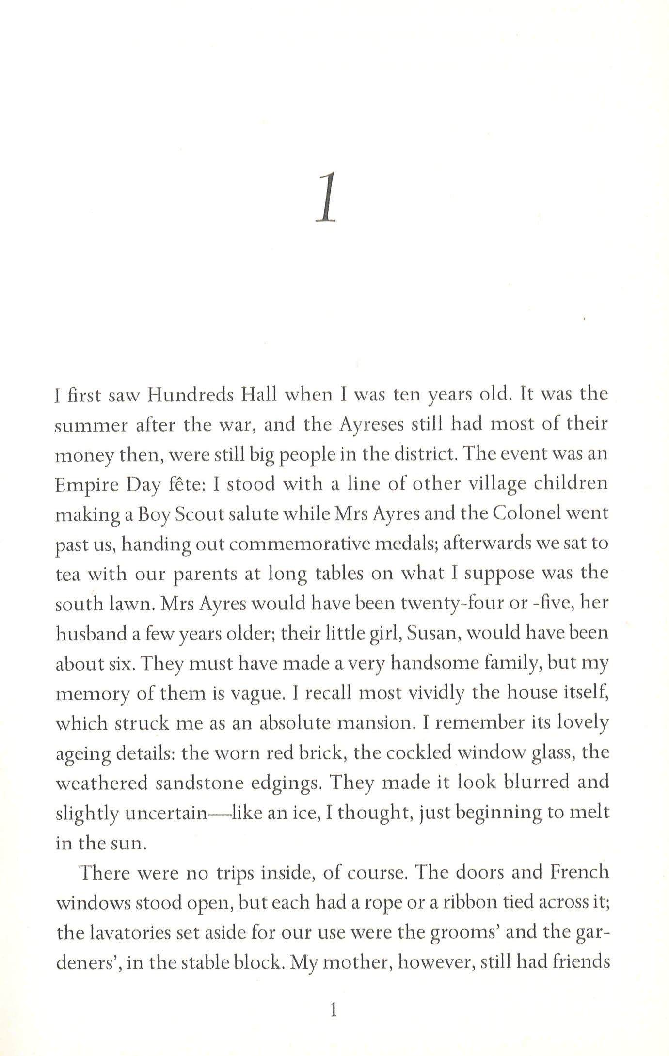 In a dusty post-war summer in rural Warwickshire, a doctor is called to a patient at lonely Hundreds Hall. Home to the Ayres family for over two centuries, the Georgian house, once grand and handsome, is now in decline, its masonry crumbling, its gardens choked with weeds, its owners - mother, son and daughter - struggling to keep pace. But are the Ayreses haunted by something more sinister than a dying way of life? Little does Dr Faraday know how closely, and how terrifyingly, their story is about to become entwined with his.