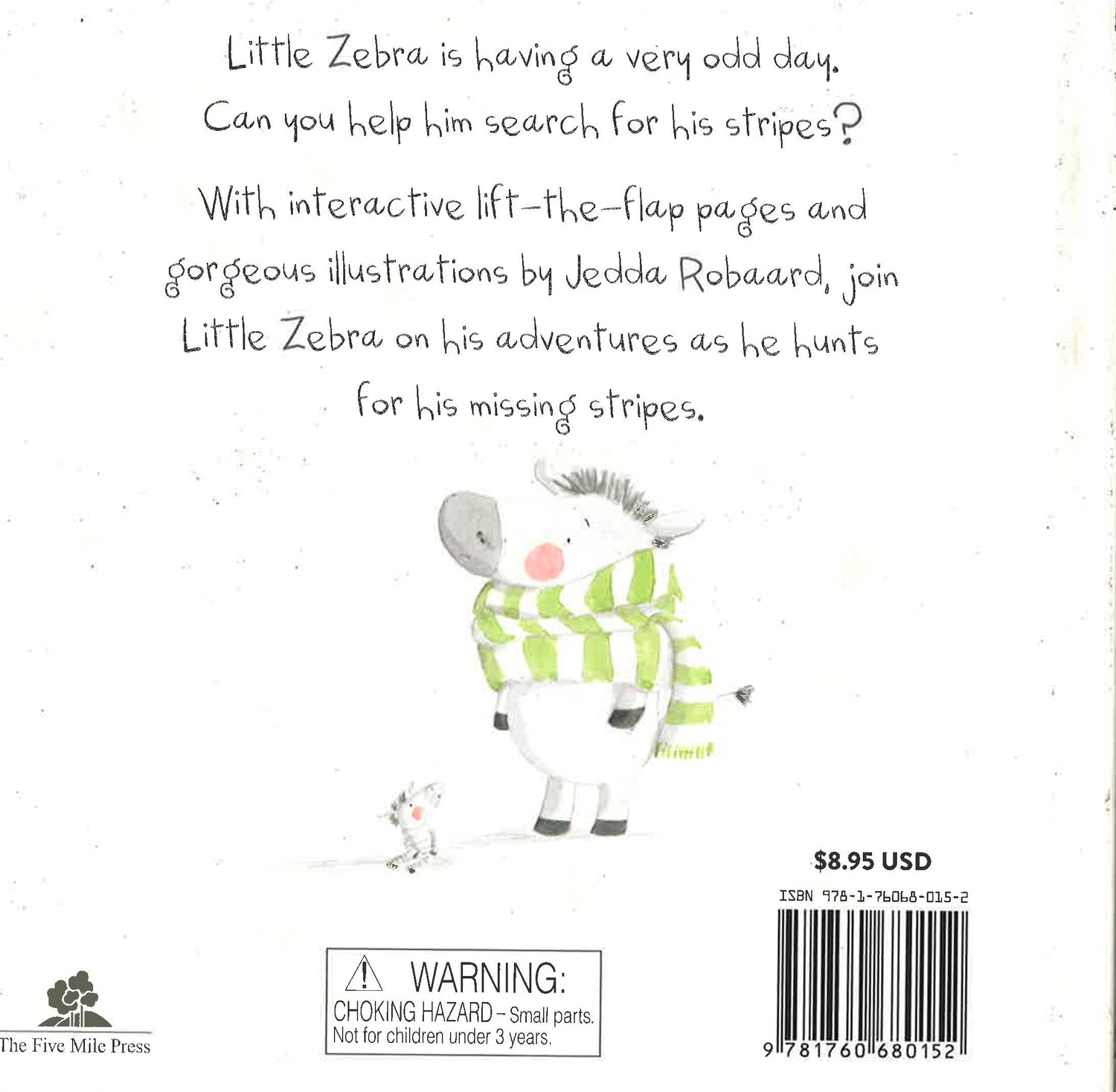 Little Zebra is having a very odd day. Can you help him seacrh for his stripes? With interacative lift-the-flap pages and gorgeous illustrations by Jedda Robaard,join Little Zebra on his adventures as he hunts for his missing stripes.