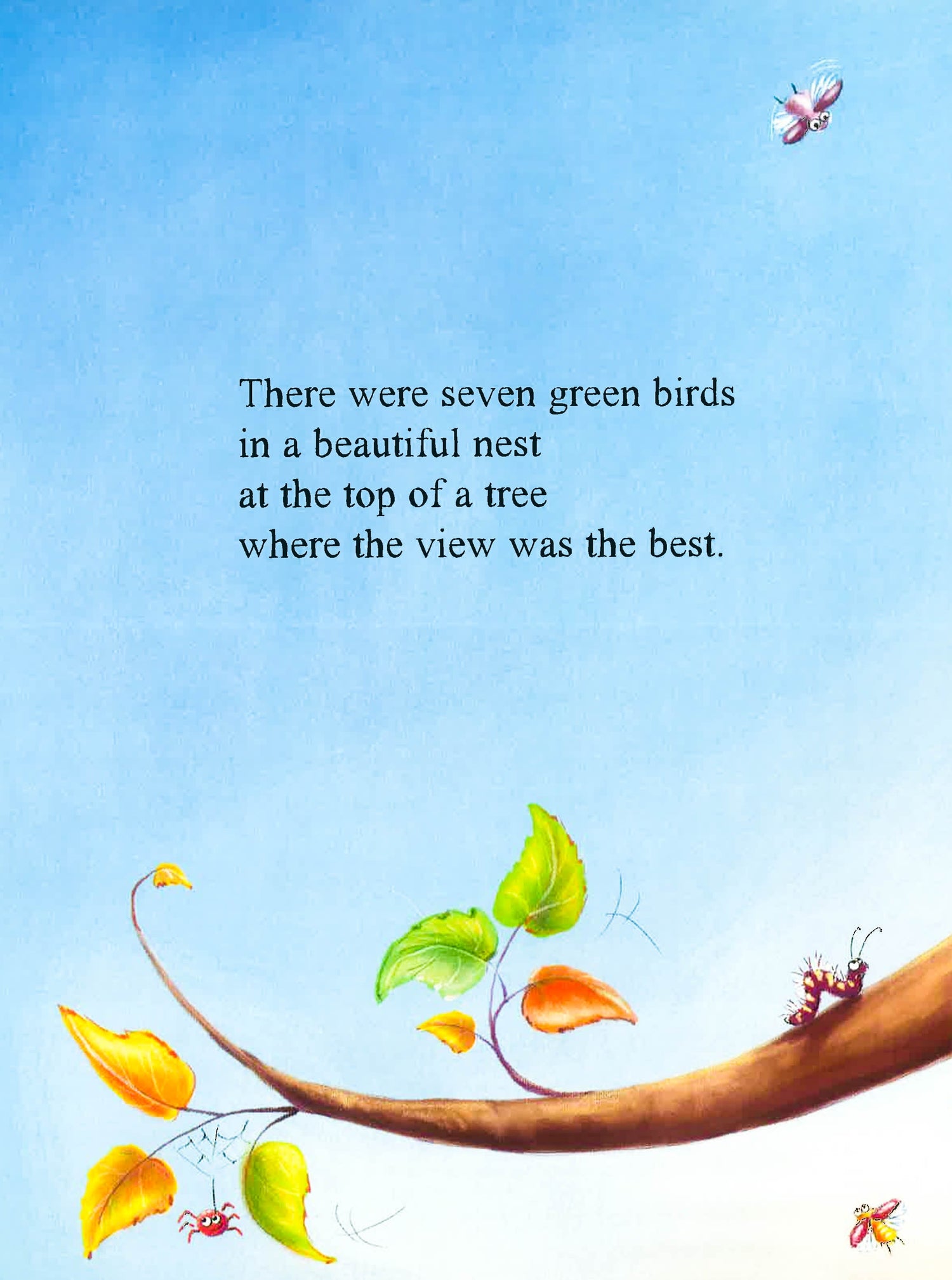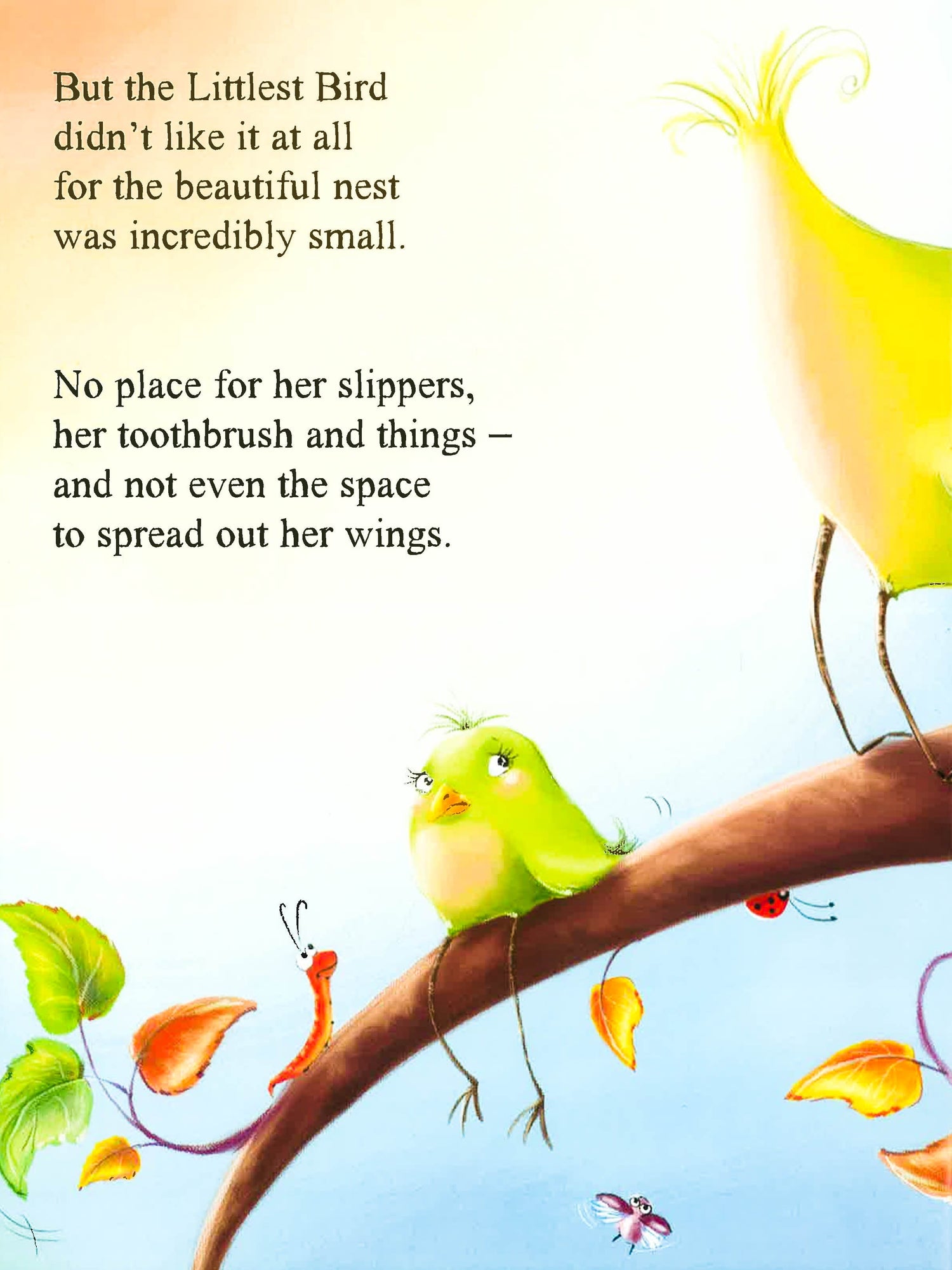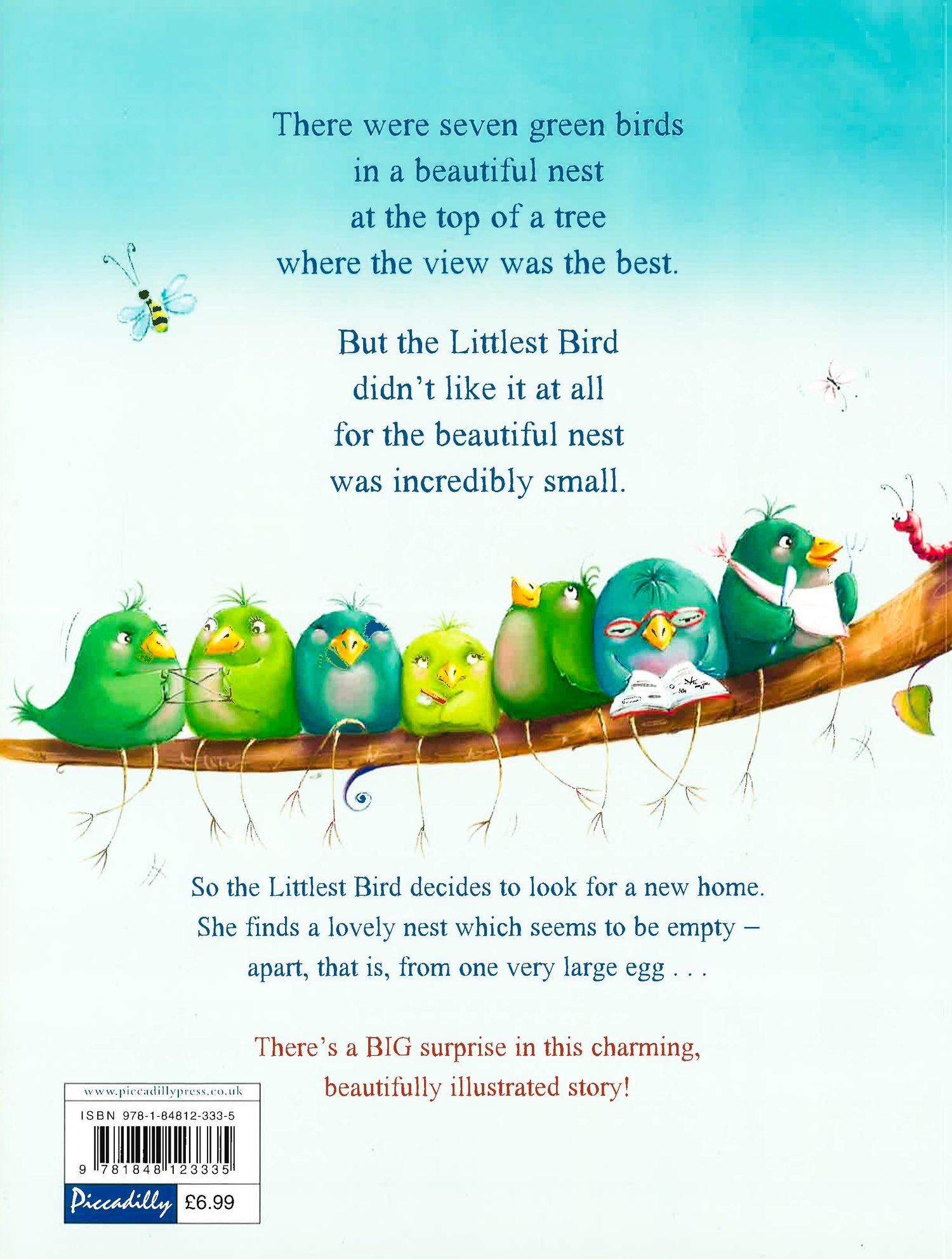 There were seven green birds in a beautiful nest at the top of a tree where the view was the best. But the Littlest Bird didn't like it at all for the beautiful nest was incredibly small. Fed up with being jostled around by all her brothers and sisters and not getting any attention, the Littlest Bird goes in search of the perfect nest, which seems to be empty - apart from an egg!