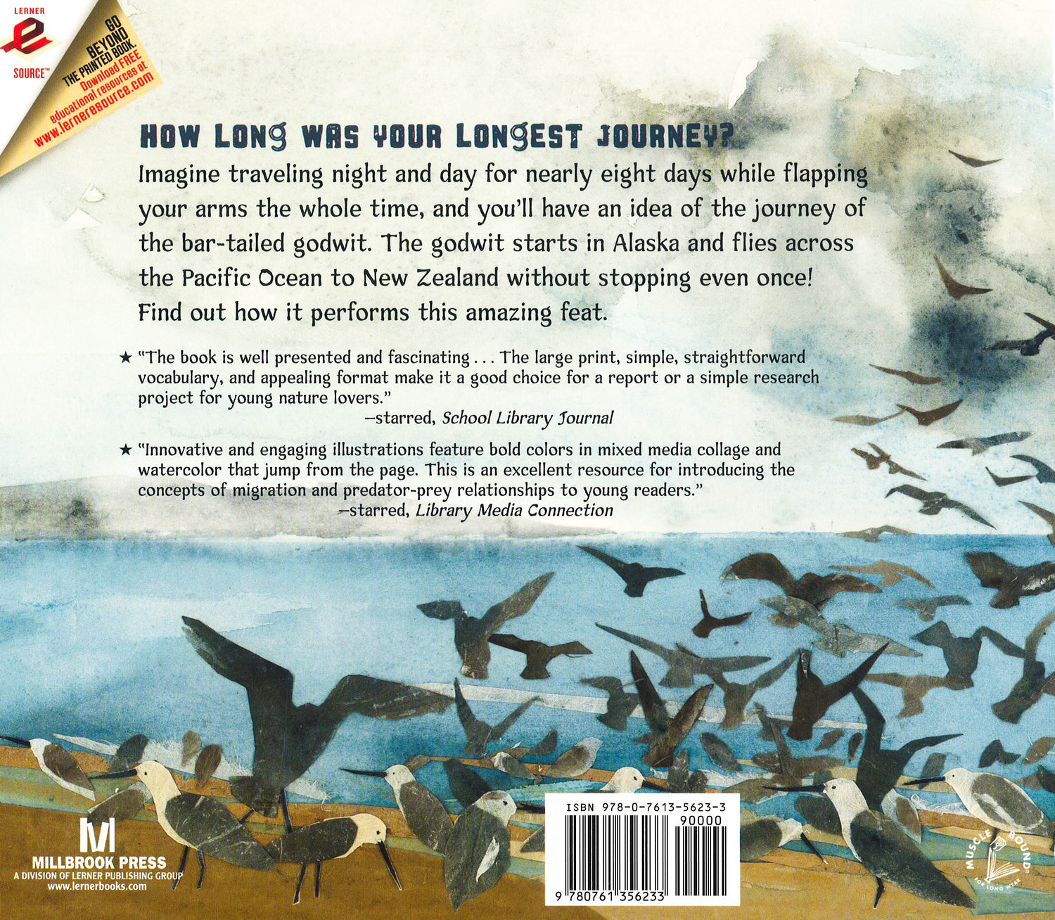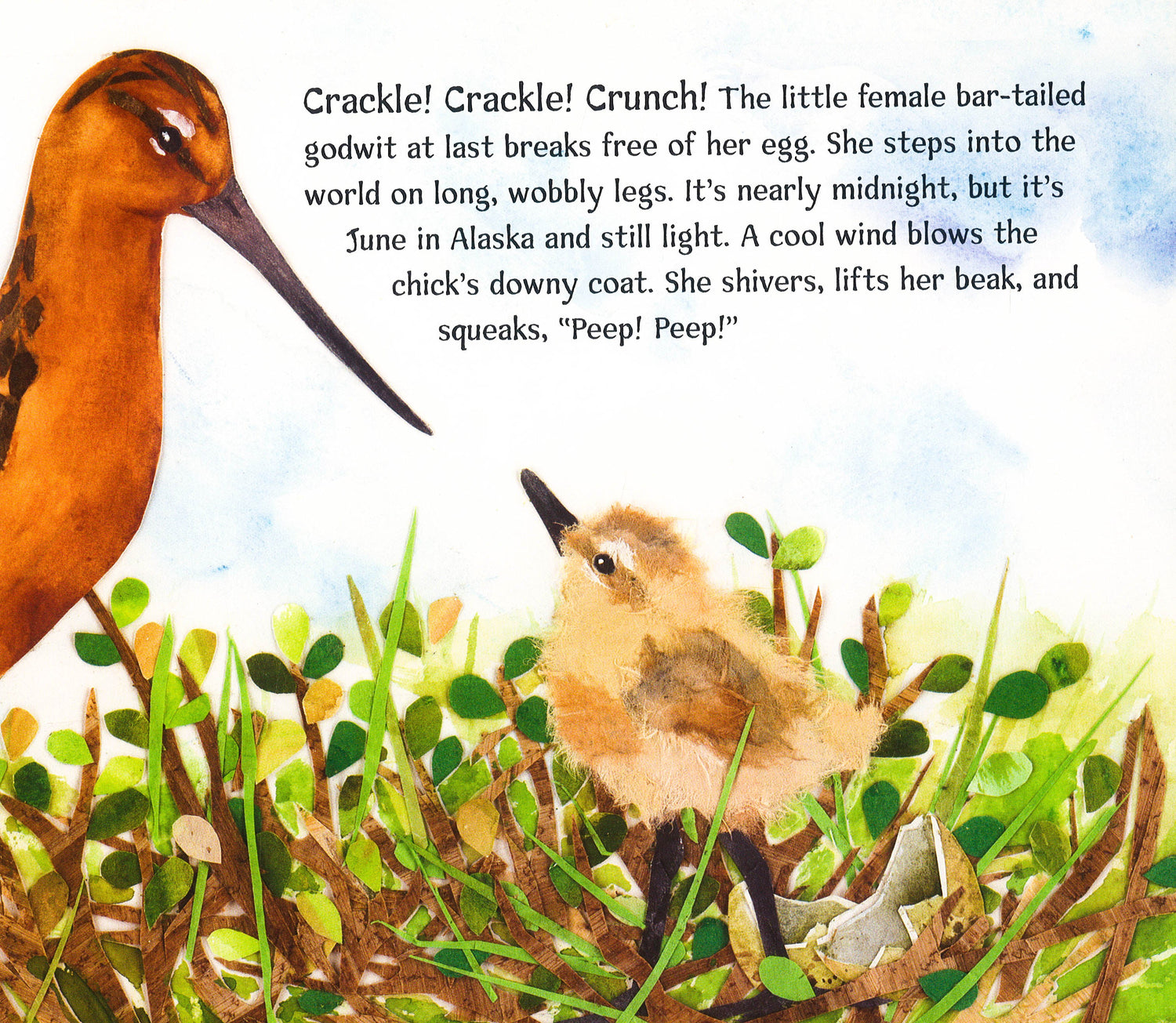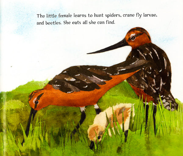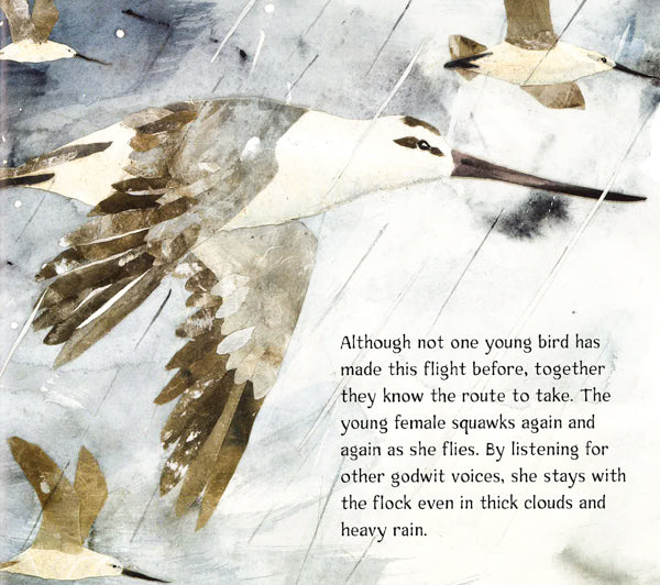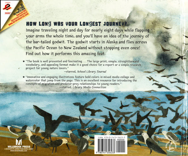 Crackle! Crackle! Crunch! What's hatching from that egg? It's a young bar-tailed godwit. She will spend the summer in Alaska learning to fly, find her own food, and escape from scary predators. Her long, long journey begins in October when she flies to New Zealand. This 7,000-mile flight is the longest nonstop bird migration ever recorded. Follow along on her amazing voyage!