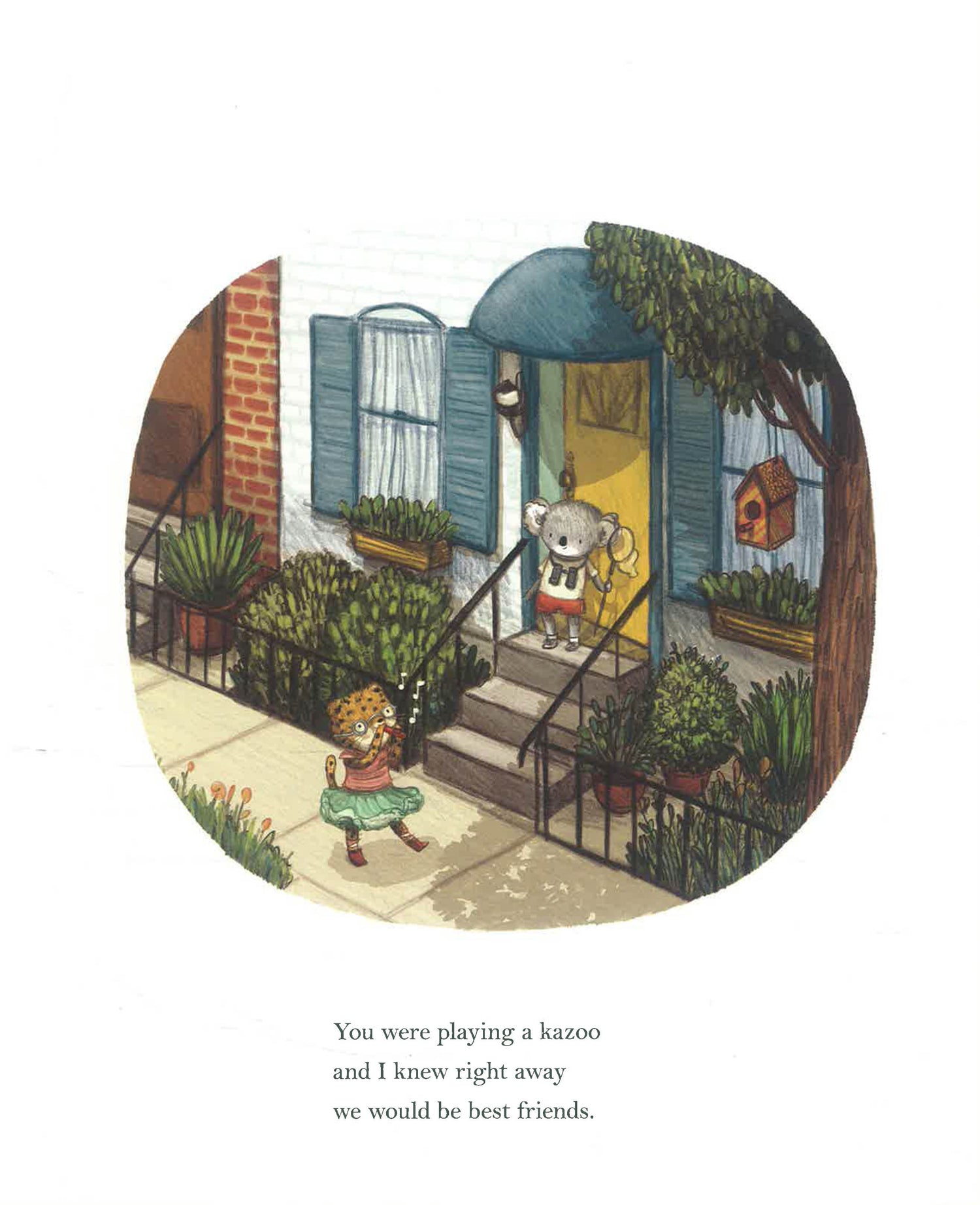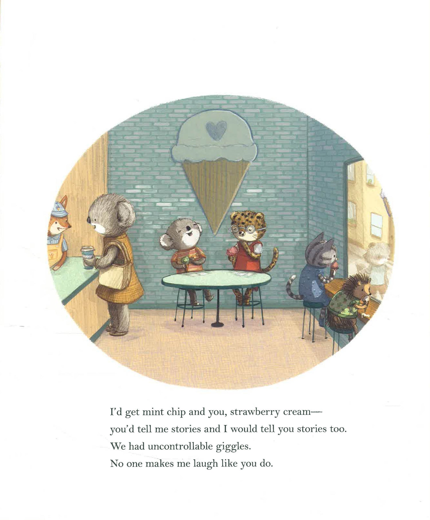 Little Koala has a long ride home, and every place her mother passes invokes a memory of her best friend: the ice cream shop where they giggled uncontrollably; the hill in the park where they crashed their bikes (that memory also lives on as a little scar on Koala’s knee), the library where they borrowed their favorite book again and again.