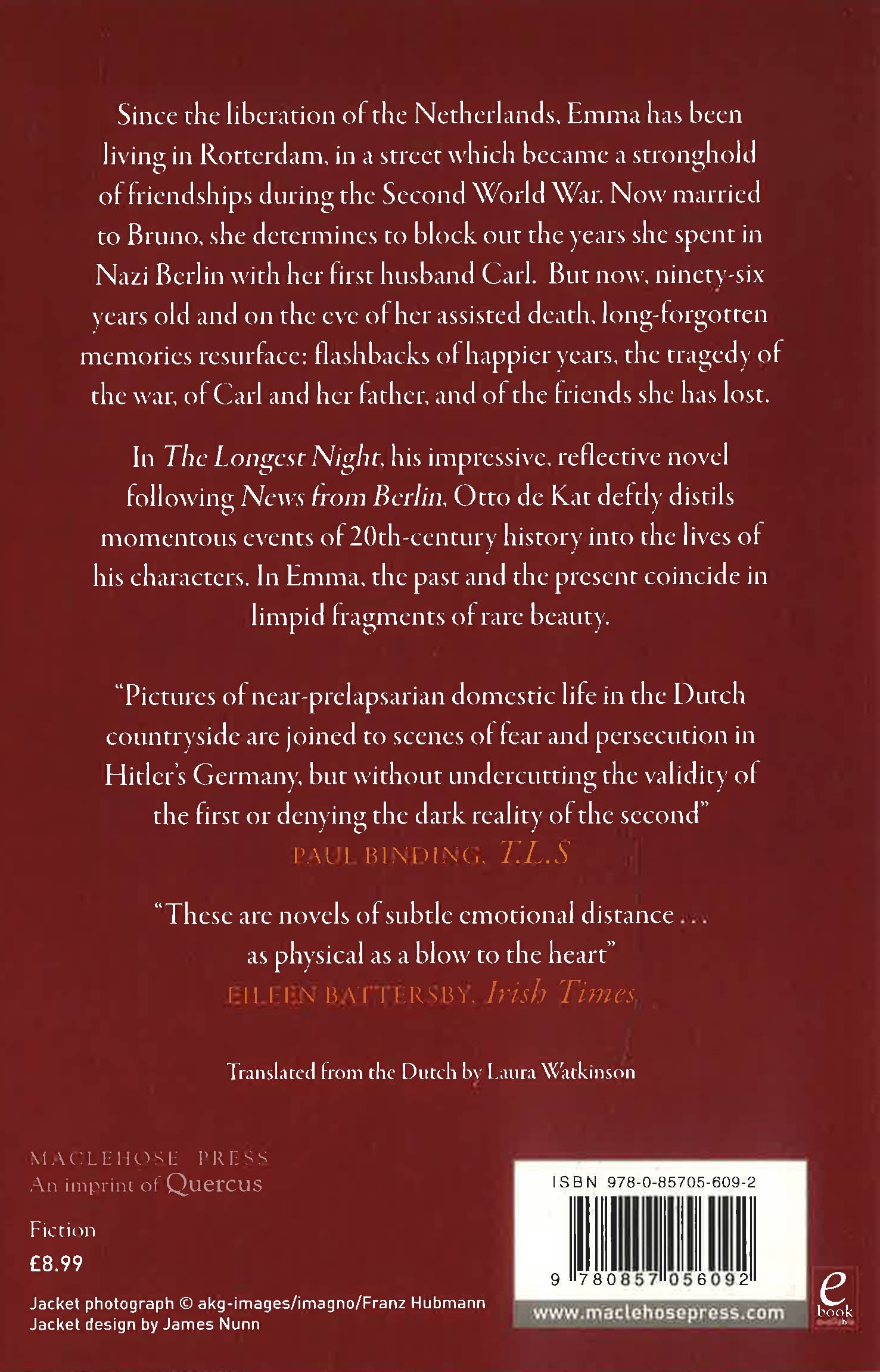 A masterpiece of literary craft and concision; sparse, beautiful and hugely affecting - Daily MailSince the liberation of the Netherlands, Emma Verweij has been living in Rotterdam, in a street which became a stronghold of friendships for its inhabitants during the Second World War. She marries Bruno, they have two sons, and she determines to block out the years she spent in Nazi Berlin during the war, with her first husband Carl. But now, ninety-six years old and on the eve of her death, long- forgotten memories crowd again into her consciousness, flashbacks of happier years, and the tragedy of the war, of Carl, of her father, and of the friends she has lost. In The Longest Night, his impressive, reflective new novel after News from Berlin, Otto de Kat deftly distils momentous events of 20th-century history into the lives of his characters. In Emma, the past and the present coincide in limpid fragments of rare, melancholy beauty.Translated from the Dutch by Laura Watkinson