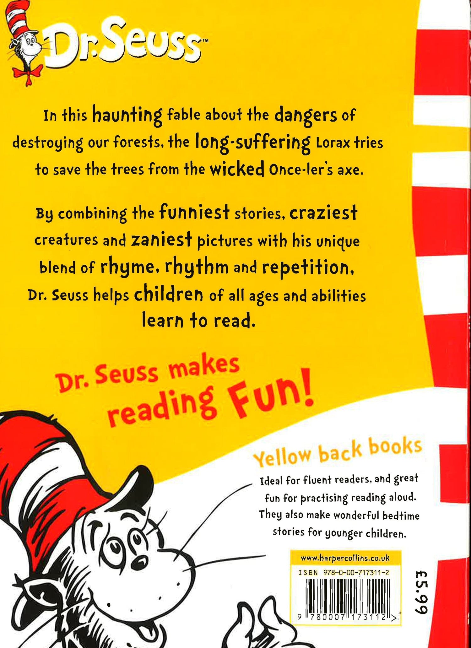 This delightful book forms part of the third stage in HarperCollins' major Dr. Seuss rebrand programme. With the relaunch of six more titles in January 2004, such all-time favourites as The Lorax, The Foot Book and Yertle the Turtle boast bright new covers that incorporate much needed guidance on reading levels: Blue Back Books are for parents to share with young children, Green Back Books are for budding readers to tackle on their own, and Yellow Back Books are for older, more fluent readers to enjoy. The Lorax belongs to the Yellow Back Book range.