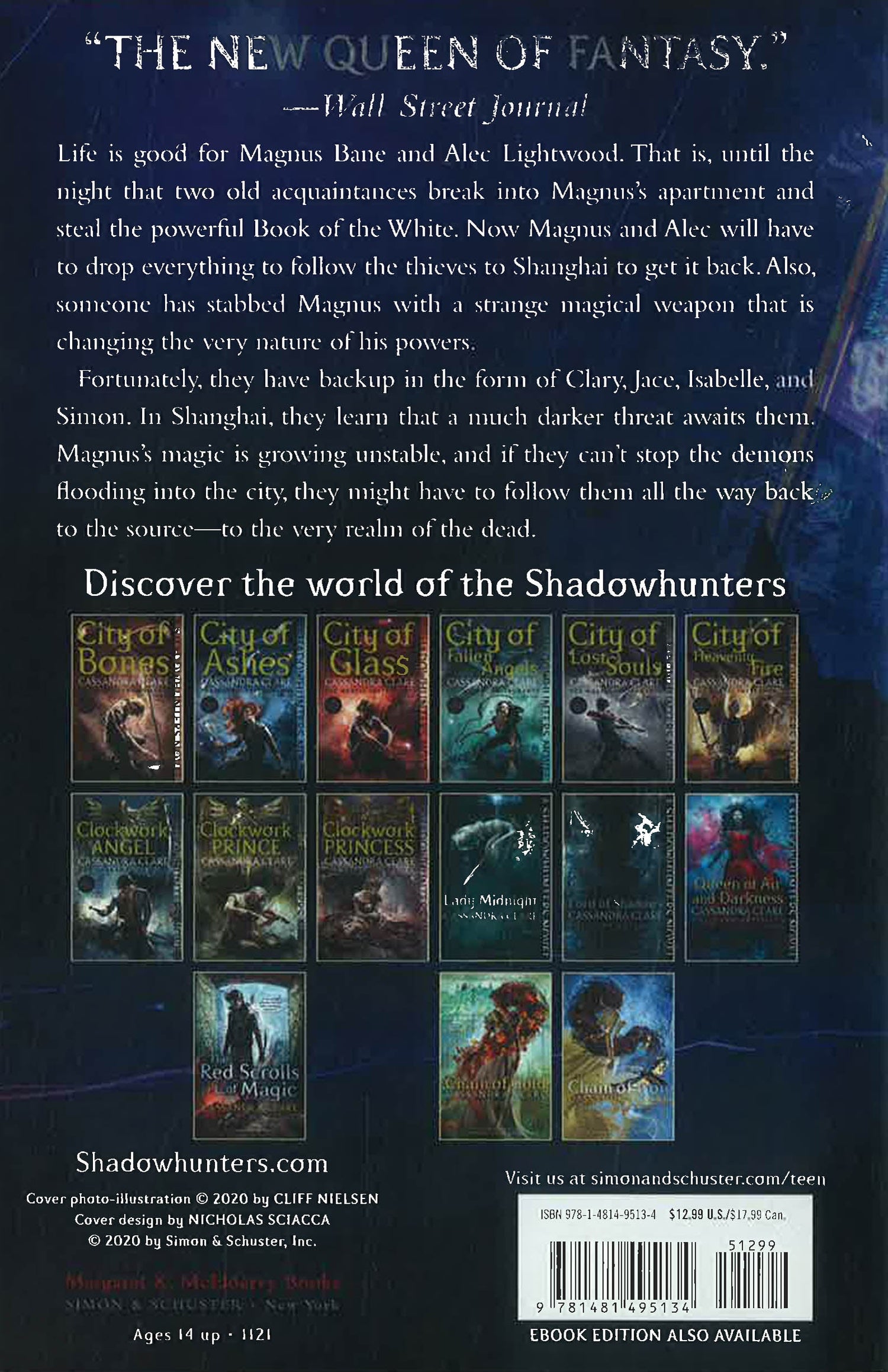 Fortunately, their backup consists of Clary, Jace, Isabelle, and newly minted Shadowhunter Simon. In Shanghai, they learn that a much darker threat awaits them. Magnus’s magic is growing unstable, and if they can’t stop the demons flooding into the city, they might have to follow them all the way back to the source—to the very realm of the dead.