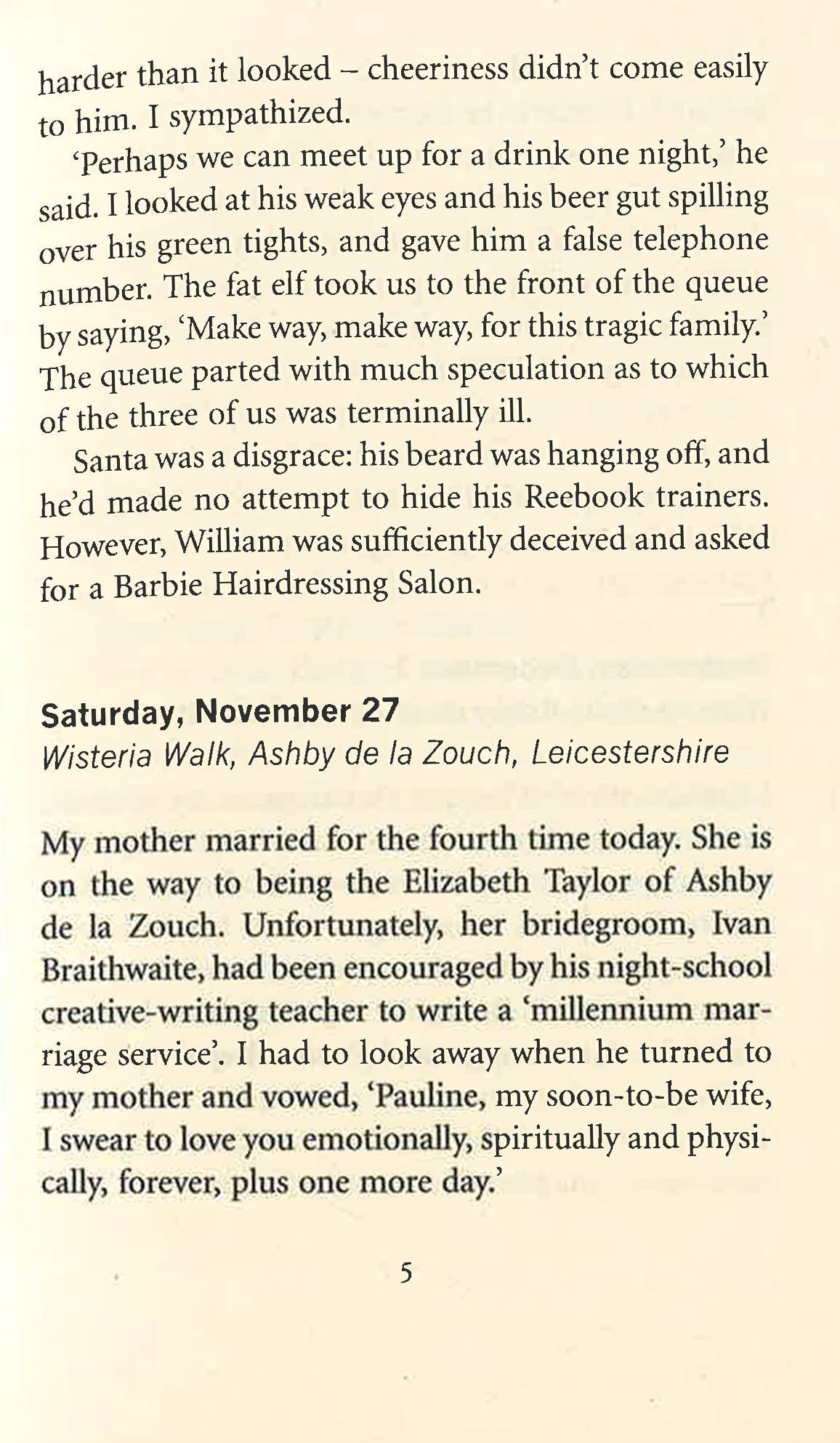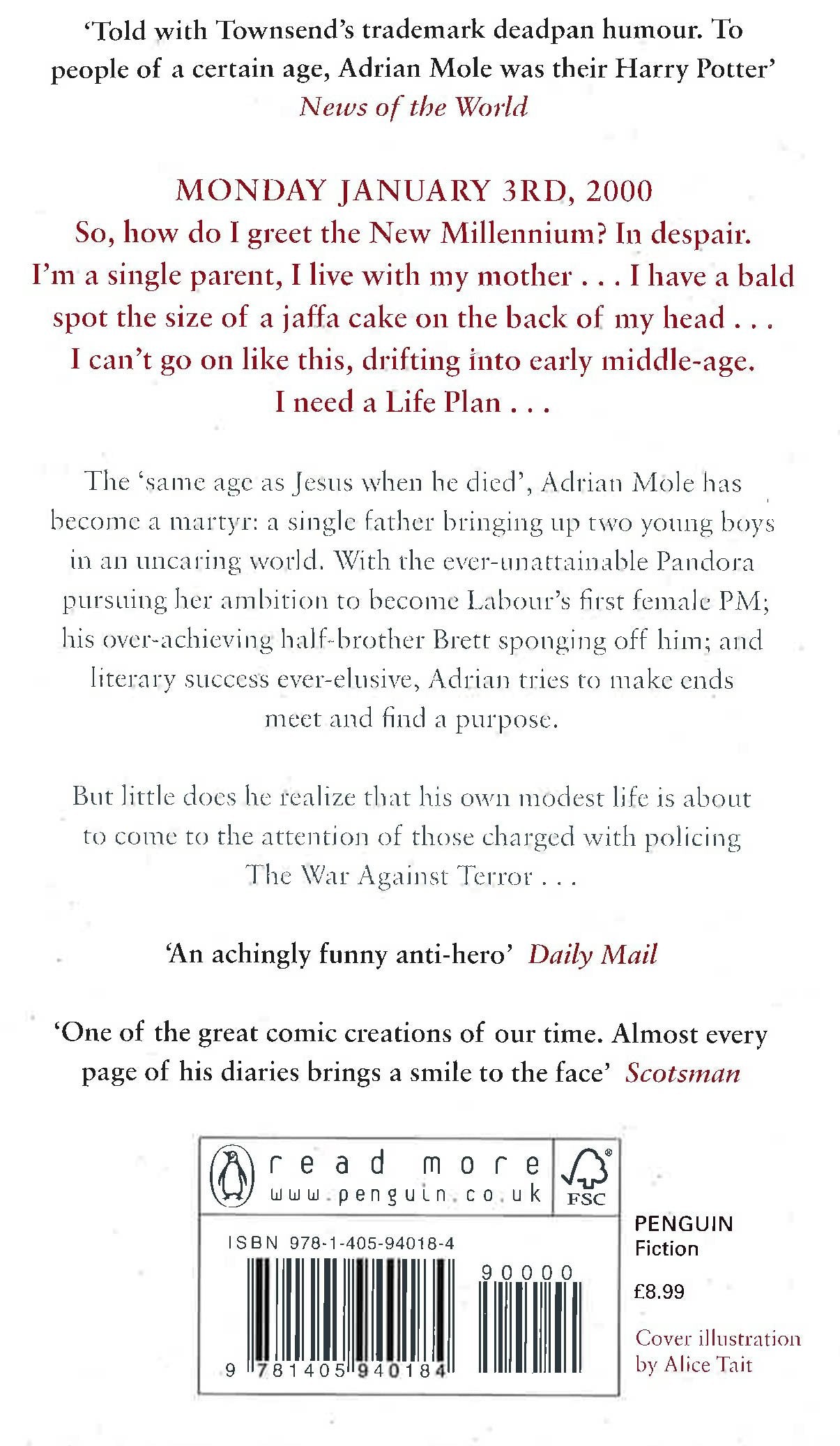The 'same age as Jesus when he died', Adrian Mole has become a martyr: a single-father bringing up two young boys in an uncaring world. With the ever-unattainable Pandora pursuing her ambition to become Labour's first female PM; his over-achieving half-brother Brett sponging off him; and literary success ever-elusive, Adrian tries to make ends meet and find a purpose. But little does he realise that his own modest life is about to come to the attention of those charged with policing The War Against Terror . . .
