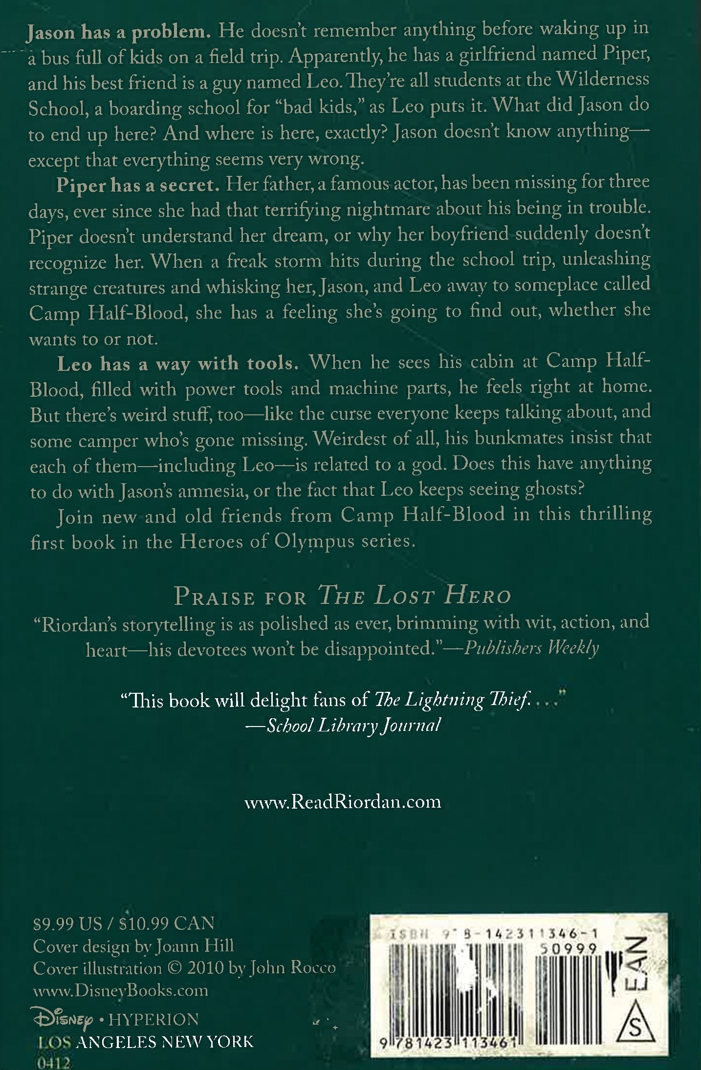Jason has a problem. He doesn't remember anything before waking up on a school bus holding hands with a girl. Apparently she's his girlfriend Piper, his best friend is a kid named Leo, and they're all students in the Wilderness School, a boarding school for "bad kids." What he did to end up here, Jason has no idea-except that everything seems very wrong. Piper has a secret. Her father has been missing for three days, and her vivid nightmares reveal that he's in terrible danger. Now her boyfriend doesn't recognize her, and when a freak storm and strange creatures attack during a school field trip, she, Jason, and Leo are whisked away to someplace called Camp Half-Blood. What is going on? Leo has a way with tools. His new cabin at Camp Half-Blood is filled with them. Seriously, the place beats Wilderness School hands down, with its weapons training, monsters, and fine-looking girls. What's troubling is the curse everyone keeps talking about, and that a camper's gone missing. Weirdest of all, his bunkmates insist they are all-including Leo-related to a god. Rick Riordan, the best-selling author of the Percy Jackson series, pumps up the action and suspense in The Lost Hero, the first book in The Heroes of Olympus series. Fans of demi-gods, prophesies, and quests will be left breathless--and panting for Book Two.