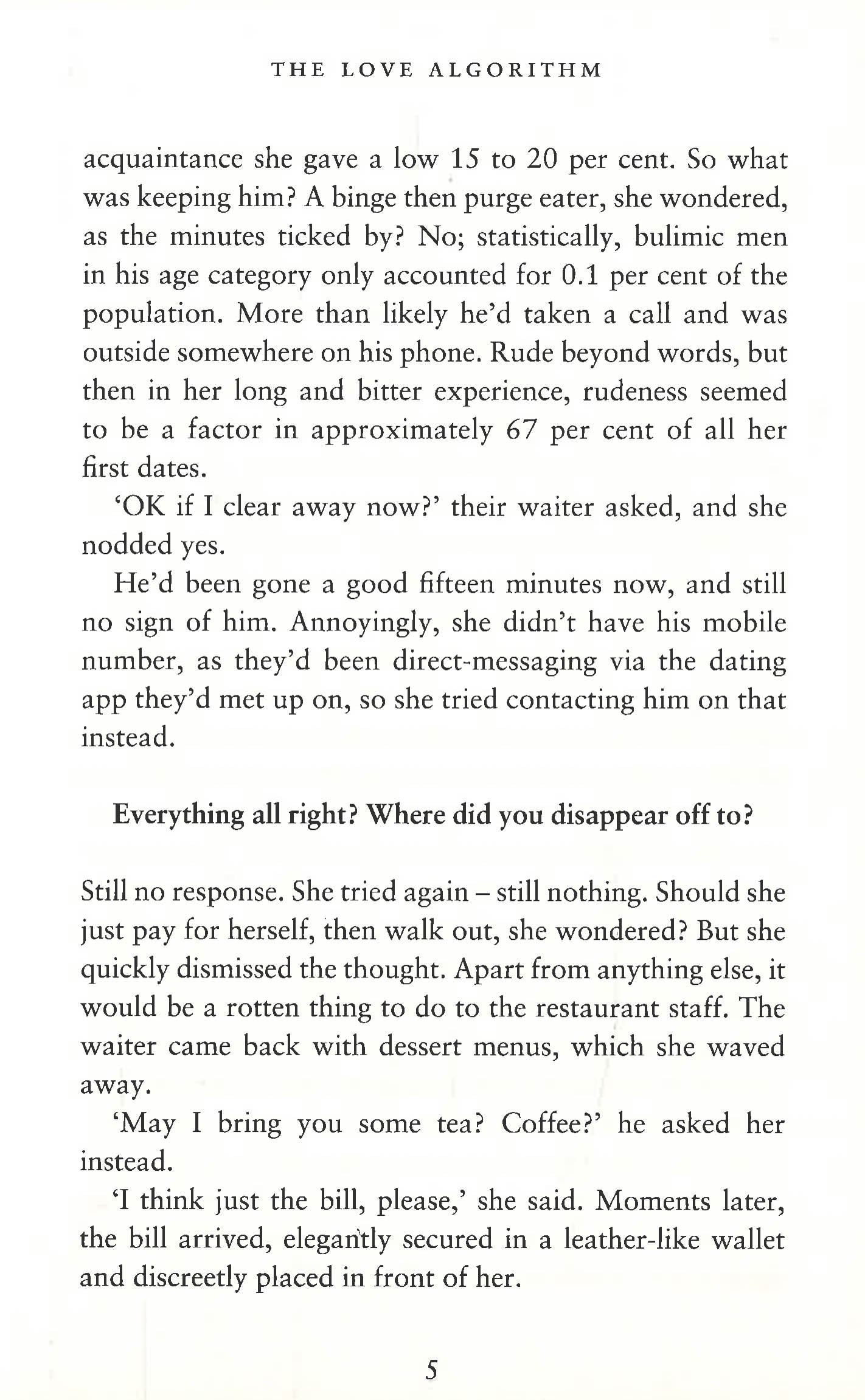 Iris lives by numbers. The only thing missing from her perfectly calibrated life is a partner - and not for lack of trying. After decades of disappointment, Iris practically has a PhD in online dating. But something still eludes her: that unquantifiable spark.