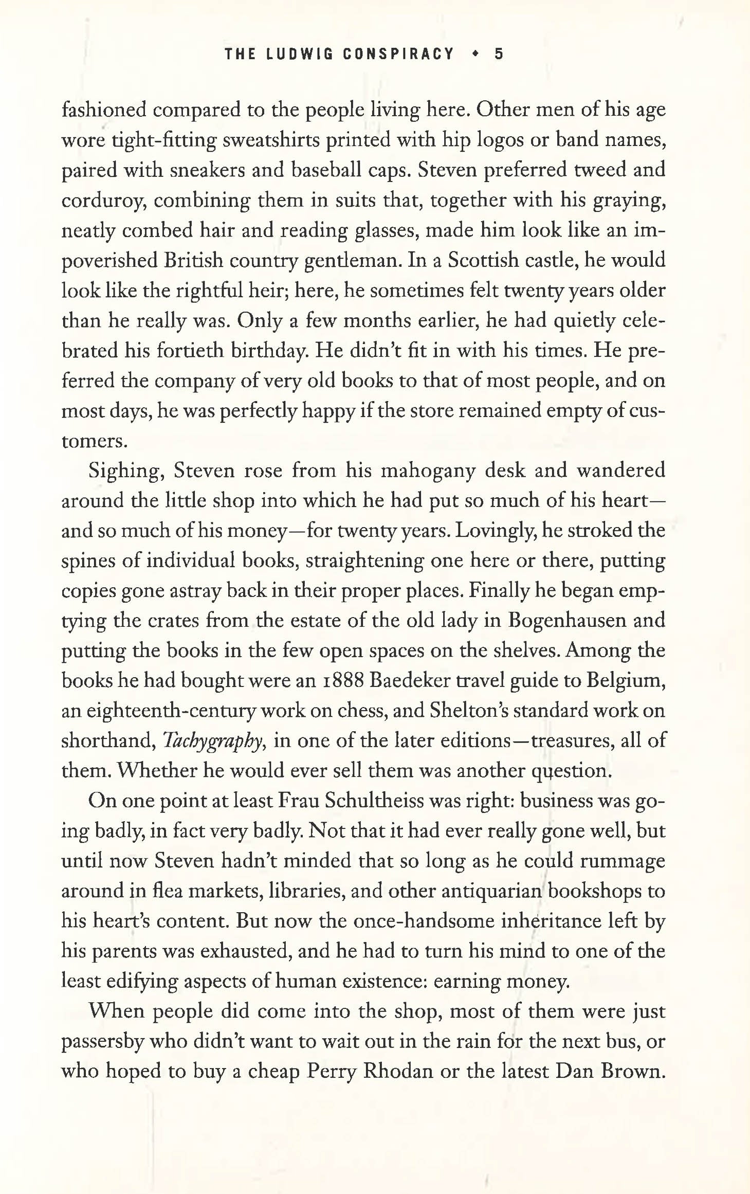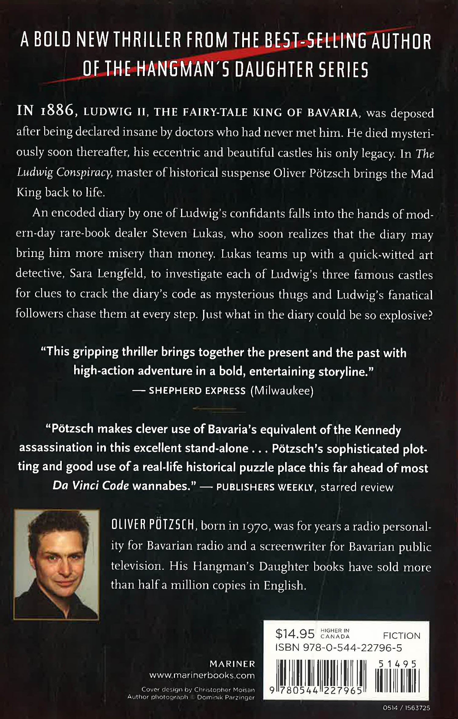 In 1886, Ludwig II, the fairytale king of Bavaria, was deposed after being declared insane by doctors who had never met him. He died mysteriously soon thereafter, his eccentric and beautiful castles his only legacy. Master of historical suspense Oliver Potzsch brings the Mad King back to life in The Ludwig Conspiracy. An encoded diary by one of Ludwig's confidants falls into the hands of modern-day rare-book dealer Steven Lukas, who soon realizes that the diary may bring him more misery than money. Lukas teams up with a beautiful art detective, Sara Lengfeld, to investigate each of Ludwig's three famous castles for clues to crack the diary's code as mysterious thugs and Ludwig's fanatical followers chase them at every step. Just what in the diary could be so explosive?
