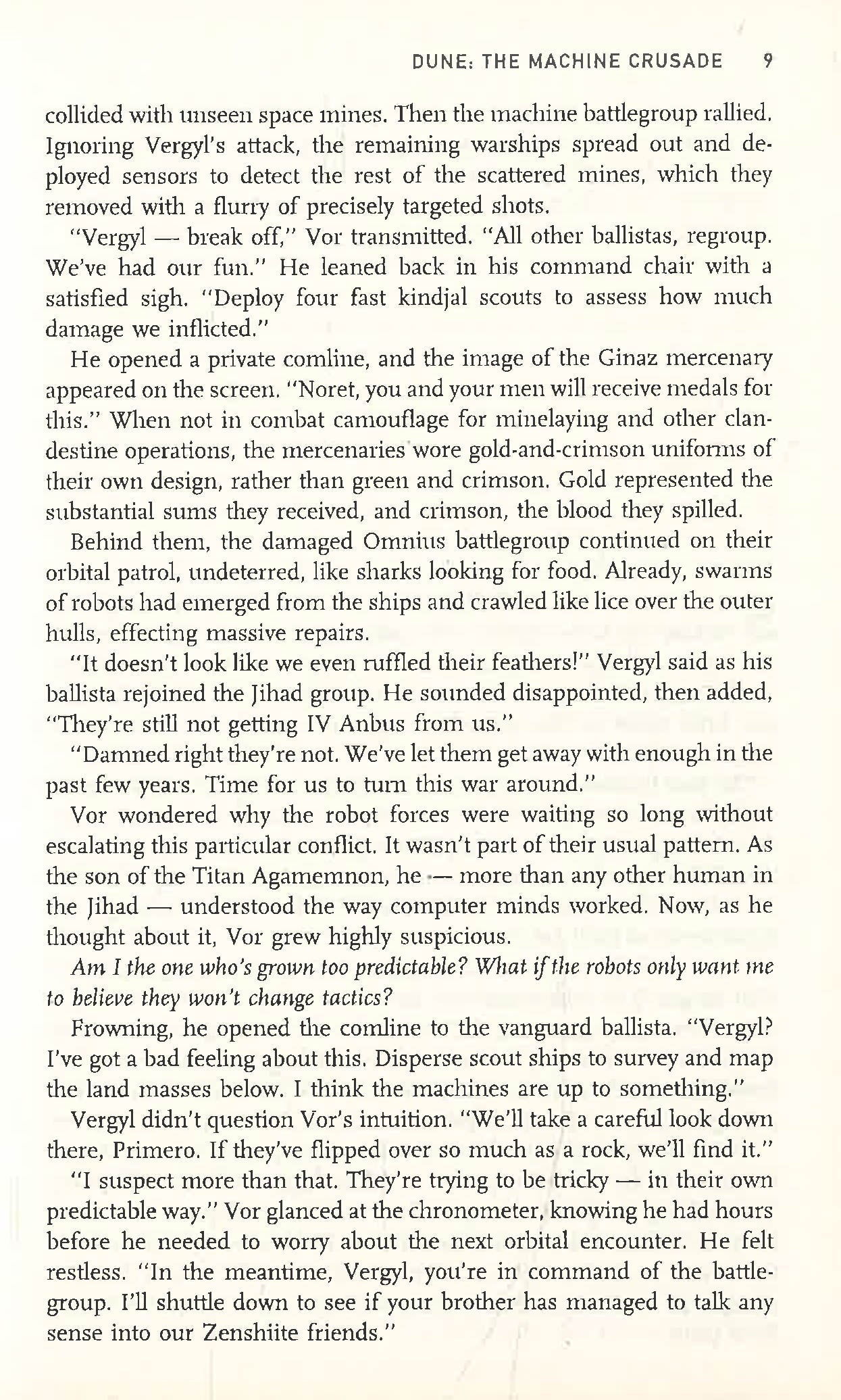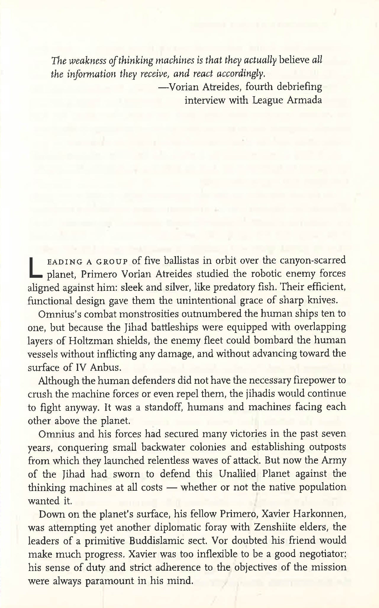 vEarth is a radioactive ruin. But the initial campaign of the Butlerian Jihad has given new hope to mankind. Serena Butler, whose murdered child has become a symbol for oppressed humanity, inspires a war against the thinking computers led by Xavier Harkonnen and Vorian Atreides. But four of the Titans - murderous machines with human brains and human cunning - still remain. And the universal computer mind, Omnius, still wields most of its power. Into this unstable landscape come two new factors. From the depths of space and time, a free Titan - the near-legendary Hecate - joins forces with humanity. And in a humble laboratory on the planet Poritrin, the mathematical genius Norma Cenva is perfecting a theory that will utterly transform the rules of space travel.