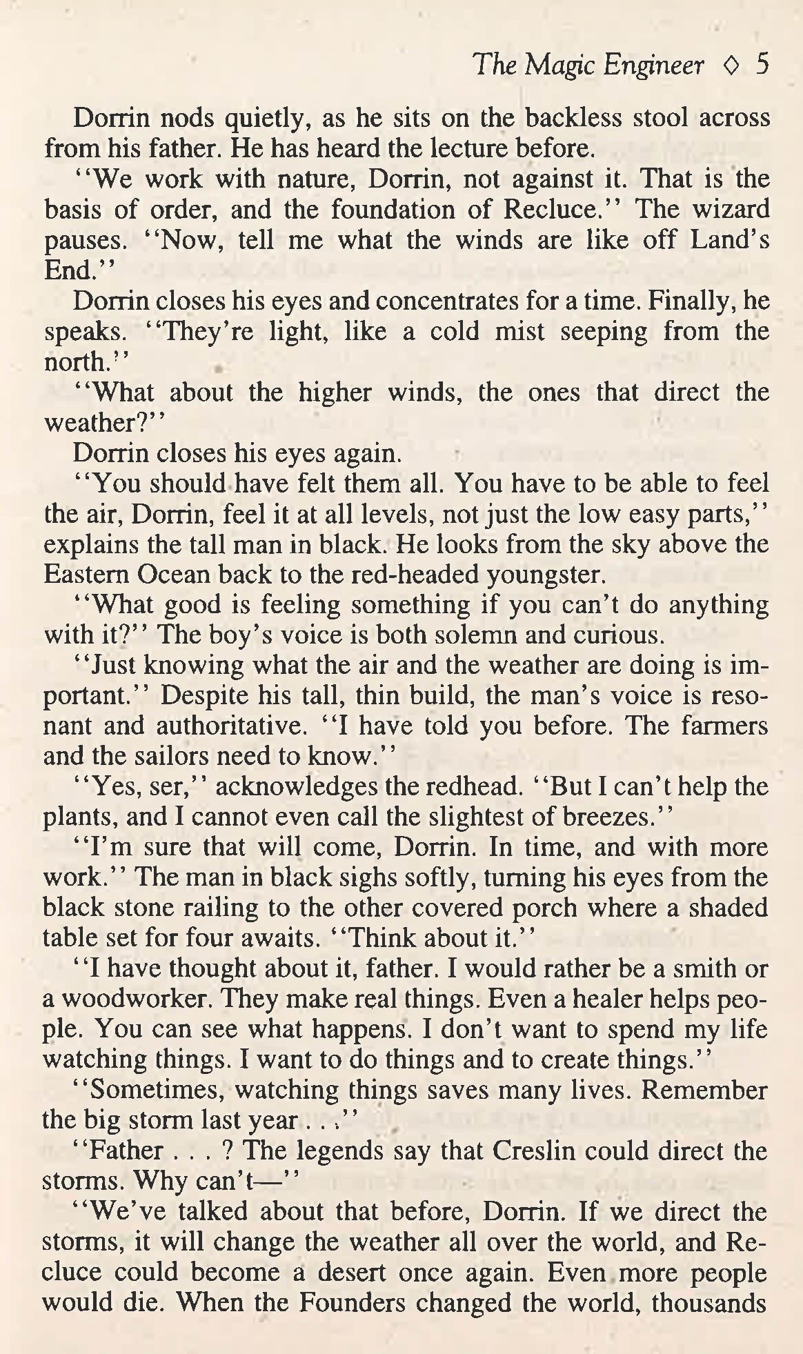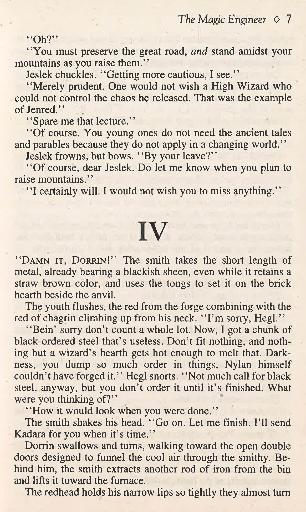 In The Magic Engineer, Dorrin, a young scion of Order magicians, is interested in forbidden knowledge - the working of machines.