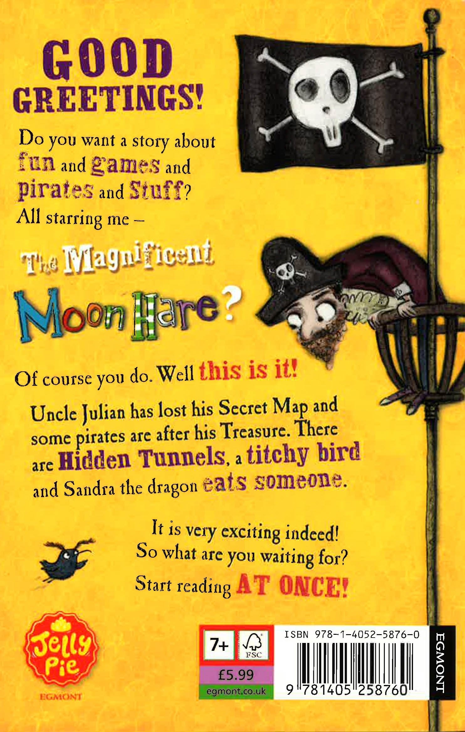 The fabulous second book in an enchanting new comedy series about a magical Moon Hare. A future classic, perfect for fans of Roald Dahl. 'We must find out what the exciting THING is! I bet that it's TREASURE!' P.J. and the Moon Hare are off on a new adventure, battling pirates. Accompanied by P.J.'s dragon (who's called Sandra even though he's a boy) can P.J. and the Moon Hare stop the horrible feathered villain Foul from stealing Uncle Julian's treasure? Sue Monroe is a fresh voice in children's books who will appeal to fans of the great Roald Dahl. The Magnificent Moon Hare and the Foul Treasure is packed with wacky characters, quirky plot twists and a general feast for the imagination. One of the genuinely funny children's books on the shelves today.