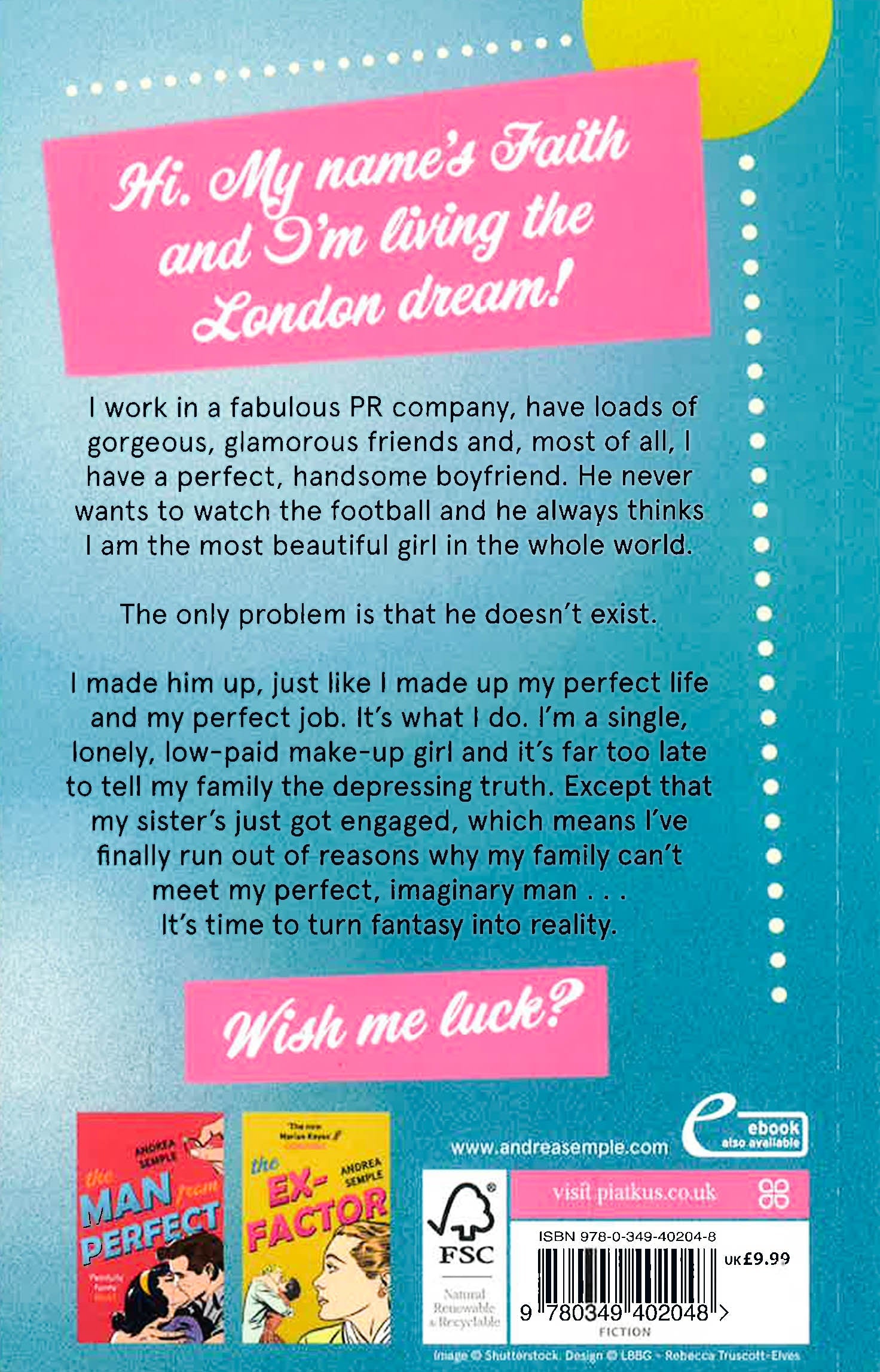 I made him up, just like I made up my perfect life and my perfect job. It's what I do. I'm a single, lonely, low-paid, make-up girl and it's far too late to tell my family the depressing truth. Except that my sister's just got engaged, which means I've finally run out of reasons why my family can't meet my man...