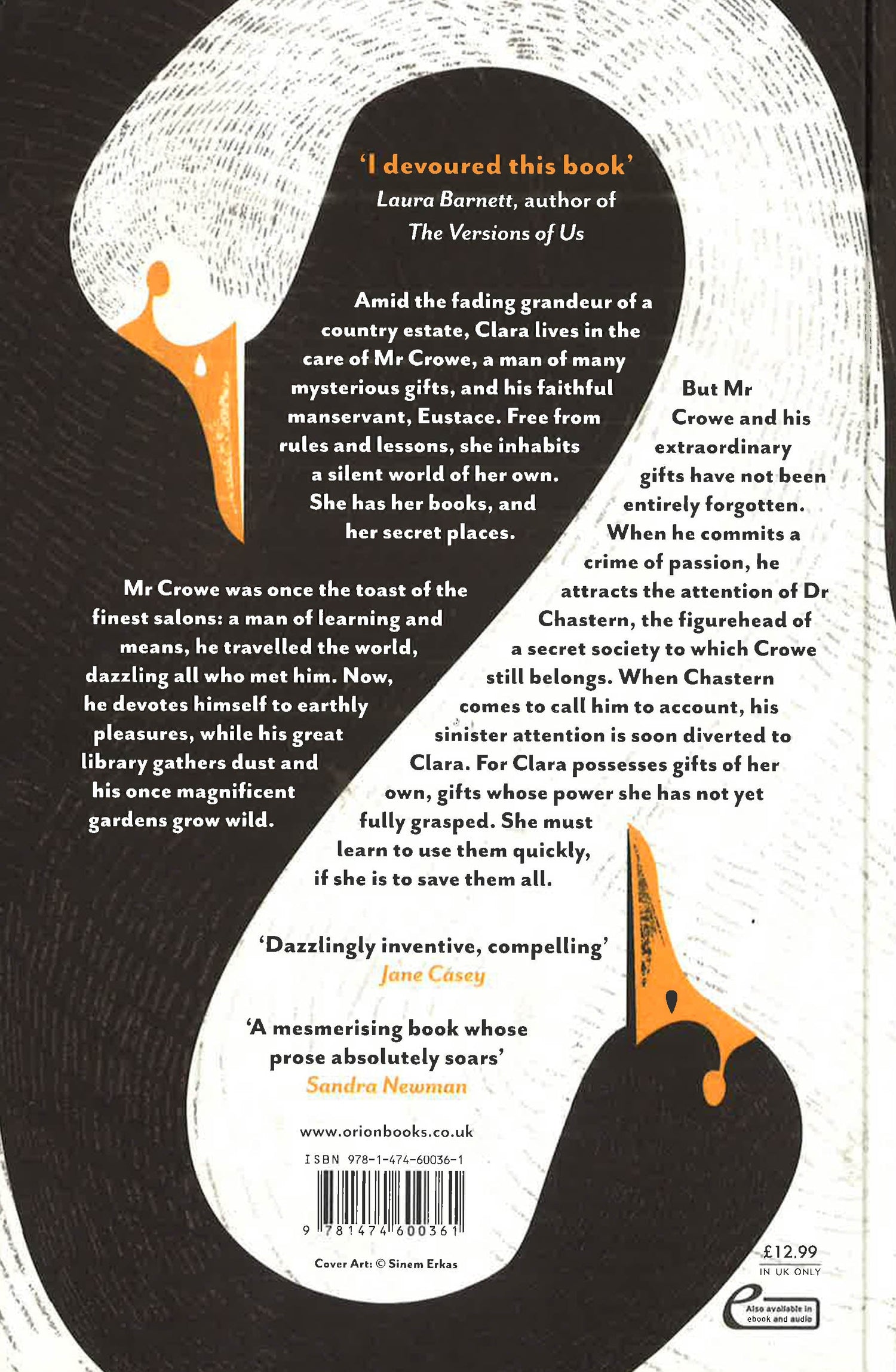 Amid the fading grandeur of a country estate, Clara lives in the care of Mr Crowe, a man of many mysterious gifts, and his faithful manservant, Eustace. Free from rules and lessons, she inhabits a silent world of her own. She has her books, and her secret places. Mr Crowe was once the toast of the finest salons: a man of learning and means, he travelled the world, dazzling all who met him. Now, he devotes himself to earthly pleasures, while his great library gathers dust and his once magnificent gardens grow wild. But Mr Crowe and his extraordinary gifts have not been entirely forgotten. When he commits a crime of passion, he attracts the attention of Dr Chastern, the figurehead of a secret society to which Crowe still belongs. When Chastern comes to call him to account, his sinister attention is soon diverted to Clara. For Clara possesses gifts of her own, gifts whose power she has not yet fully grasped. She must learn to use them quickly, if she is to save them all.