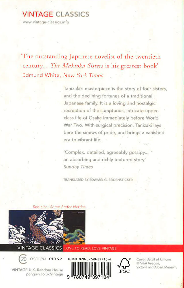 Tanizaki's masterpiece is the story of four sisters, and the declining fortunes of a traditional Japanese family. It is a loving and nostalgic recreation of the sumptuous, intricate upper-class life of Osaka immediately before World War Two. With surgical precision, Tanizaki lays bare the sinews of pride, and brings a vanished era to vibrant life.Tanizaki's masterpiece is the story of four sisters, and the declining fortunes of a traditional Japanese family. It is a loving and nostalgic recreation of the sumptuous, intricate upper-class life of Osaka immediately before World War Two. With surgical precision, Tanizaki lays bare the sinews of pride, and brings a vanished era to vibrant life.