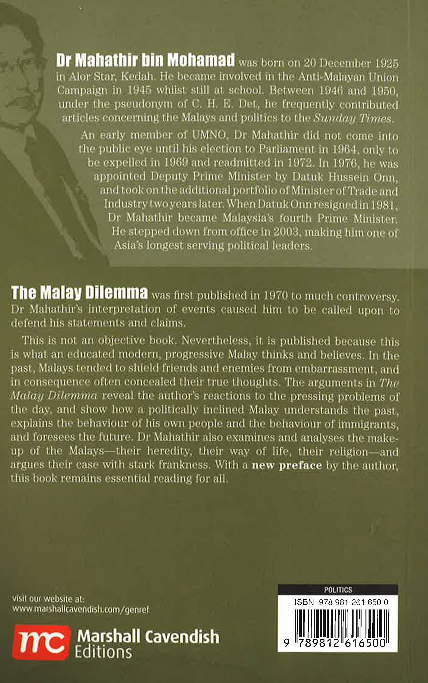 In 'The Malay Dilemma', former prime minister Mahathir bin Mohamad examines and analyses the make-up of the Malays and the problem of racial harmony in Malaysia. The book seeks to explain the causes of the 13 May 1969 riots in Kuala Lumpur.