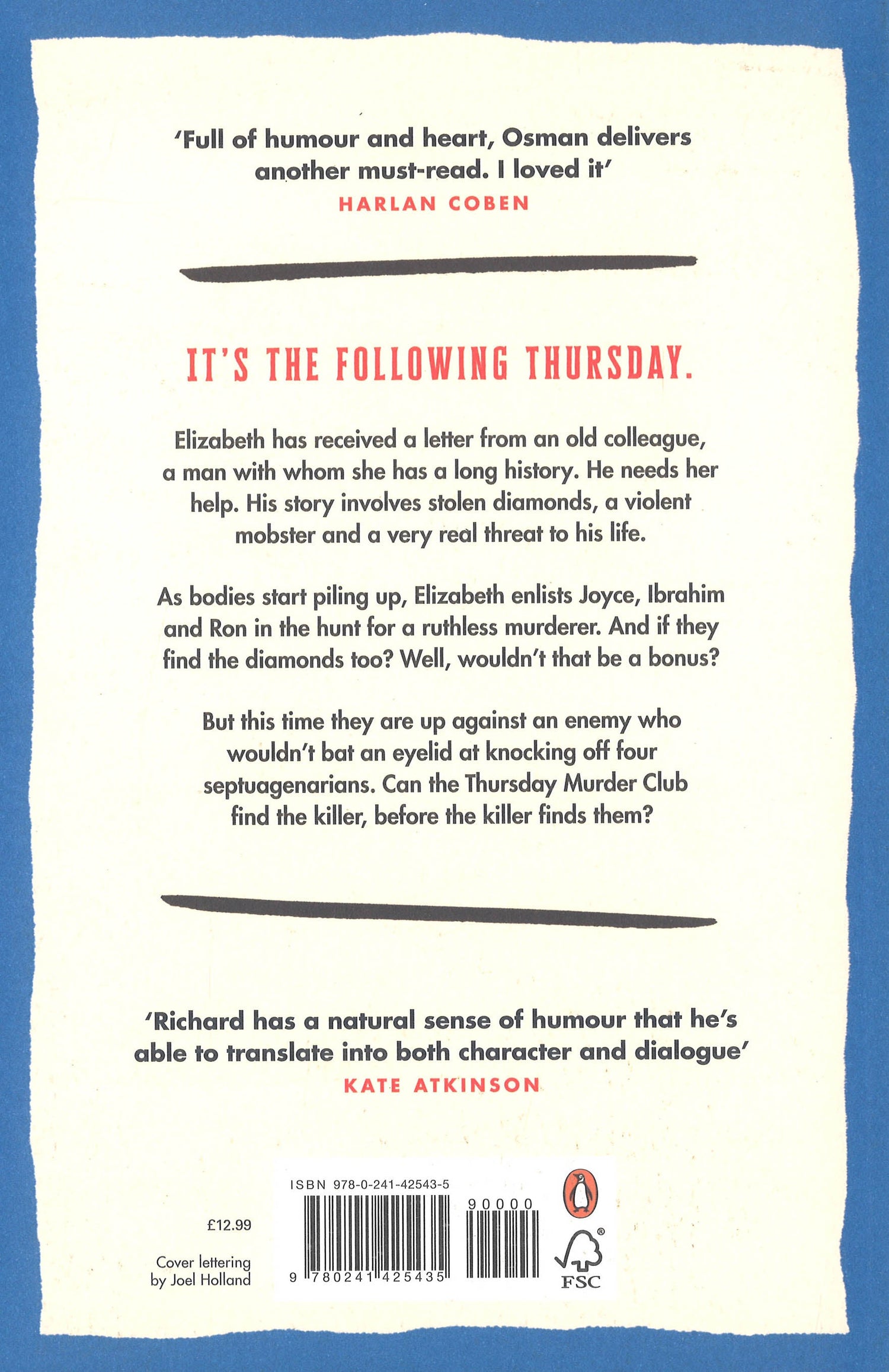 The second novel in the record-breaking, million-copy bestselling Thursday Murder Club series by Richard Osman. It's the following Thursday. Elizabeth has received a letter from an old colleague, a man with whom she has a long history. He's made a mistake, and he needs her help. His story involves stolen diamonds, a violent mobster, and a very real threat to his life. As bodies start pilimg up, Elizabeth enlists Joyce, Ibrahim and Ron in the hunt for a ruthless murderer. And if they find the diamonds too? Well, wouldn't that be a bonus? But this time they are up against an enemy who wouldn't bat an eyelid at knocking off four septuagenarians. Can The Thursday Murder Club find the killer (and the diamonds) before the killer finds them?
