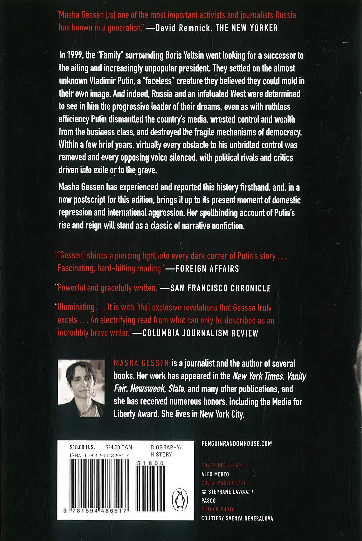 As a journalist living in Moscow, Masha Gessen experienced this history firsthand, and for The Man Without a Face has drawn on information and sources no other writer has tapped. This account of how a "faceless" man maneuvered his way into absolute—and absolutely corrupt—power is the definitive biography of Vladimir Putin.