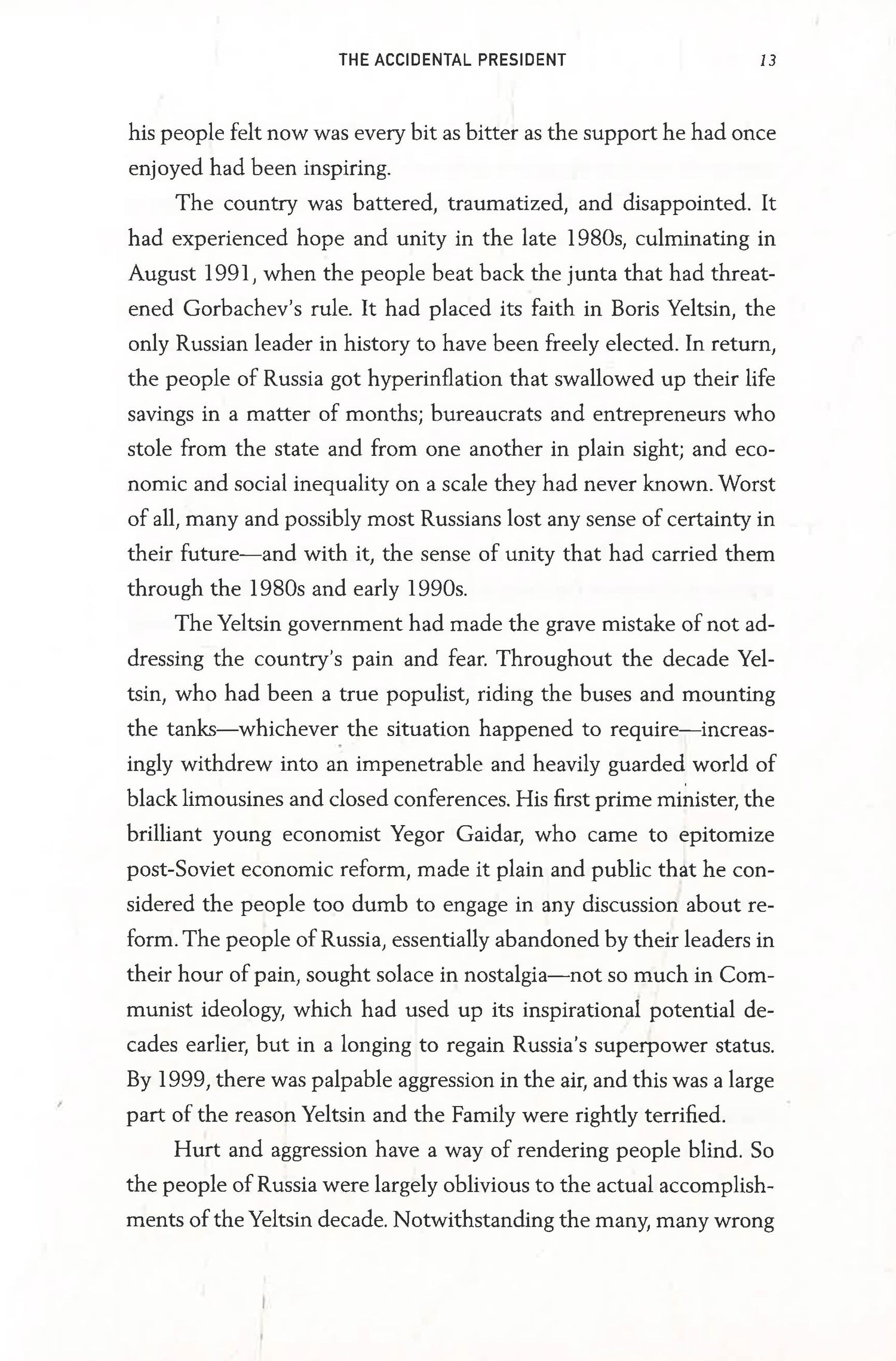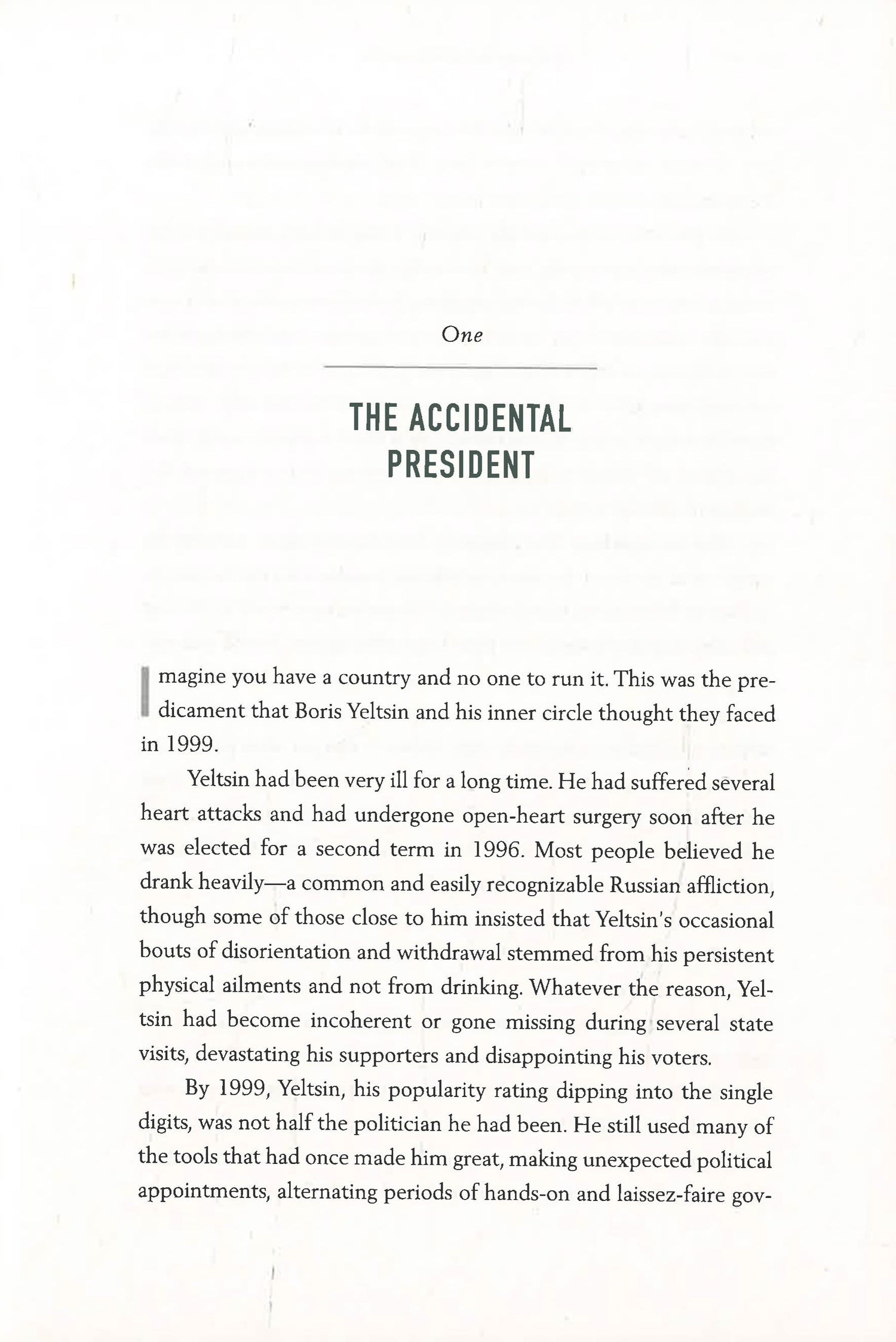 Handpicked as a successor by the "family" surrounding an ailing and increasingly unpopular Boris Yeltsin, Vladimir Putin seemed like a perfect choice for the oligarchy to shape according to its own designs. Suddenly the boy who had stood in the shadows, dreaming of ruling the world, was a public figure, and his popularity soared. Russia and an infatuated West were determined to see the progressive leader of their dreams, even as he seized control of media, sent political rivals and critics into exile or to the grave, and smashed the country's fragile electoral system, concentrating power in the hands of his cronies.