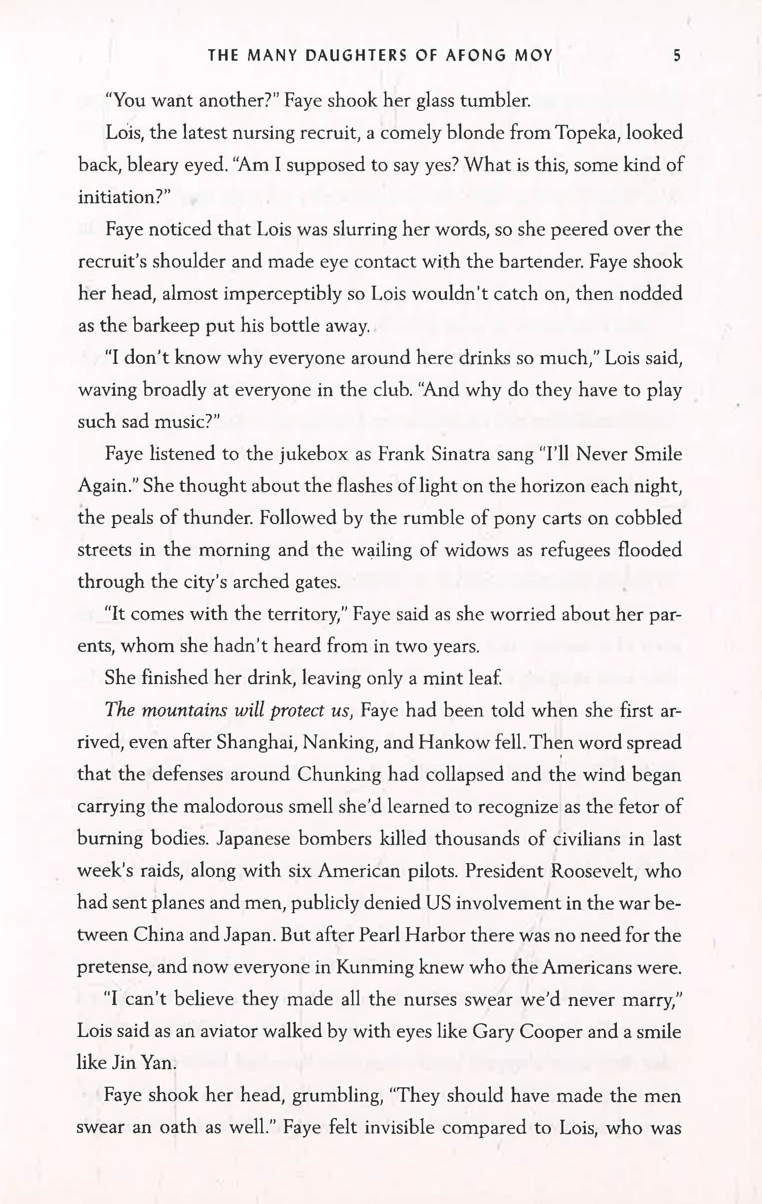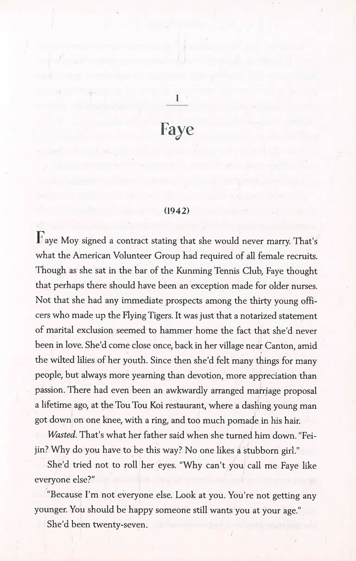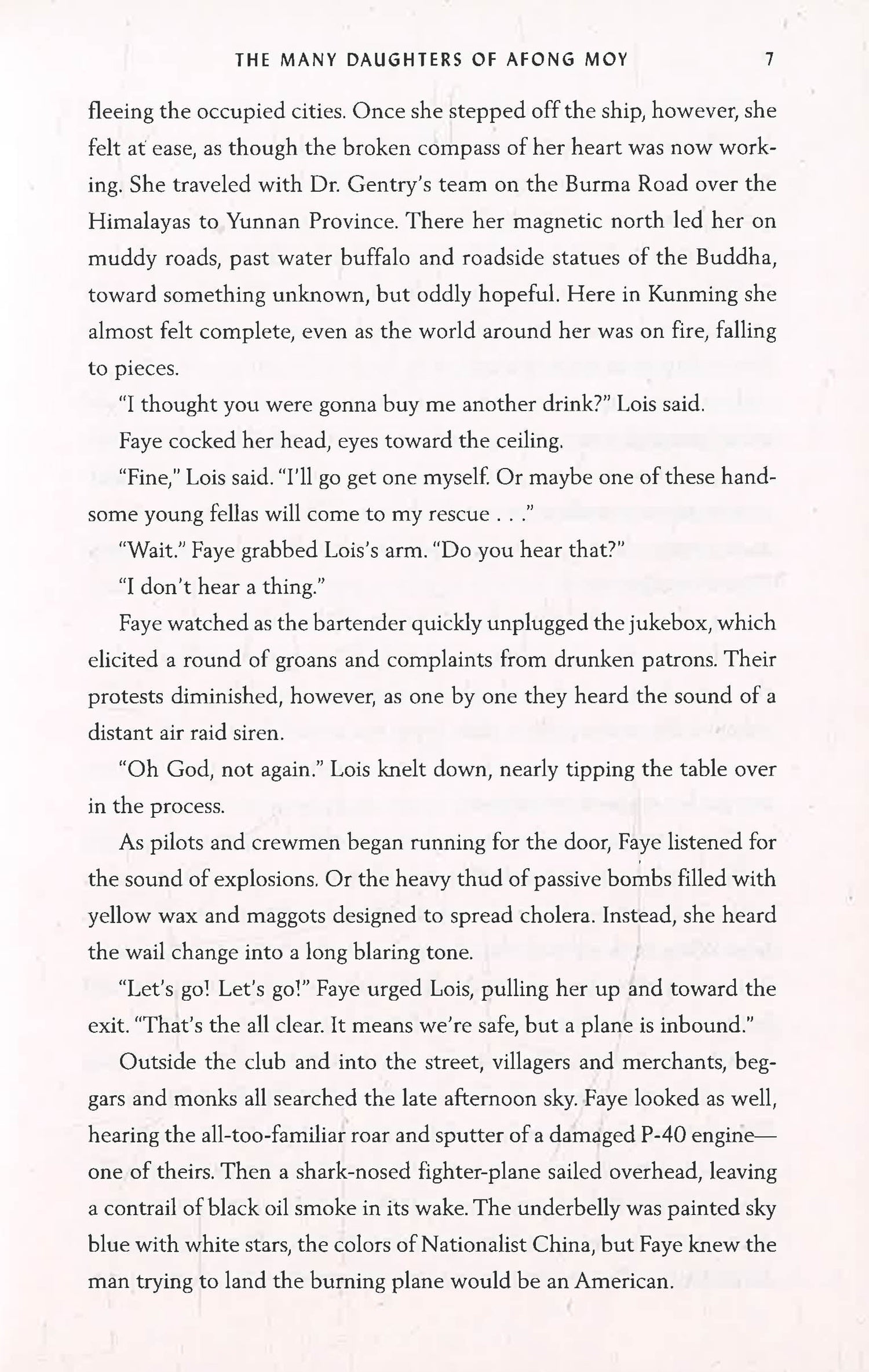 Through an experimental treatment designed to mitigate inherited trauma, Dorothy intimately connects with past generations of women in her family: Faye Moy, a nurse in China serving with the Flying Tigers; Zoe Moy, a student in England at a famous school with no rules; Lai King Moy, a girl quarantined in San Francisco during a plague epidemic; Greta Moy, a tech executive with a unique dating app; and Afong Moy, the first Chinese woman to set foot in America.