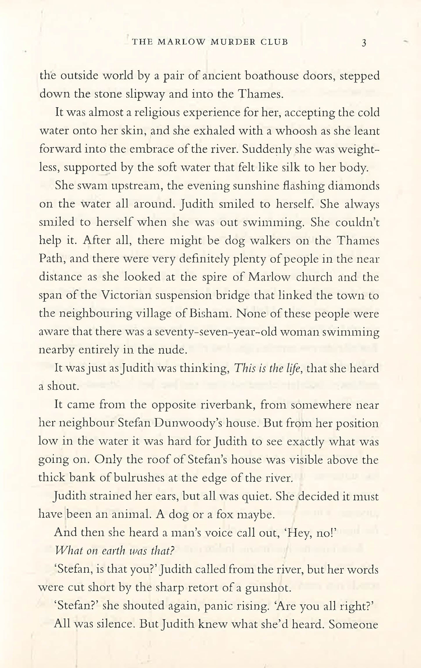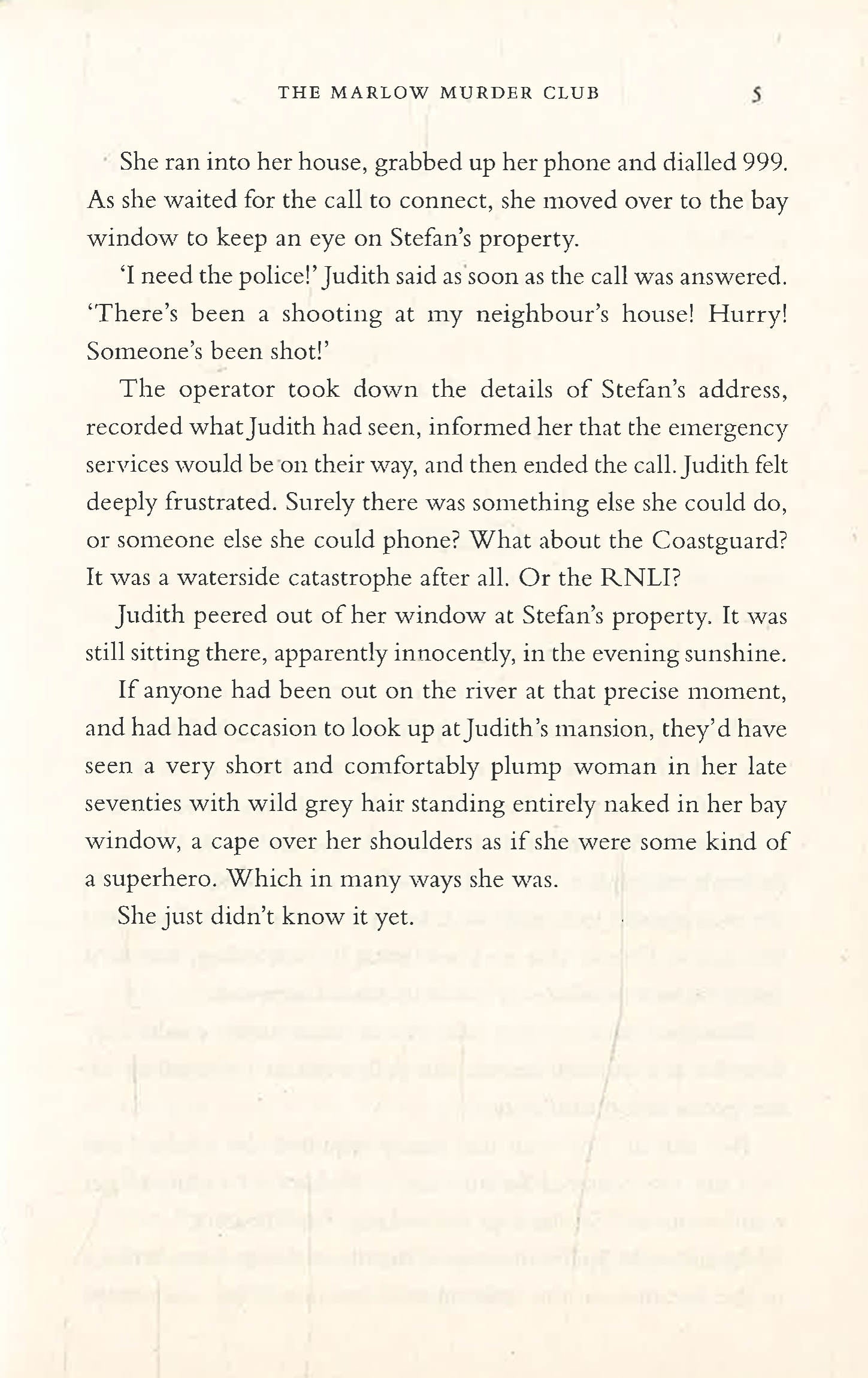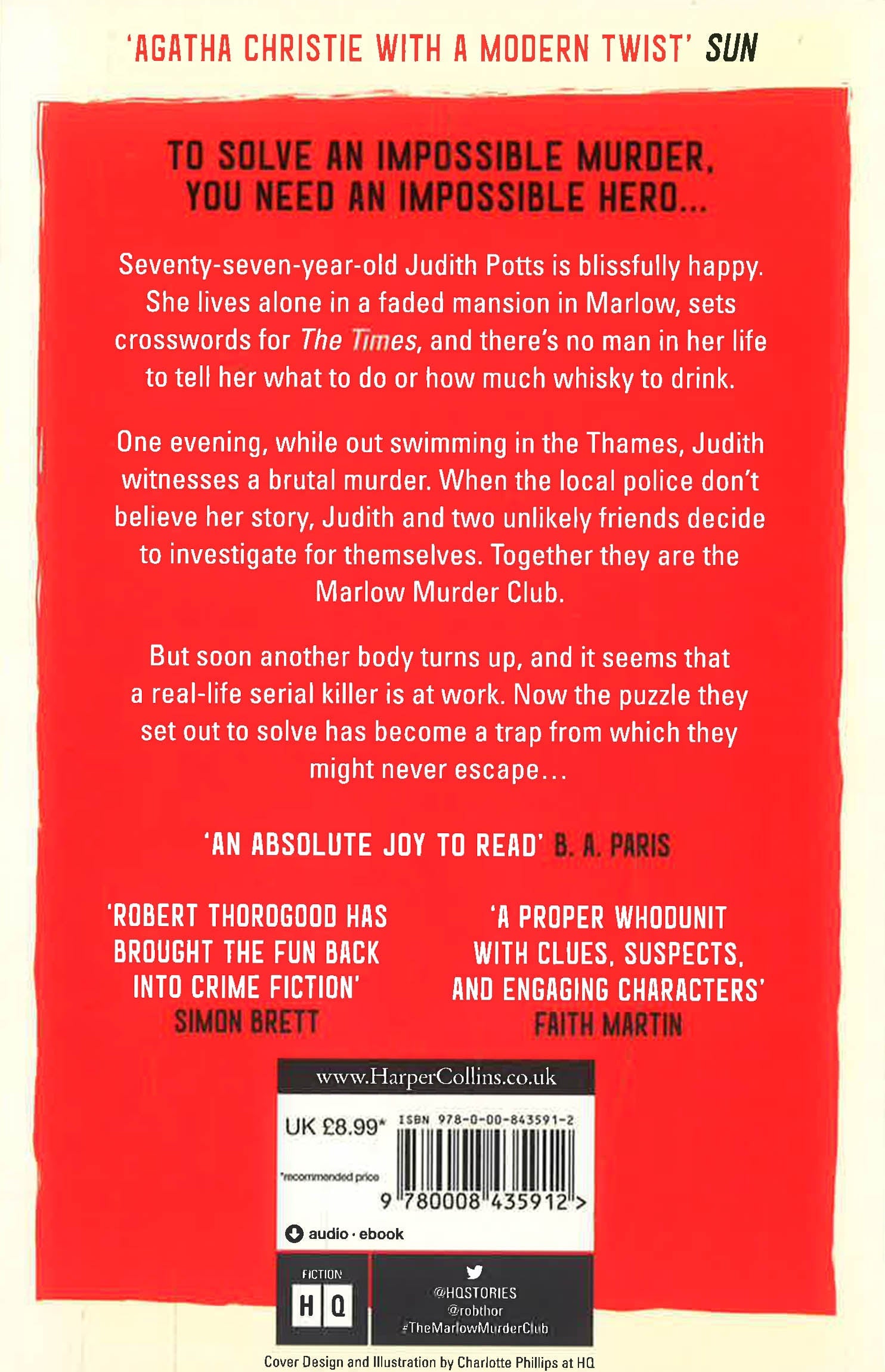 The first in a stunning new series introducing the Marlow Murder Club! 'A hugely enjoyable murder mystery written with wonderful verve, humour and compassion. Utterly delightful' Robert Webb 'Agatha Christie with a modern twist' SUN From the creator of the BBC One hit TV series, Death in Paradise To solve an impossible murder, you need an impossible hero... Seventy-seven-year-old Judith Potts is blissfully happy. She lives alone in a faded mansion in Marlow, sets crosswords for The Times, and there's no man in her life to tell her what to do or how much whisky to drink. One evening, while out swimming in the Thames, Judith witnesses a brutal murder. When the local police don't believe her story, Judith and two unlikely friends decide to investigate for themselves. Together, they are the Marlow Murder Club. But soon another body turns up, and it seems they have a real-life serial killer on their hands. Now the puzzle they set out to solve has become a trap from which they might never escape... READERS LOVE THE MARLOW MURDER CLUB 'Miss Marple with attitude' 5* Amazon Review 'I want to be Judith Potts when I grow up' 5* Amazon Review 'Wonderful escapism!' 5* Amazon Review 'Absolutely loved it!' 5* Amazon Review 'My favourite book of the year!' 5* Amazon Review 'I had an absolute blast reading this book' 5* Amazon Review 'So enjoyable, I laughed out loud !' 5* Amazon Review