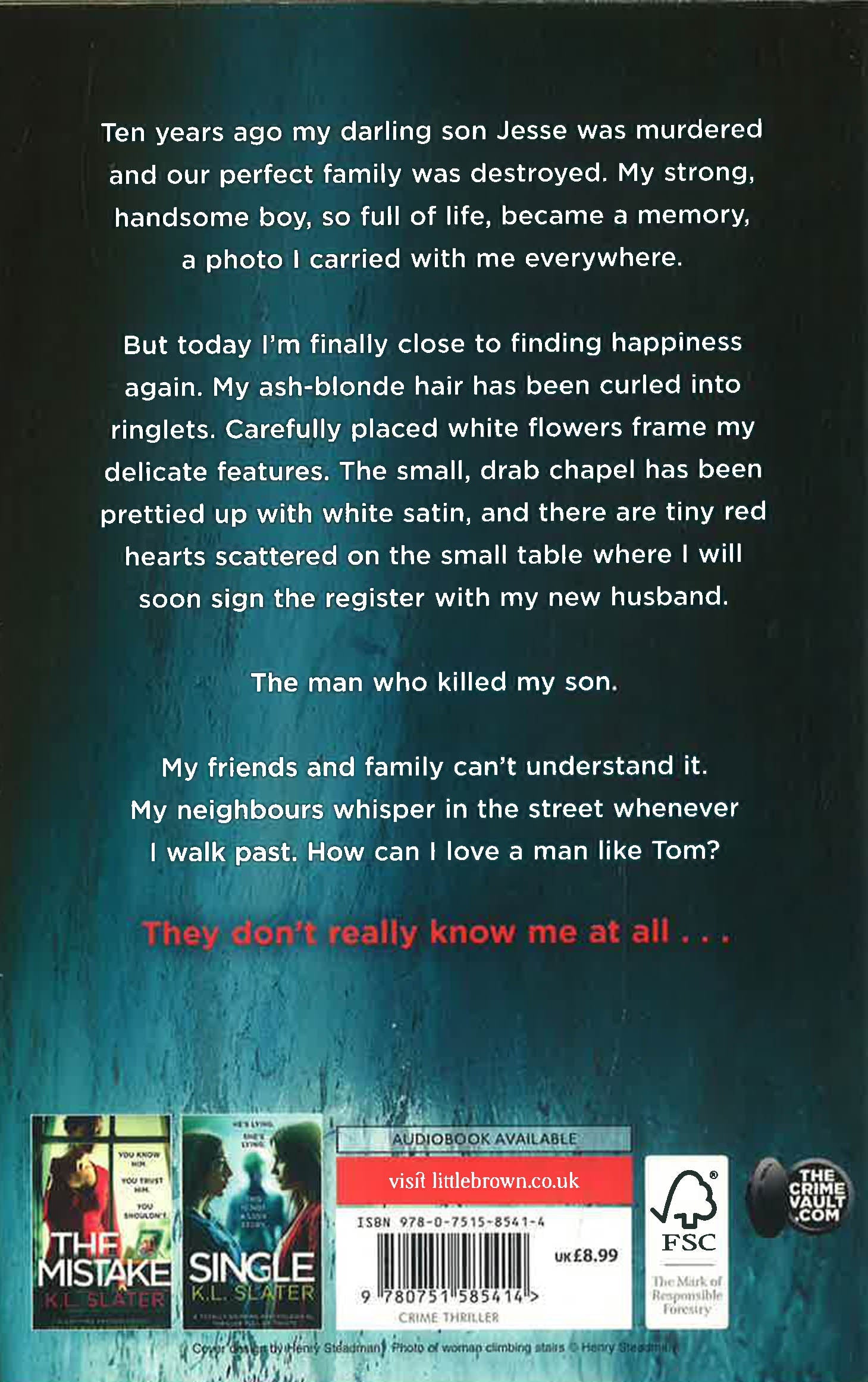 Ten years ago he killed my son. Today I married him.Ten years ago my darling son Jesse was murdered and our perfect family was destroyed. My strong, handsome boy, so full of life, became a memory, a photo I carried with me everywhere.But today I'm finally close to finding happiness again. My ash-blonde hair has been curled into ringlets. Carefully placed white flowers frame my delicate features. The small, drab chapel has been prettied up with white satin, and there are tiny red hearts scattered on the small table where I will soon sign the register with my new husband.The man who killed my son.My friends and family can't understand it. My neighbours whisper in the street whenever I walk past. How can I love a man like Tom?They don't really know me at all...The most unputdownable psychological thriller you'll read this year from the bestselling author K.L. Slater. If you love The Wife Between Us or Gone Girl, you'll be totally hooked on The Marriage.What everyone's saying about The Marriage:'Pulled me in from the very start and did not let go until the final page. Admittedly, I would read a shopping list if it was penned by K.L. Slater, and this latest book exceeded even my highest expectations. Brilliant.' Goodreads reviewer, FIVE STARS'I stayed up almost all night reading this book - an absolute page turner... I will definitely be reading more by this author.' The Written Blurred, FIVE STARS'The Thriller of the Year! K.L. Slater has written a rollercoaster, cold, cunning, calculating, and downright brilliant piece with characters that hop off the page and keep you on your toes... This is one you don't want to pass up. Trust me!' The Secret Book Sleuth, FIVE STARS