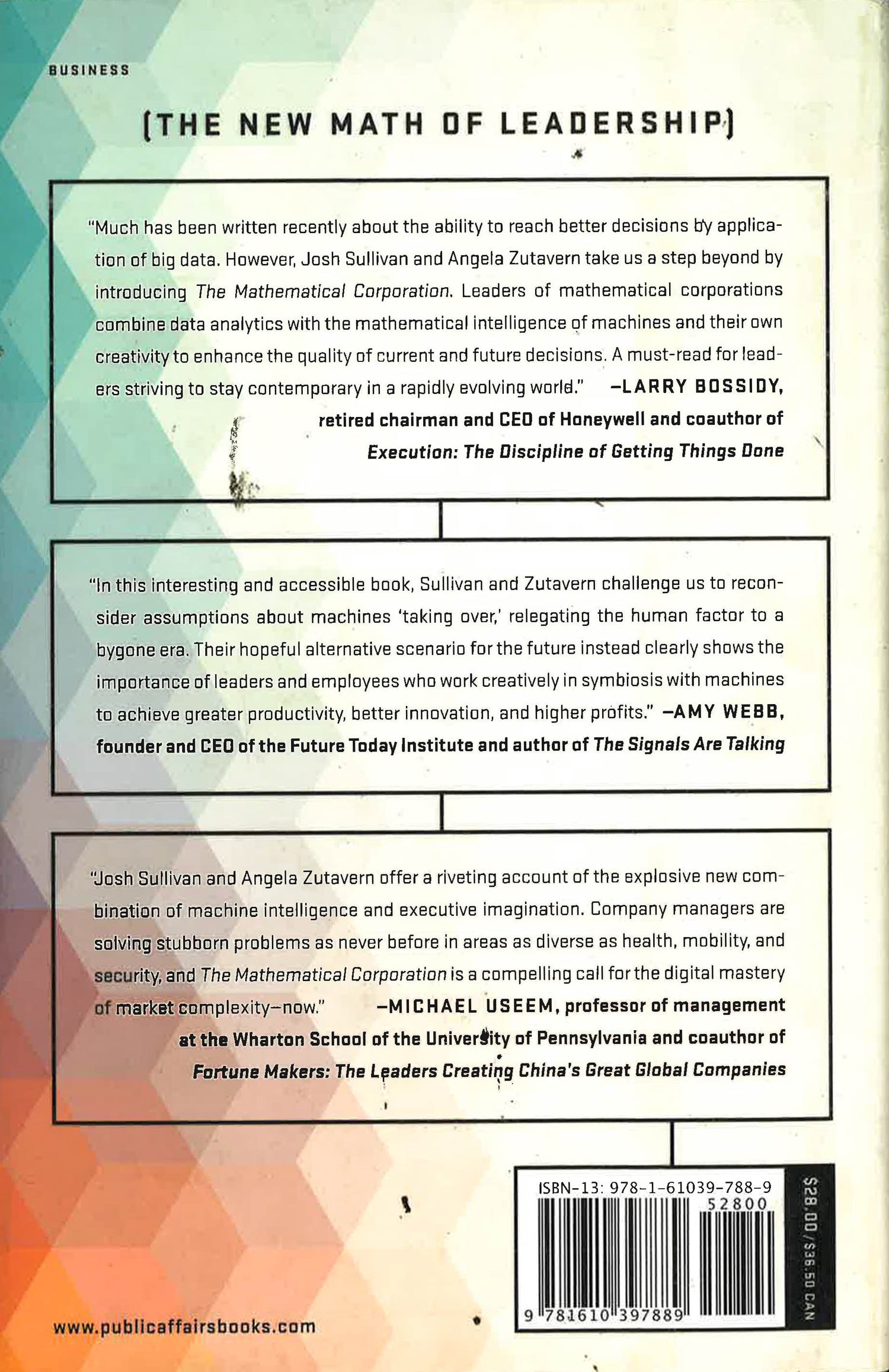 The most powerful weapon in business today is the alliance between the mathematical smarts of machines and the imaginative human intellect of great leaders. Together they make the mathematical corporation, the business model of the future. We are at a once-in-a-decade breaking point similar to the quality revolution of the 1980s and the dawn of the internet age in the 1990s: leaders must transform how they run their organizations, or competitors will bring them crashing to earth--often overnight. Mathematical corporations--the organizations that will master the future--will outcompete high-flying rivals by merging the best of human ingenuity with machine intelligence. While smart machines are weapon number one for organizations, leaders are still the drivers of breakthroughs. Only they can ask crucial questions to capitalize on business opportunities newly discovered in oceans of data. This dynamic combination will make possible the fulfillment of missions that once seemed out of reach, even impossible to attain. Josh Sullivan and Angela Zutavern's extraordinary examples include the entrepreneur who upended preventive health care, the oceanographer who transformed fisheries management, and the pharmaceutical company that used algorithm-driven optimization to boost vaccine yields. Together they offer a profoundly optimistic vision for a dazzling new phase in business, and a playbook for how smart companies can manage the essential combination of human and machine.