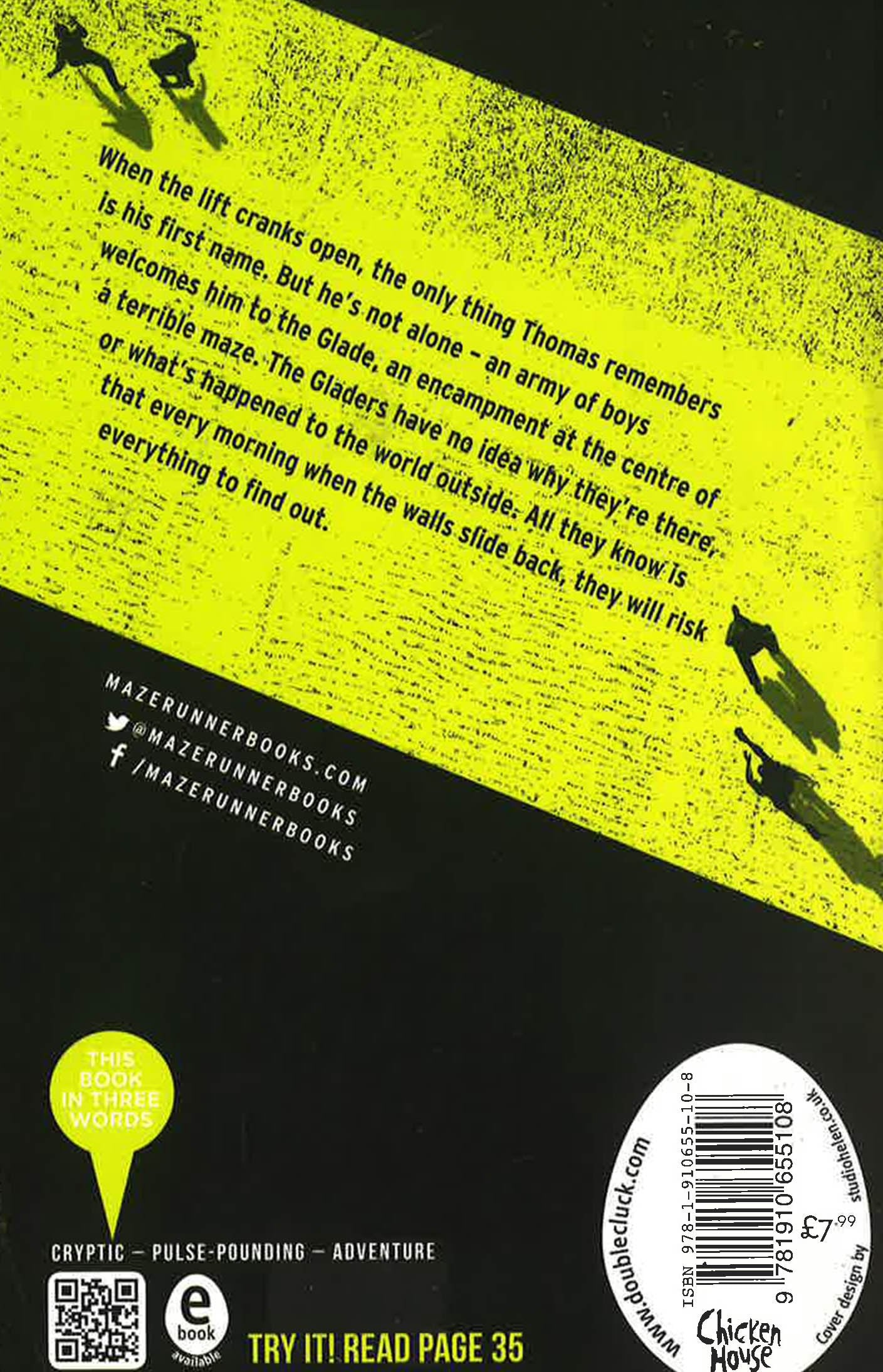 When the doors of the lift crank open, the only thing Thomas remembers is his first name. But he's not alone. He's surrounded by boys who welcome him to the Glade - a walled encampment at the centre of a bizarre and terrible stone maze. Like Thomas, the Gladers don't know why or how they came to be there - or what's happened to the world outside. All they know is that every morning when the walls slide back, they will risk everything - even the Grievers, half-machine, half-animal horror that patrol its corridors, to try and find out.