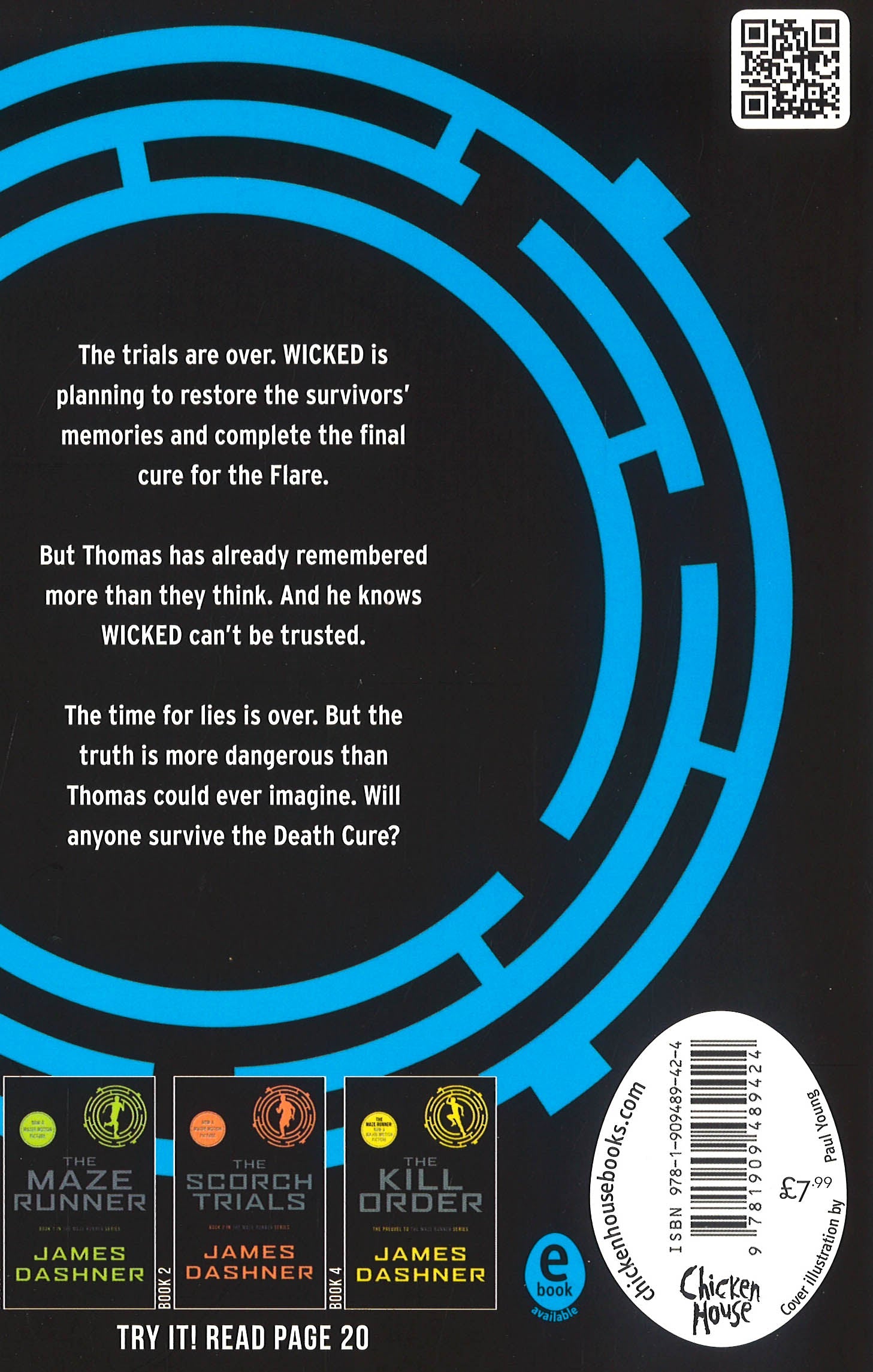 The Trials are over. WICKED have collected all the information they can. Now it's up to the Gladers to complete the blueprint for the cure to the Flare with a final voluntary test. But something has happened that no-one at WICKED has foreseen: Thomas has remembered more than they think. And he knows WICKED can't be trusted ...The time for lies is over. But the truth is more dangerous than anyone could have imagined. With the Gladers divided, can they all make it