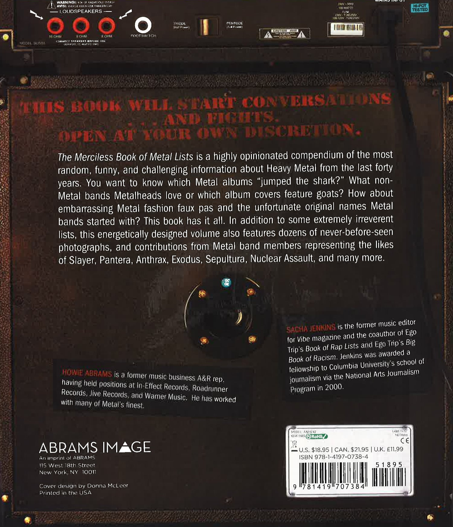 The Merciless Book of Metal Lists is an irreverent and illustrated compendium of the most random, funny, and challenging information about Heavy Metal from the last 40 years. You want to know which Metal albums "jumped the shark? Curious to know what non-Metal bands Metalheads love, which album covers feature goats, embarrassing Metal fashion faux pas, and the unfortunate original names Metal bands started with? This is the book. In addition to some highly opinionated lists, this energetically designed volume features quotes, short essays, iconic four-color photography, and contributions from notable metal personalities, including Eddie Trunk, Gary Holt (Exodus), and Scott Ian (Anthrax, S.O.D.), among others.