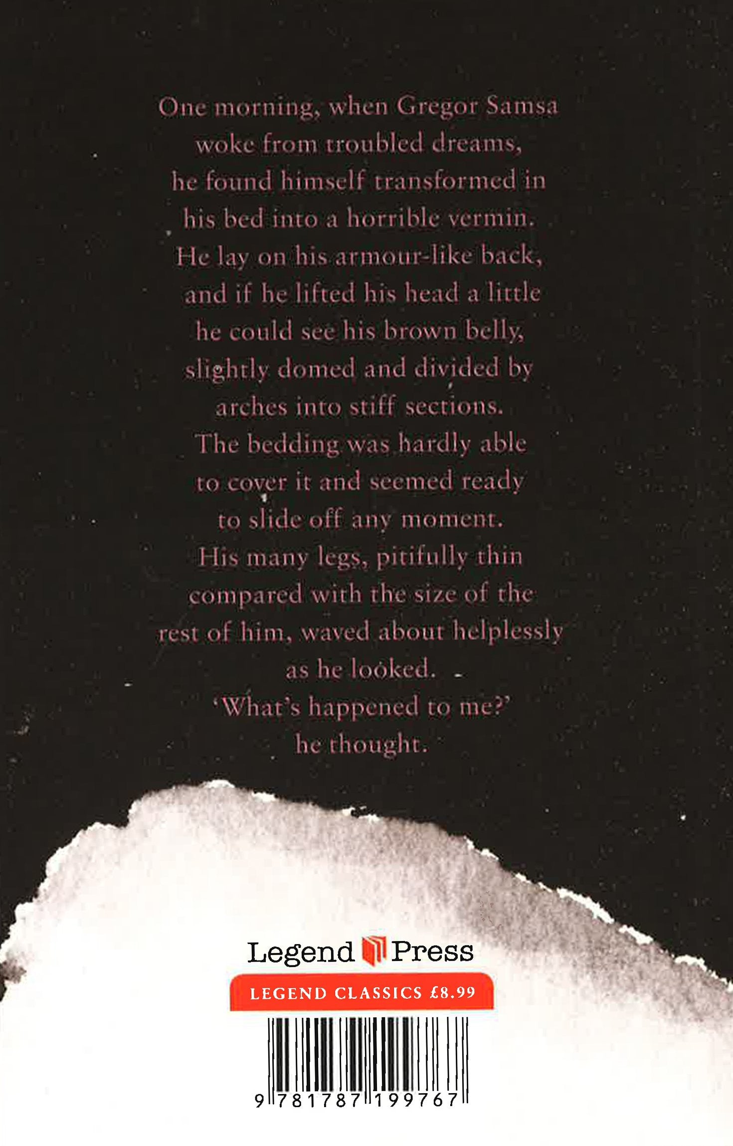 Traveling salesman, Gregor Samsa, wakes to find himself transformed into a large, monstrous insect-like creature. The cause of Gregor's transformation is never revealed, and as he attempts to adjust to his new condition he becomes a burden to his parents and sister, who are repelled by the horrible, verminous creature Gregor has become.