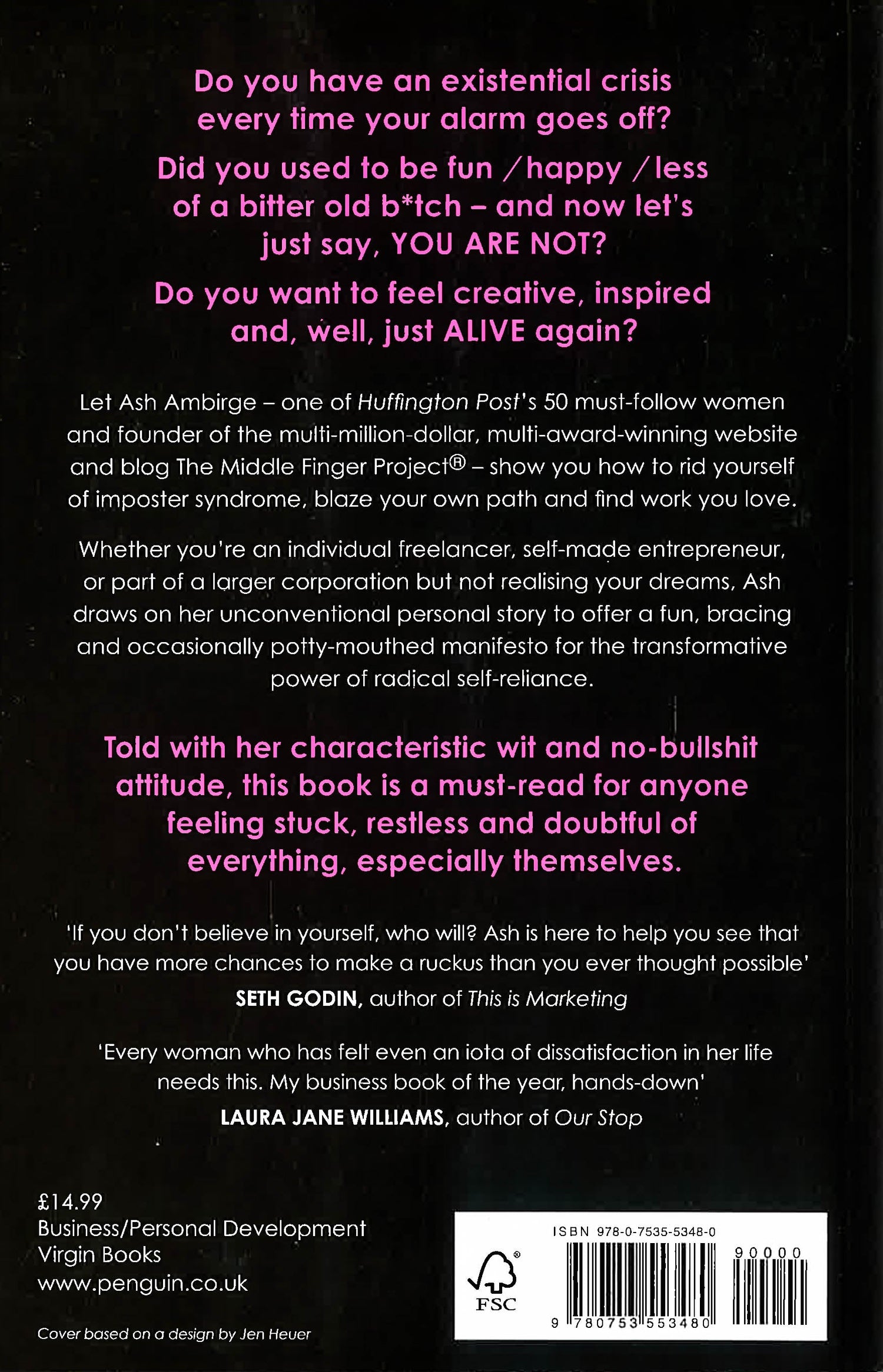 Do you have an existential crisis every time your alarm goes off?Did you used to be fun/effervescent/happy/less of a bitter old b*tch - and now, let's just say, YOU ARE NOT?Do you want to feel creative, inspired and, well, just ALIVE again?Let Ash Ambirge - one of Huffington Post's 50 Must-Follow Women, and founder of the multi-million-dollar, multi-award-winning website and blog The Middle Finger Project - offer you a spunky new alternative to traditional concepts of 'work'.Growing up in a trailer park, by her twenty-first birthday Ash was a jobless, homeless orphan with only $26 to her name. But even with the odds stacked against her, she changed her fortune forever by starting her million-dollar business from the backseat of her car. Ash gave the finger to convention, blazed her own path, and finally found work she loved. And she wants to show you how she did it.Whether you're an individual freelancer, self-made entrepreneur, or part of a larger corporation but not realising your dreams, Ash draws on her unconventional personal story to offer a fun, bracing, and occasionally potty-mouthed manifesto for the transformative power of radical self-reliance. Her paradigm-shifting advice will teach you how to hack your own success, create your own career options, rid yourself of imposter syndrome, and leverage your creativity to make it to the top. Told with her characteristic wit and no-bullshit attitude, this book is a must-read for anyone feeling stuck, restless, and doubtful of everything, especially themselves.