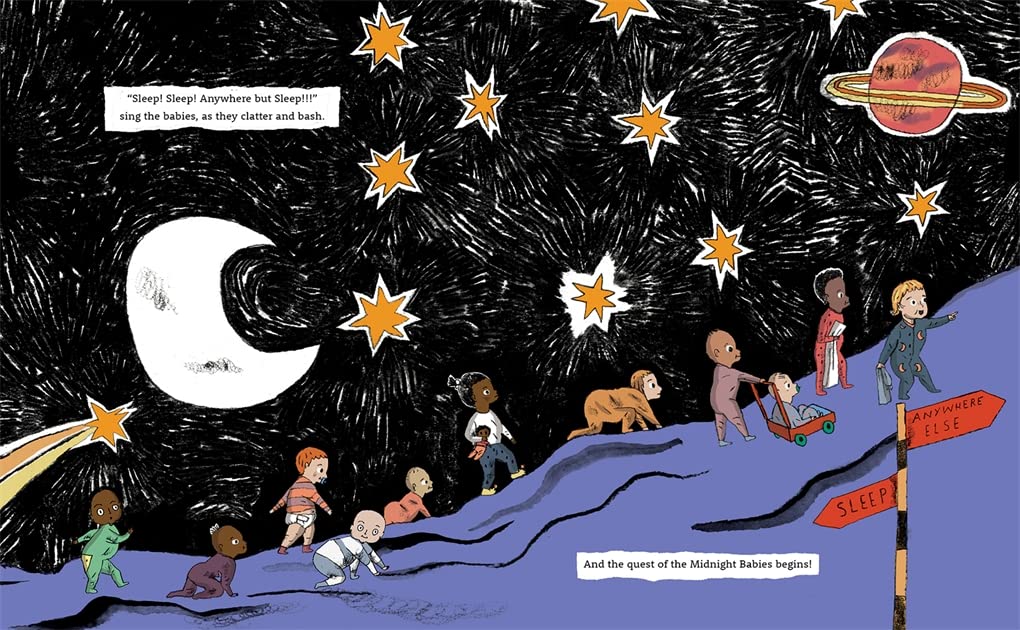 The babies have come from far and wide, crawling and walking and toddling and tumbling. These are the can’t-sleep babies, the won’t-sleep babies, the itchy-feet babies, the just-one-more-story-please babies.“Sleep! Sleep! Anywhere but Sleep!!!” sing the babies. And the quest of the Midnight Babies begins!