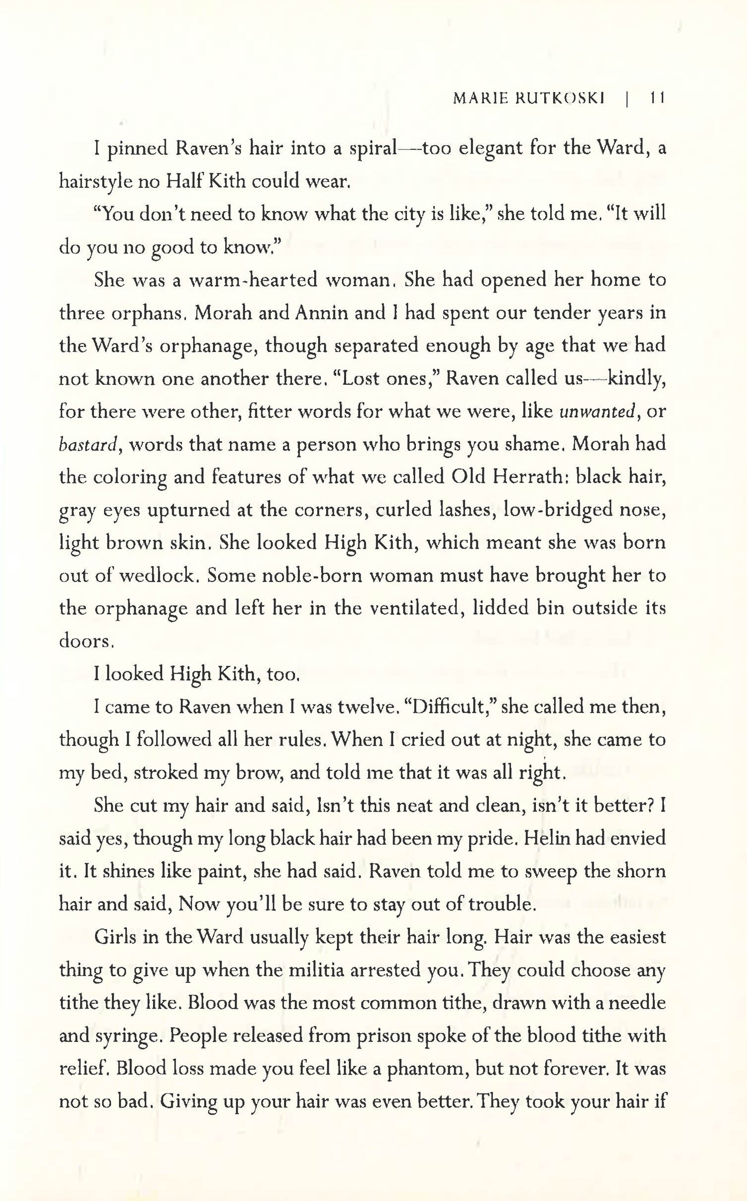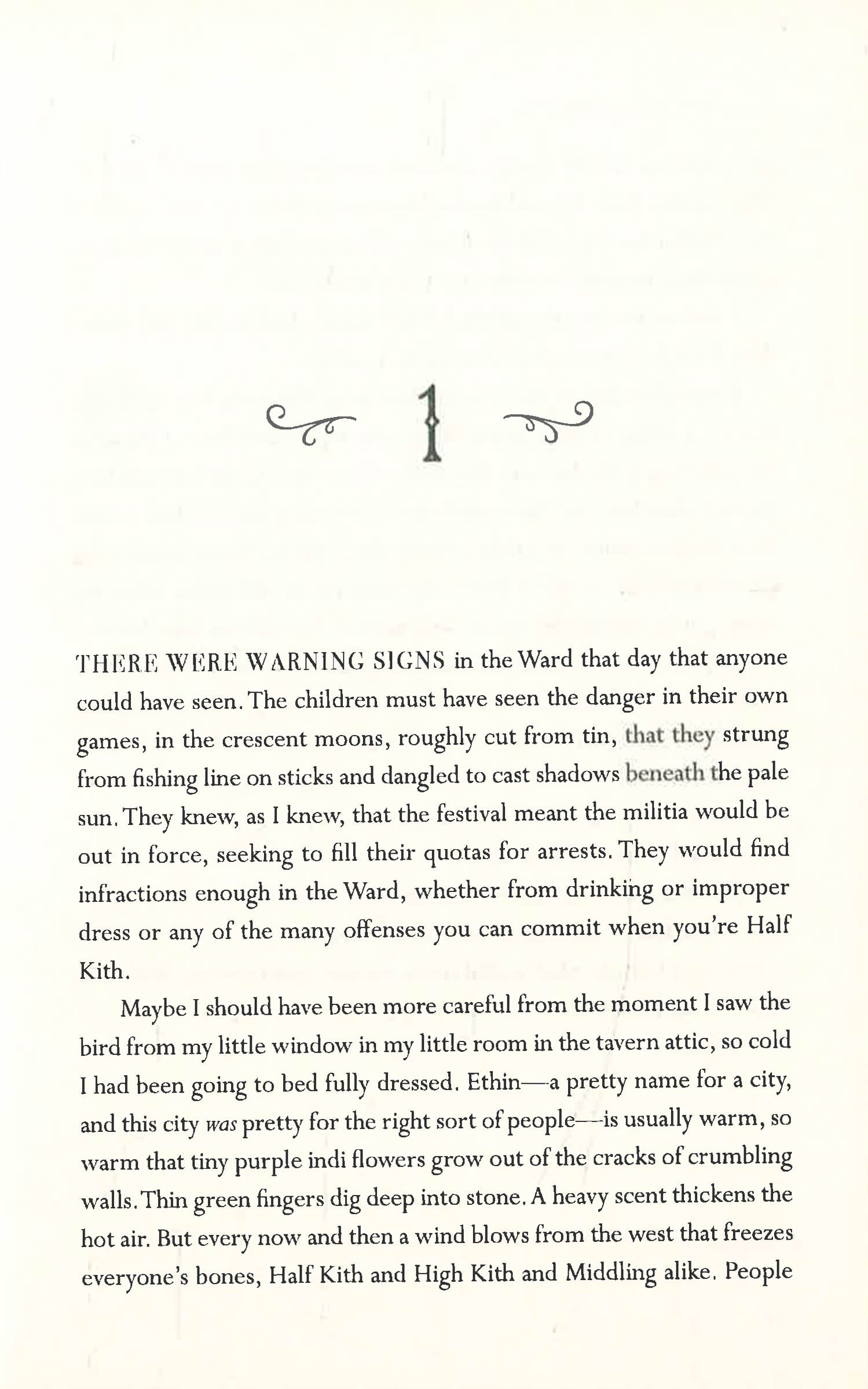 Where Nirrim lives, crime abounds, a harsh tribunal rules, and society's pleasures are reserved for the High Kith. Life in the Ward is grim and punishing. People of her low status are forbidden from sampling sweets or wearing colors. You either follow the rules, or pay a tithe and suffer the consequences.