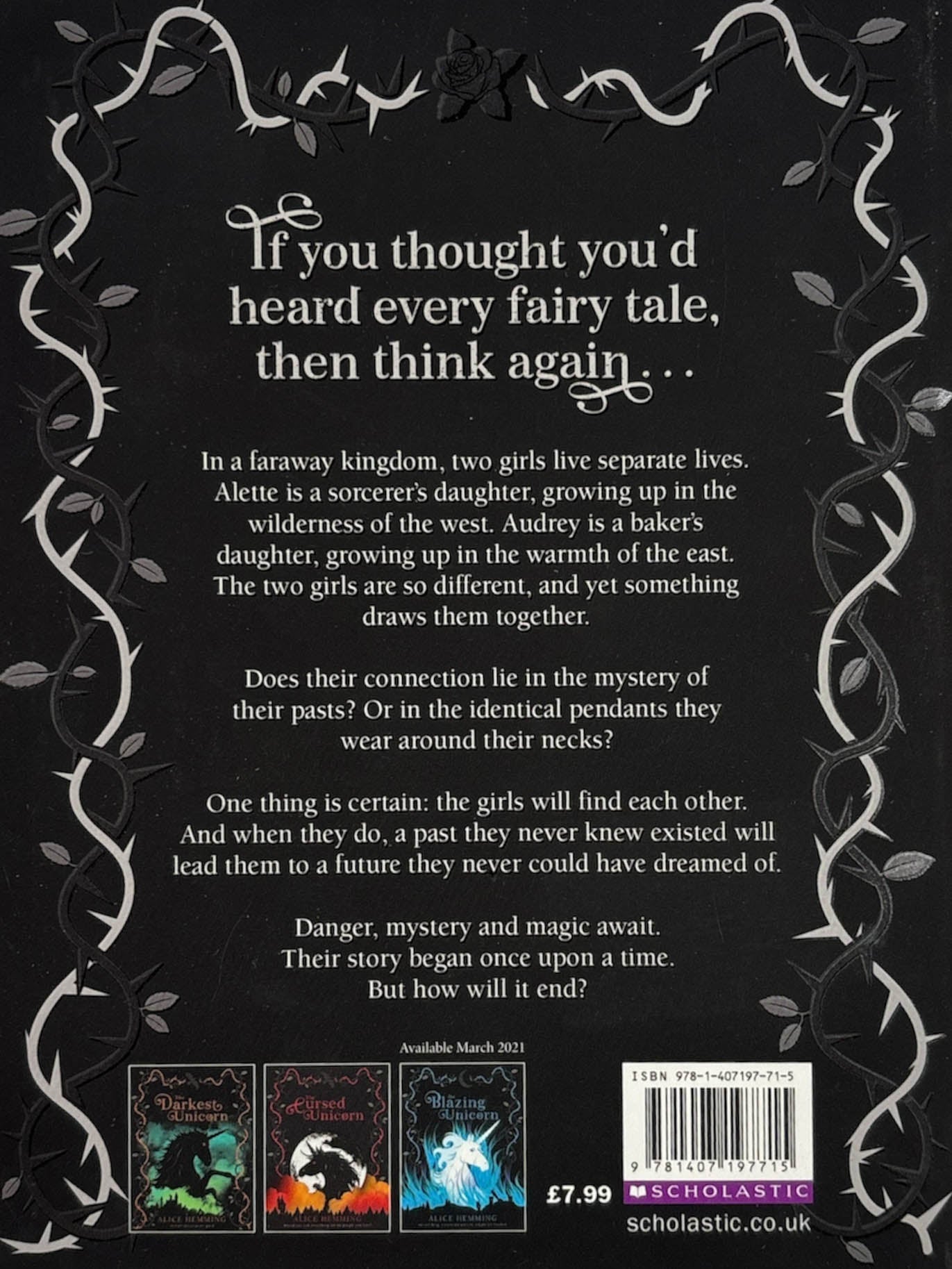 An epic unicorn fairy tale filled with adventure, magic and a fight like no other... In a faraway kingdom, two girls live separate lives. Growing up in the wilderness of the west, Alette is the daughter of a sorcerer. In the warmth of the east, Audrey is the daughter of a baker. The girls could not be more different... and yet something draws them together. Are they connected by the unanswered questions of their pasts? Or by the identical pendants they both wear around their necks? Whatever it is, the girls are on a collision course that cannot be avoided, as a past they never knew they had leaves them hurtling towards a future they could never have dreamed of. Danger, mystery and enchanted unicorns await them. Their story began once upon a time. But how will it end? Enchanting dark fairy tales with magical unicorns, fearsome villains and inspiring heroines Perfect for fans of SKANDAR AND THE UNICORN THIEF Great for people who love fairy tales, Disney and unicorns DARK UNICORNS - COLLECT THEM ALL! The Midnight Unicorn Paperback eBook The Darkest Unicorn Paperback eBook The Cursed Unicorn Paperback eBook The Blazing Unicorn Paperback eBook Coming Soon: The Frozen Unicorn Paperback eBook