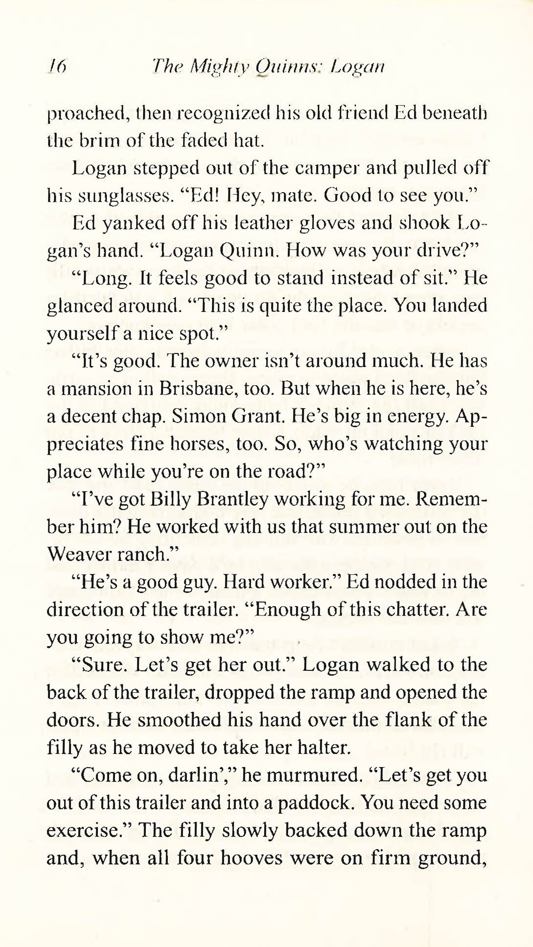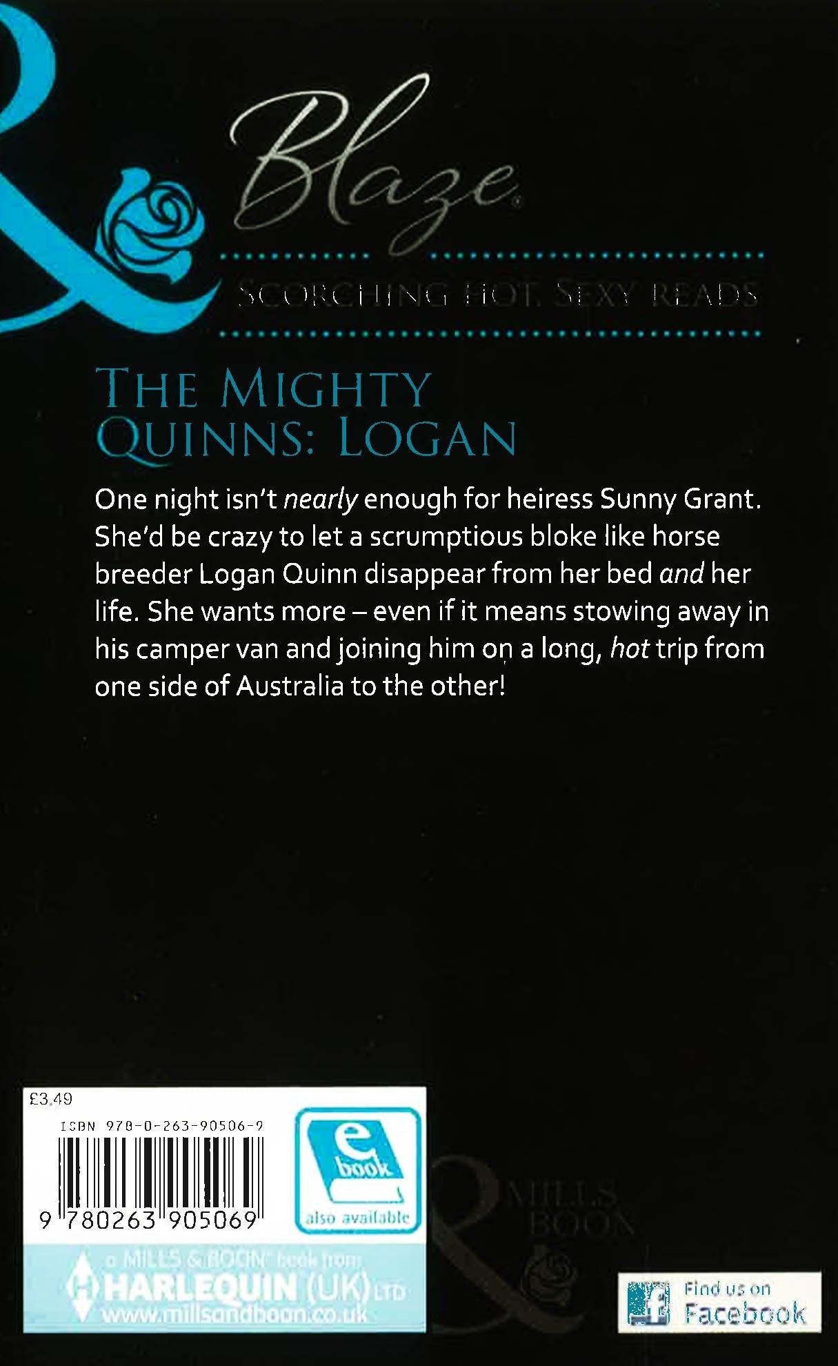 The Mighty Quinns: Logan One night isn't nearly enough for heiress Sunny Grant. She'd be crazy to let a scrumptious bloke like horse breeder Logan Quinn disappear from her bed and her life. She wants more - even if it means stowing away in his camper van and joining him on a long, hot trip from one side of Australia to the other!
