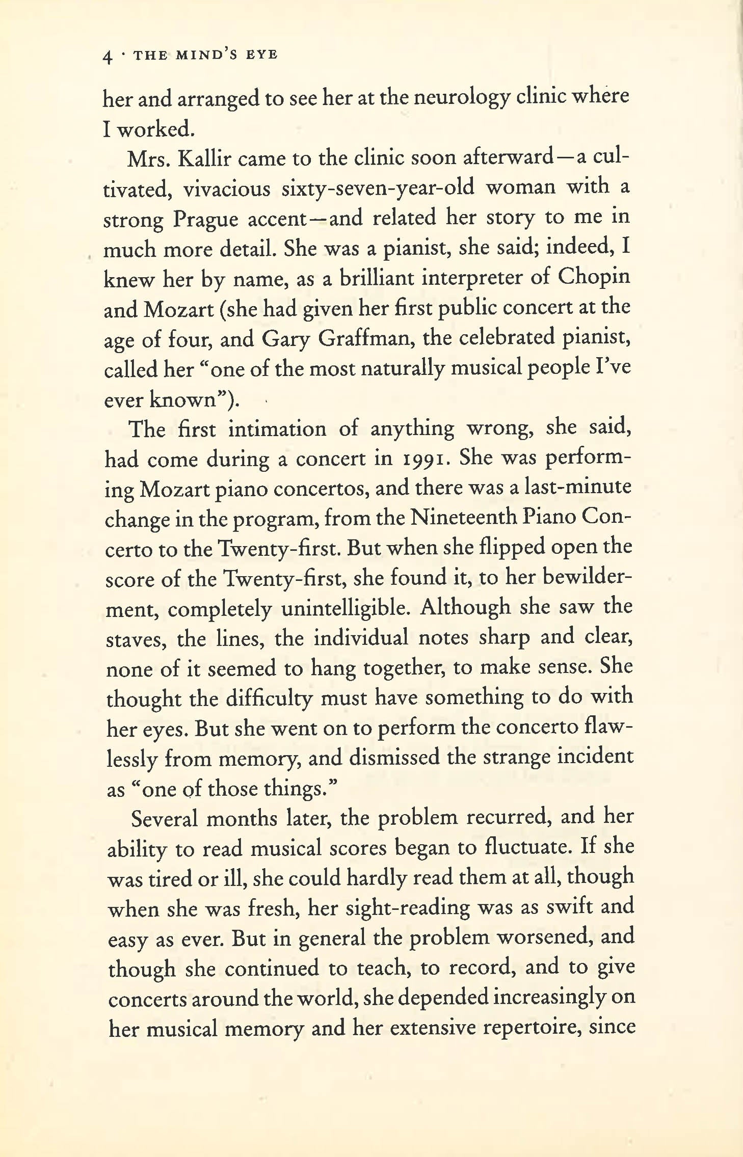 How does the brain perceive and interpret information from the eye? And what happens when the process is disrupted? In The Mind's Eye, Oilver Sacks tells us the stories of people who are able to navigate the world and communicate with others despite losing what many of us consider indispensable senses and abilities: the capacity to recognise faces, the sense of three-dimensional space, the ability to read, the sense of sight. For all these people, the challenge is to adapt to a radically new way of being in the world - and these cases are testament to the myriad ways that we, as humans, are capable of rising to this challenge.