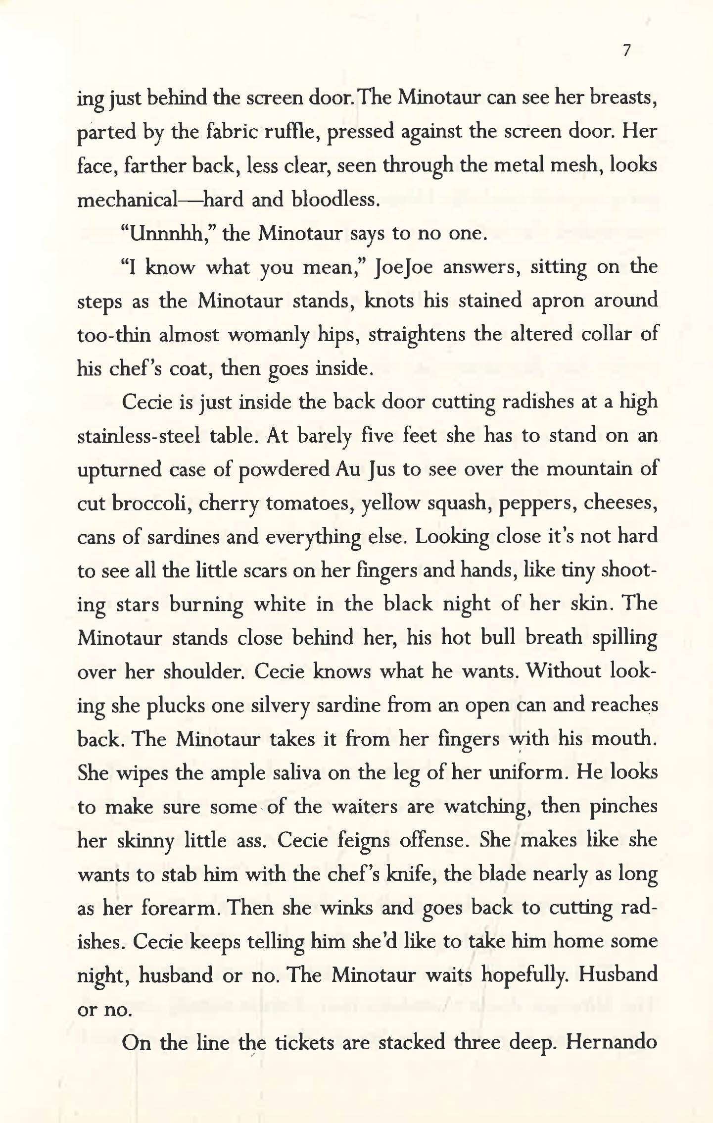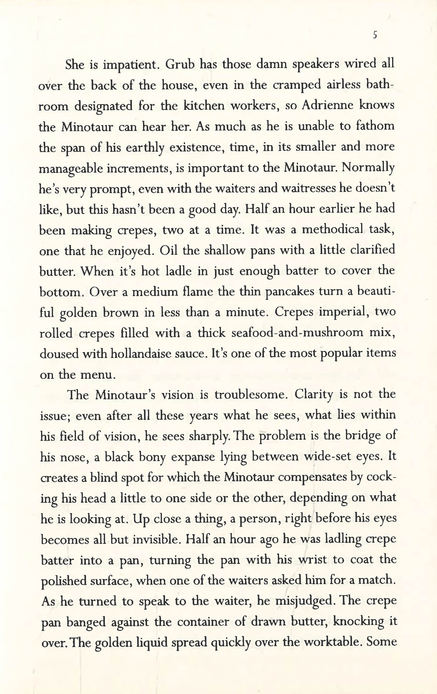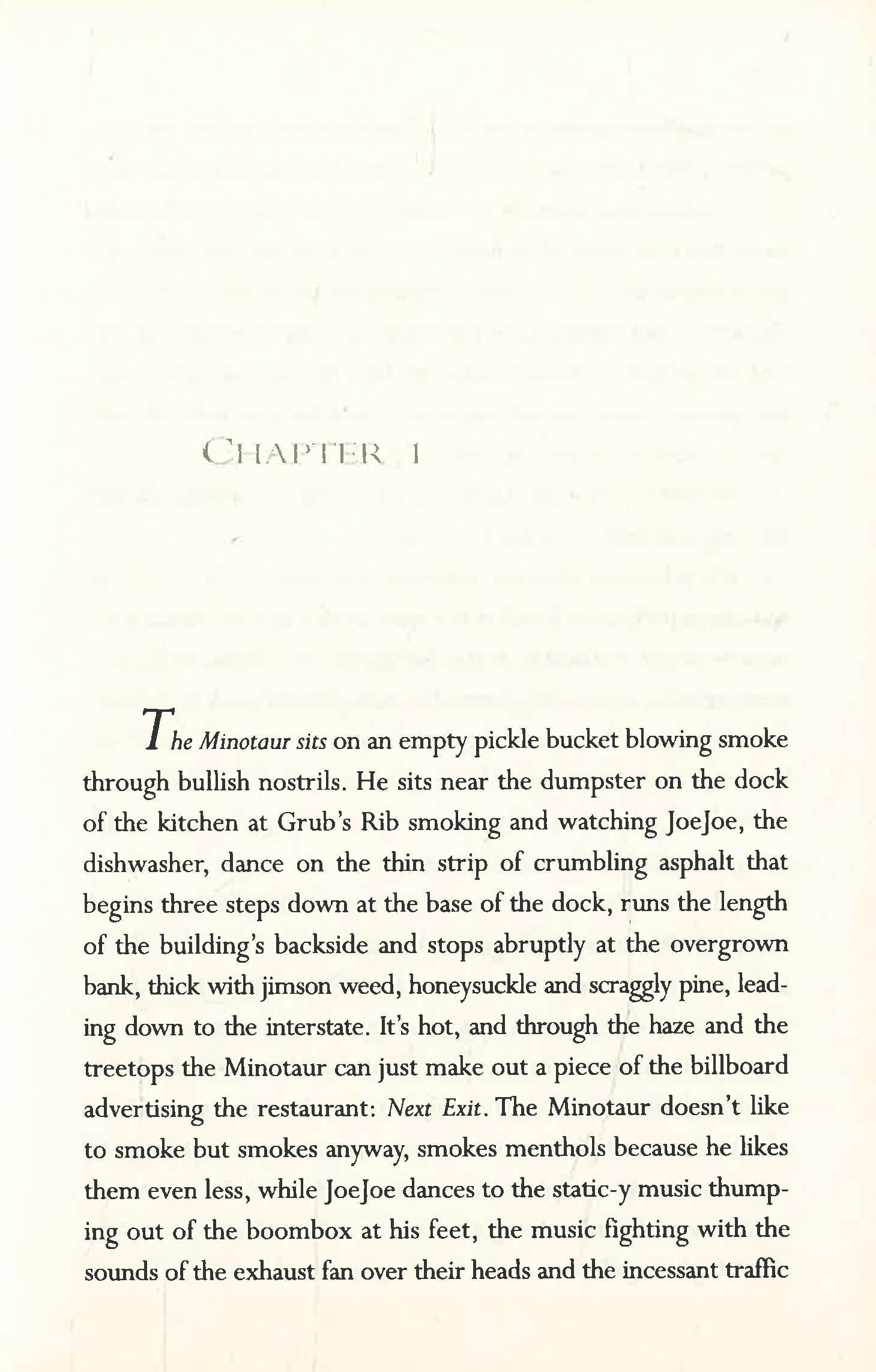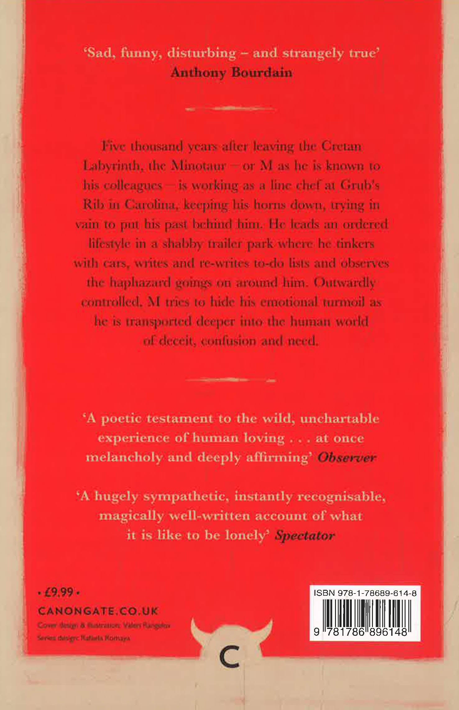 Five thousand years after leaving the Cretan labyrinth, and the Minotaur - or M as he is known to his colleagues - is working as a line chef at Grub's Rib in Carolina, keeping his horns down, trying in vain to put his past behind him. He leads an ordered lifestyle in a shabby trailer park where he tinkers with cars, writes and re-writes to-do lists and observes the haphazard goings on around him. Outwardly controlled, M tries to hide his emotional turmoil as he is transported deeper into the human world of deceit, confusion and need.