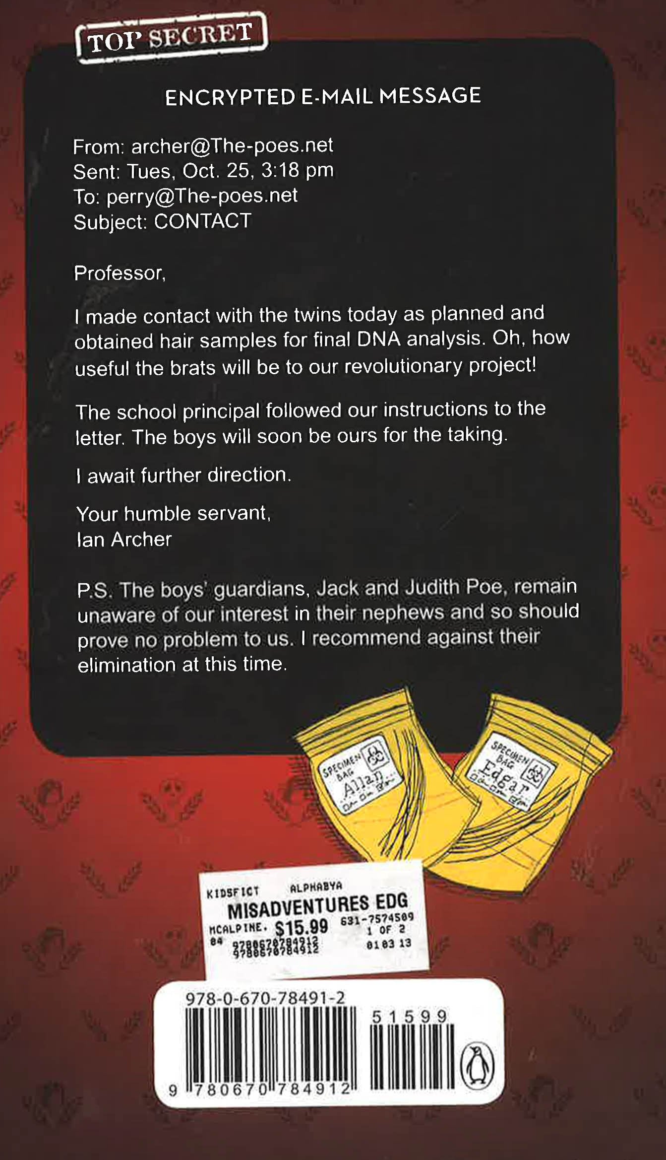 Meet Edgar and Allan Poe -- twelve-year-old identical twins, the great-great-great-great-grandnephews of Edgar Allan Poe. They look and act so much alike that they're almost one mischievous, prank-playing boy in two bodies. When their beloved black cat, Roderick Usher, is kidnapped and transported to the Midwest, Edgar and Allan convince their guardians that it's time for a road trip. Along the way, mayhem and mystery ensue, as well as deeper questions: What is the boys' telepathic connection? Is Edgar Allan Poe himself reaching out to them from the Great Beyond? And why has a mad scientist been spying on the Poe family for years? With a mix of literary humor, mystery, a little quantum physics, and fun extras like fortune cookie messages, letters in code, license plate clues -- and playful illustrations thoughout -- this series opener is a perfect choice for smart, funny tweens who love the Time Warp Trio, Roald Dahl, and Lemony Snicket.