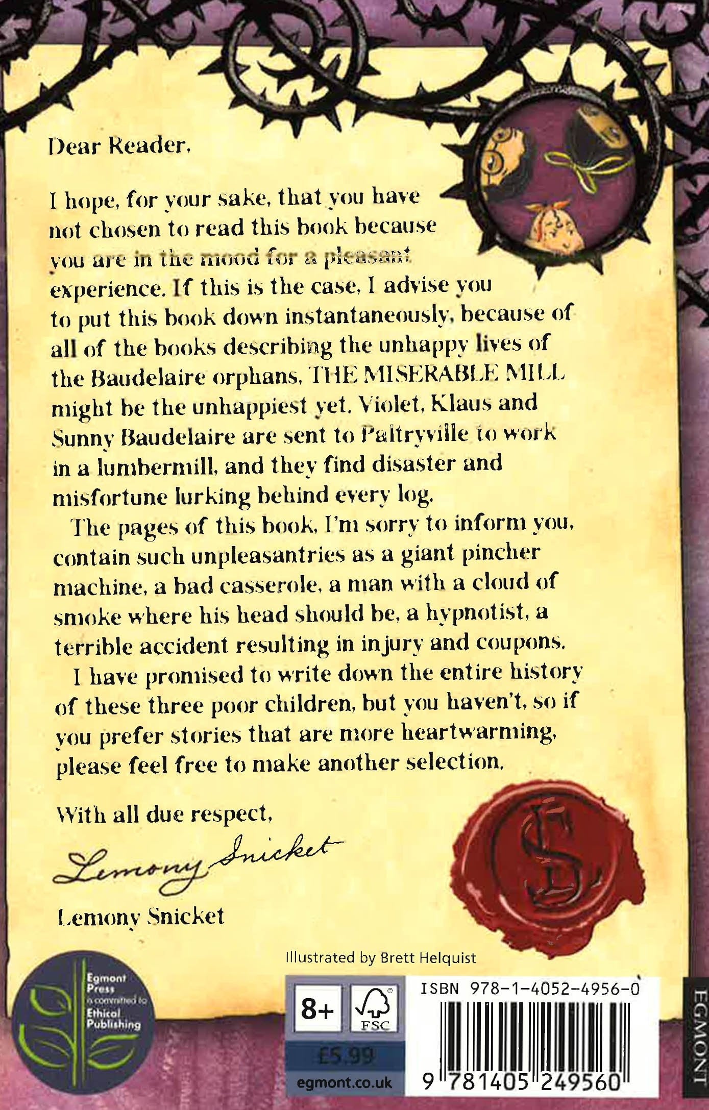 There are many pleasant things to read about, but The Miserable Mill contains none of them. Within its pages one will find a giant pincher machine, a bad casserole, a man with a cloud of smoke where his head should be, a hypnotist, a terrible accident and coupons.